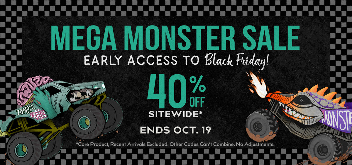 Mega Monster Sale: Excludes Christmas, Core & Recent Arrivals, Gift Cards. Discount off lowest marked price. Cannot combine discount codes. No price adjustments.
