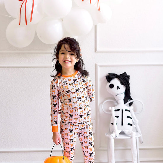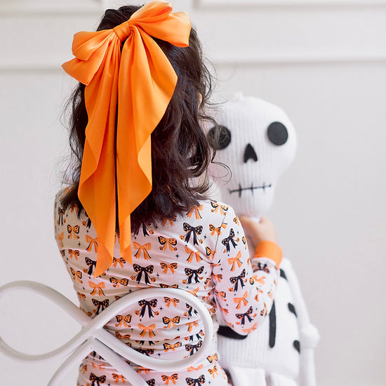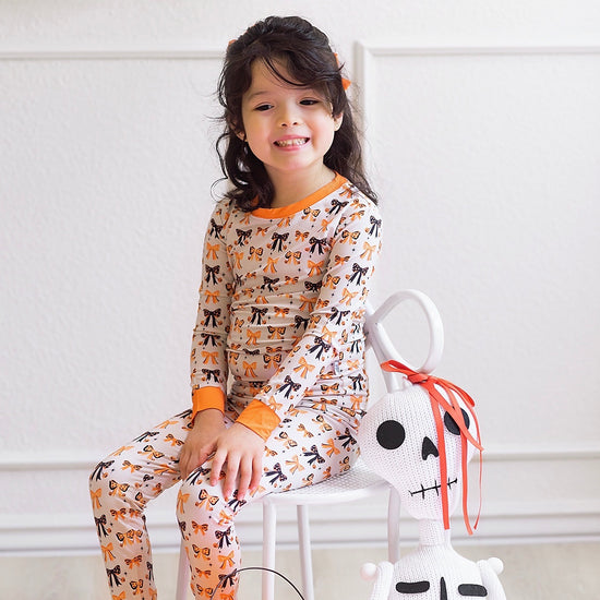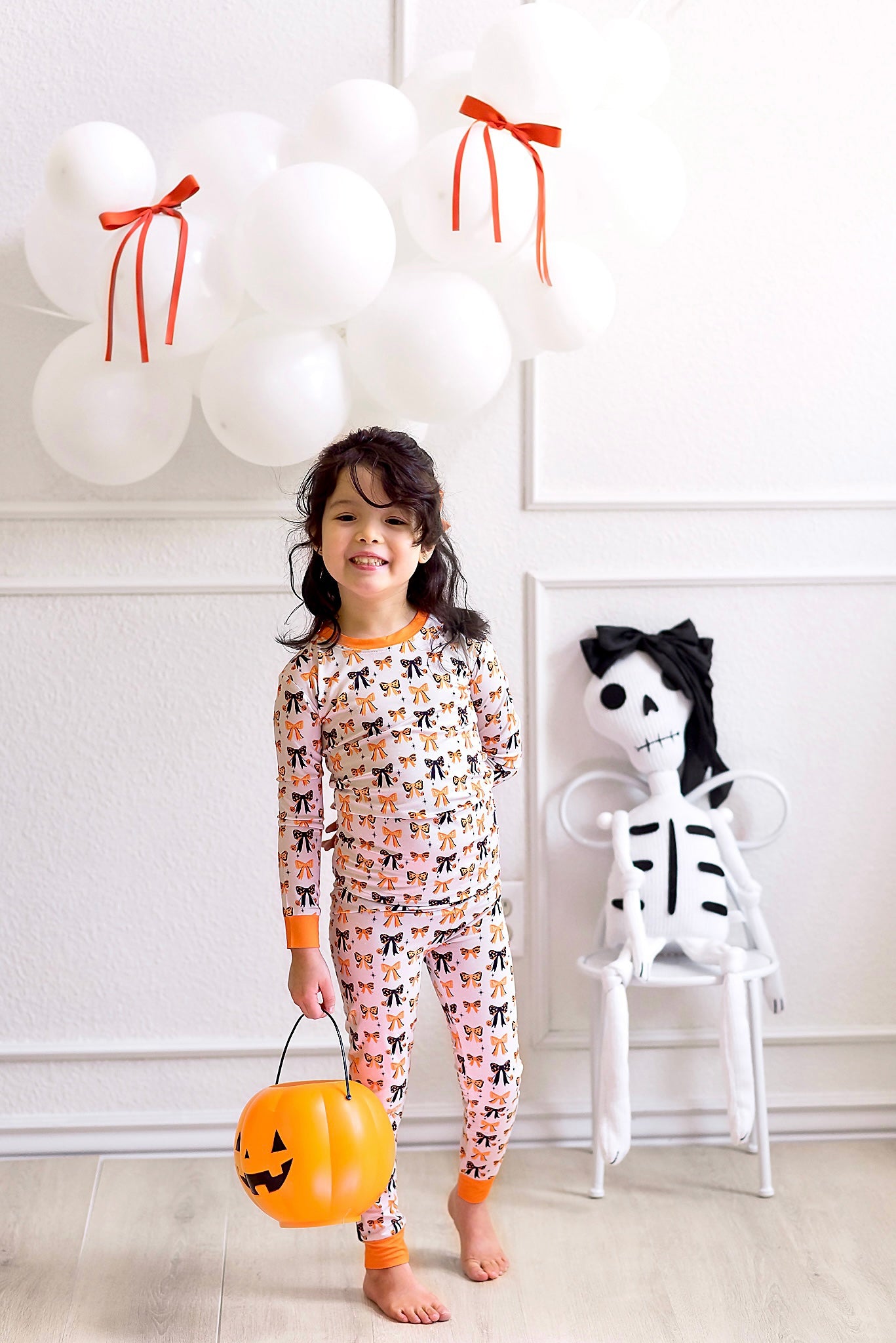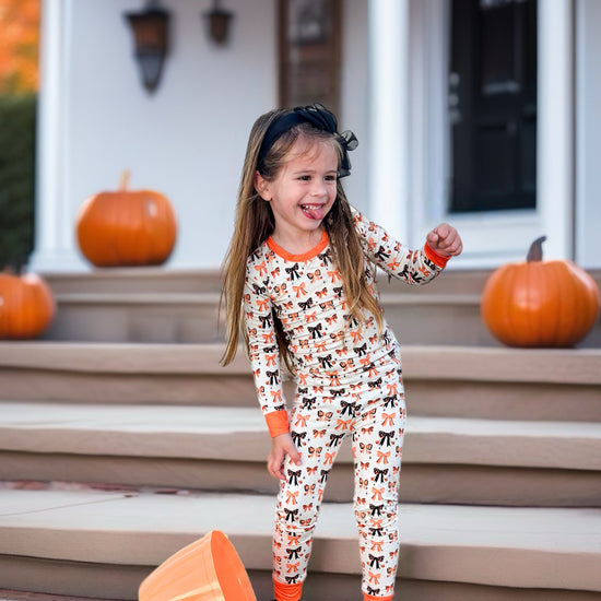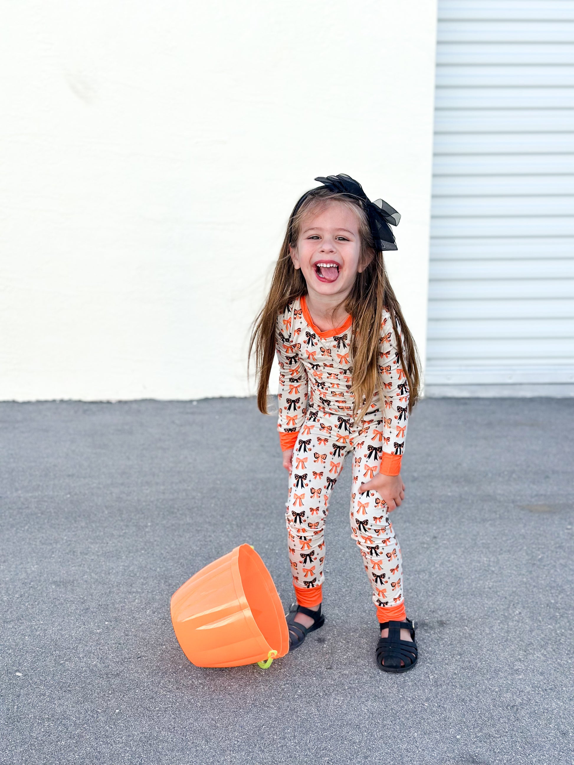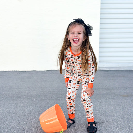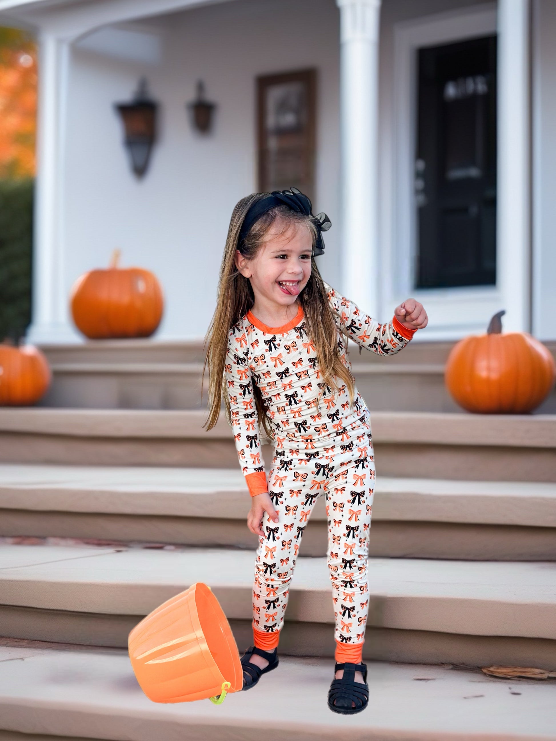 Feeling adorable and spooky? Get sweet on this Halloween print that features candy corn, bat and pumpkin bows! It's the perfect mix of sweet and spooky for your little ghouls that loves to trick or treat.