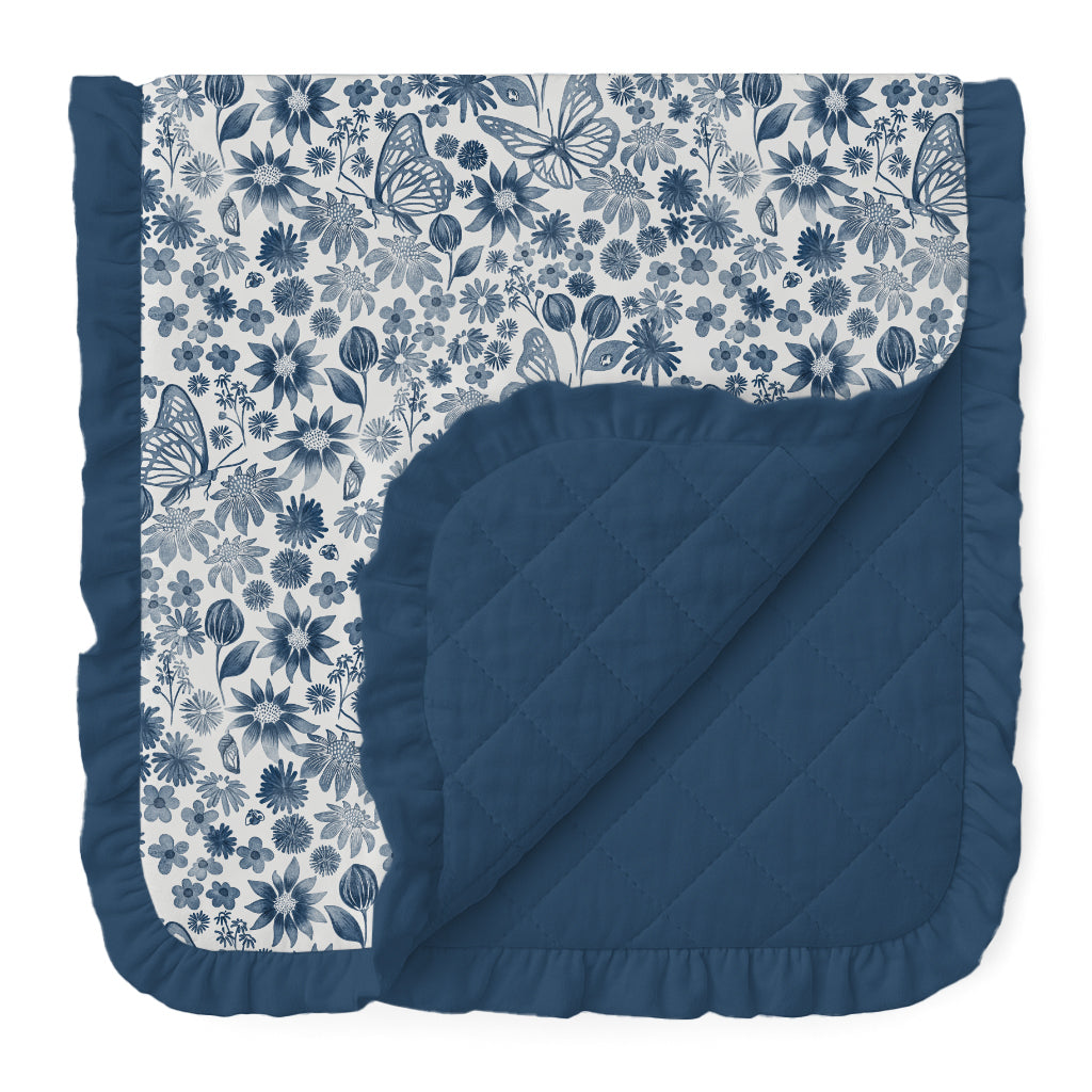 Flutter into style! Butterfly Garden blooms across a soft backdrop with beautiful florals in shades of blue. Butterflies flutter between daisies, tulips, and wildflowers, creating a peaceful garden vibe. Perfect for your little nature girl who loves the beauty of insects in a garden full of petals & flowers!