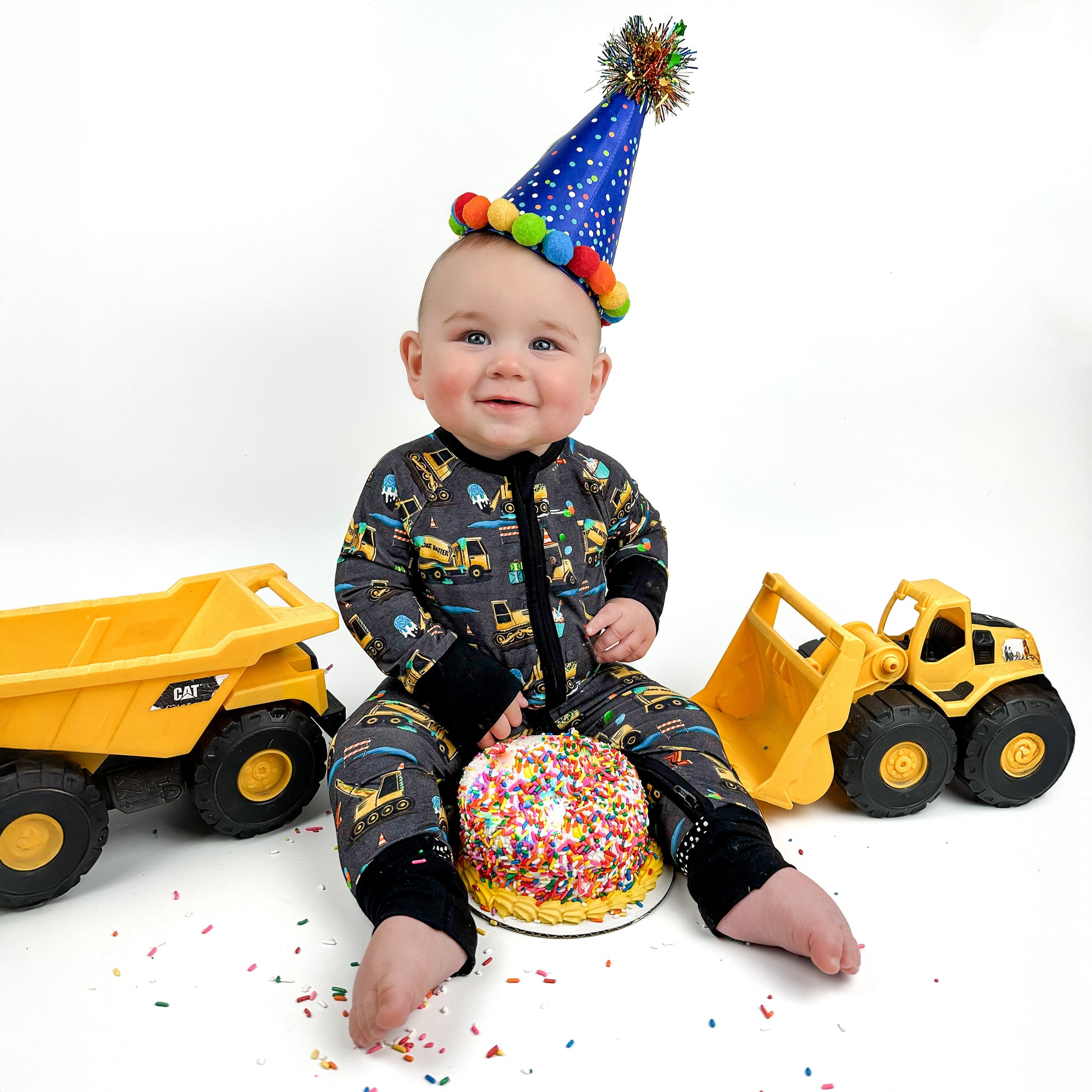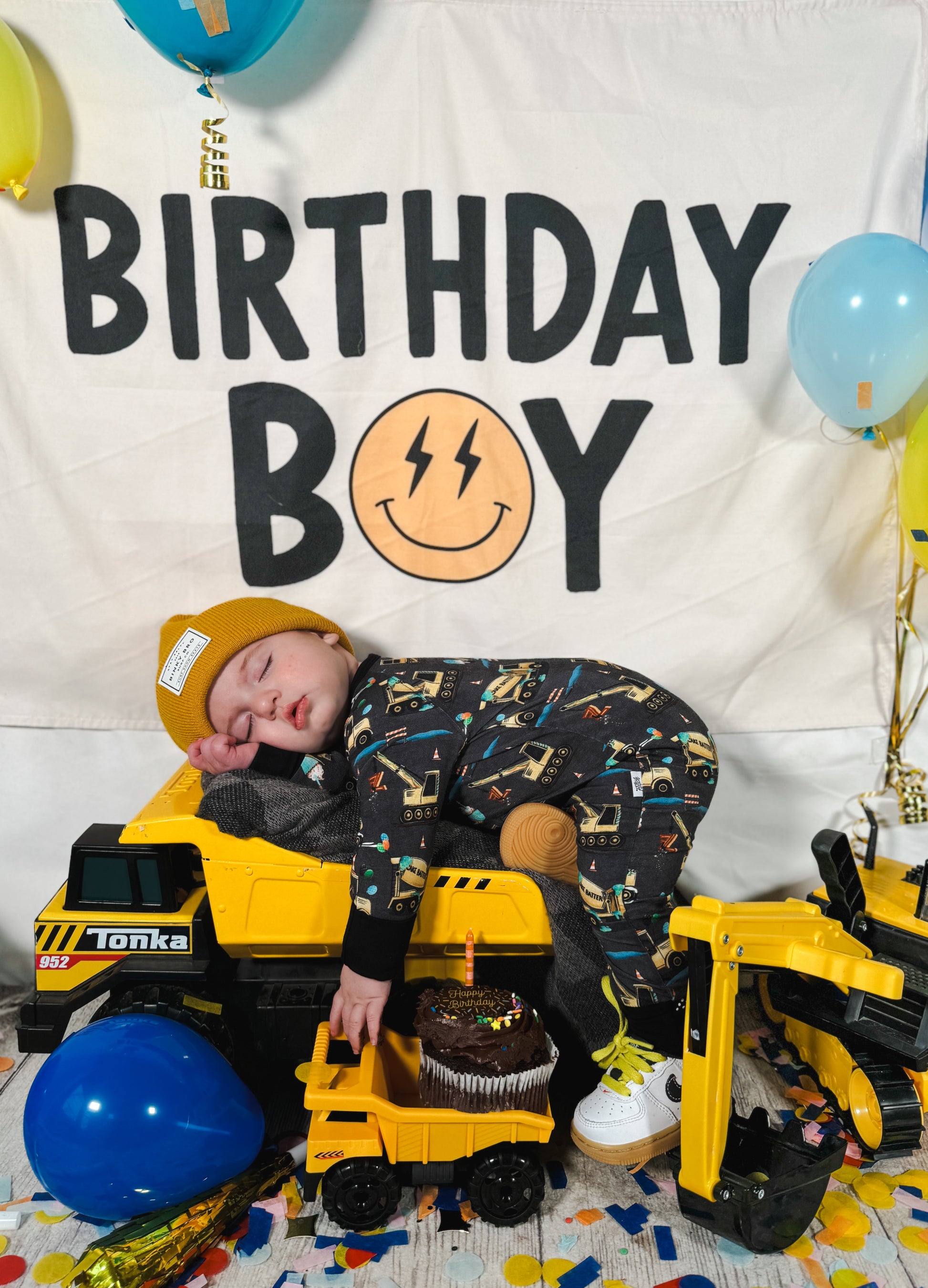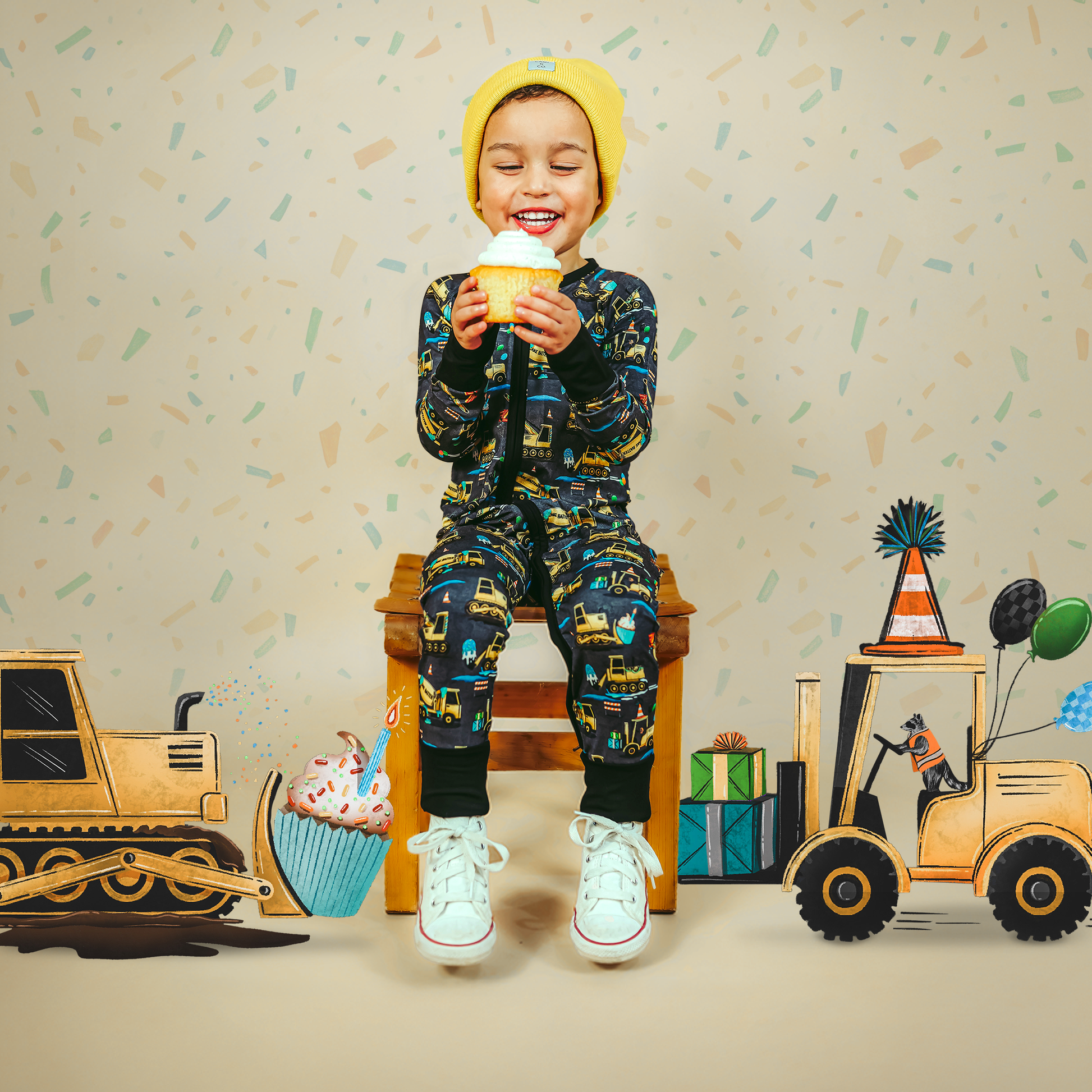 Time to ‘lift” your spirits—it's a celebratory day! This Construction pattern is inspired by Fletch’s 3rd Birthday and anniversary - made special to celebrate with your fam! “Dig” the vibes and the sweet treats adorned in this epic birthday party design with construction vehicles, cupcakes, epic gifts, balloons, and fun animals like a raccoon! Celebrate your own kiddos birthday with The Fletch Fam year-round.