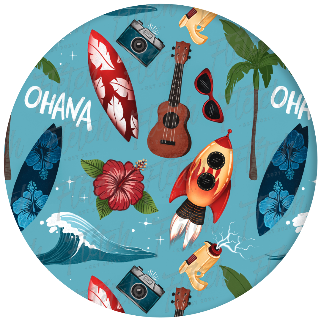 Ride the wave of imagination with our dreamy Cosmic Surf print! This out-of-this-world design features a playful aqua blue background splashed with colorful surfboards, guitars, and alien rocket ships! Perfect for your little beach babe who's ready to make a splash.