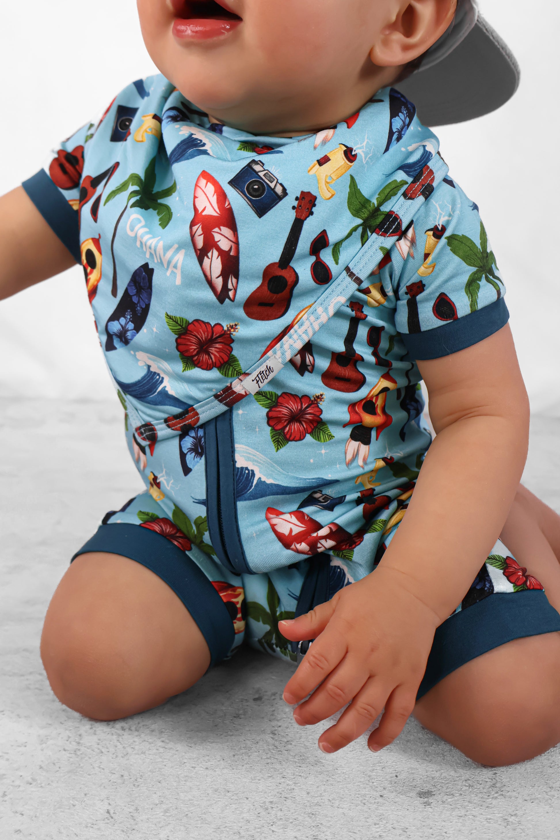 Ride the wave of imagination with our dreamy Cosmic Surf print! This out-of-this-world design features a playful aqua blue background splashed with colorful surfboards, guitars, and alien rocket ships! Perfect for your little beach babe who's ready to make a splash.