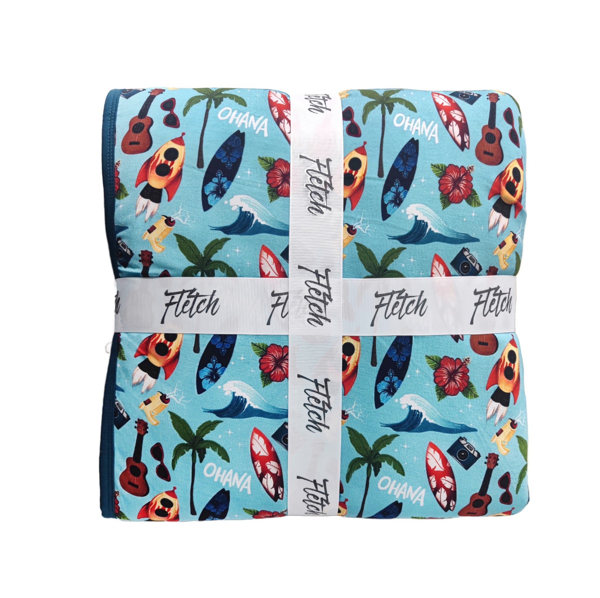 Ride the wave of imagination with our dreamy Cosmic Surf print! This out-of-this-world design features a playful aqua blue background splashed with colorful surfboards, guitars, and alien rocket ships! Perfect for your little beach babe who's ready to make a splash while never forgetting that Ohana means family!