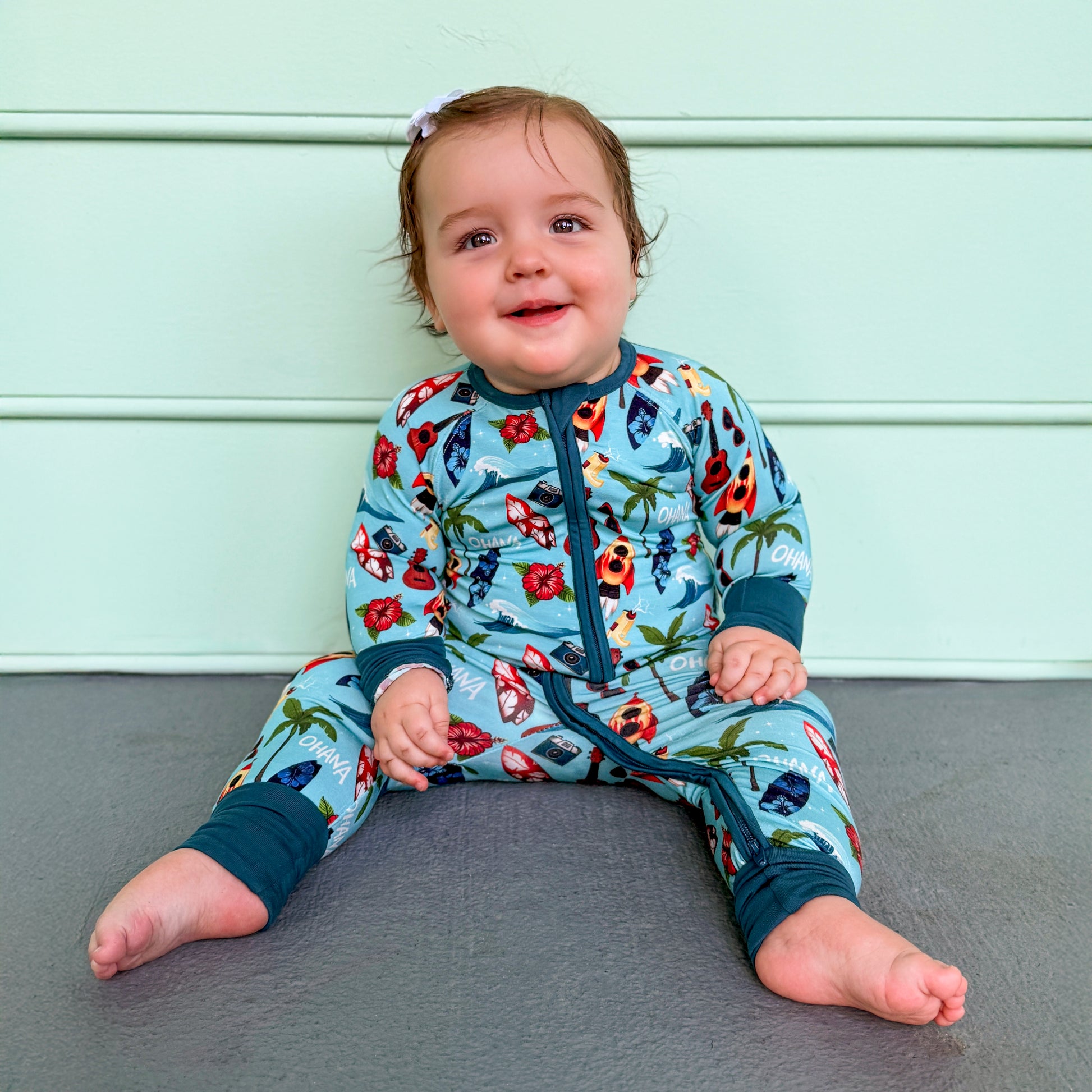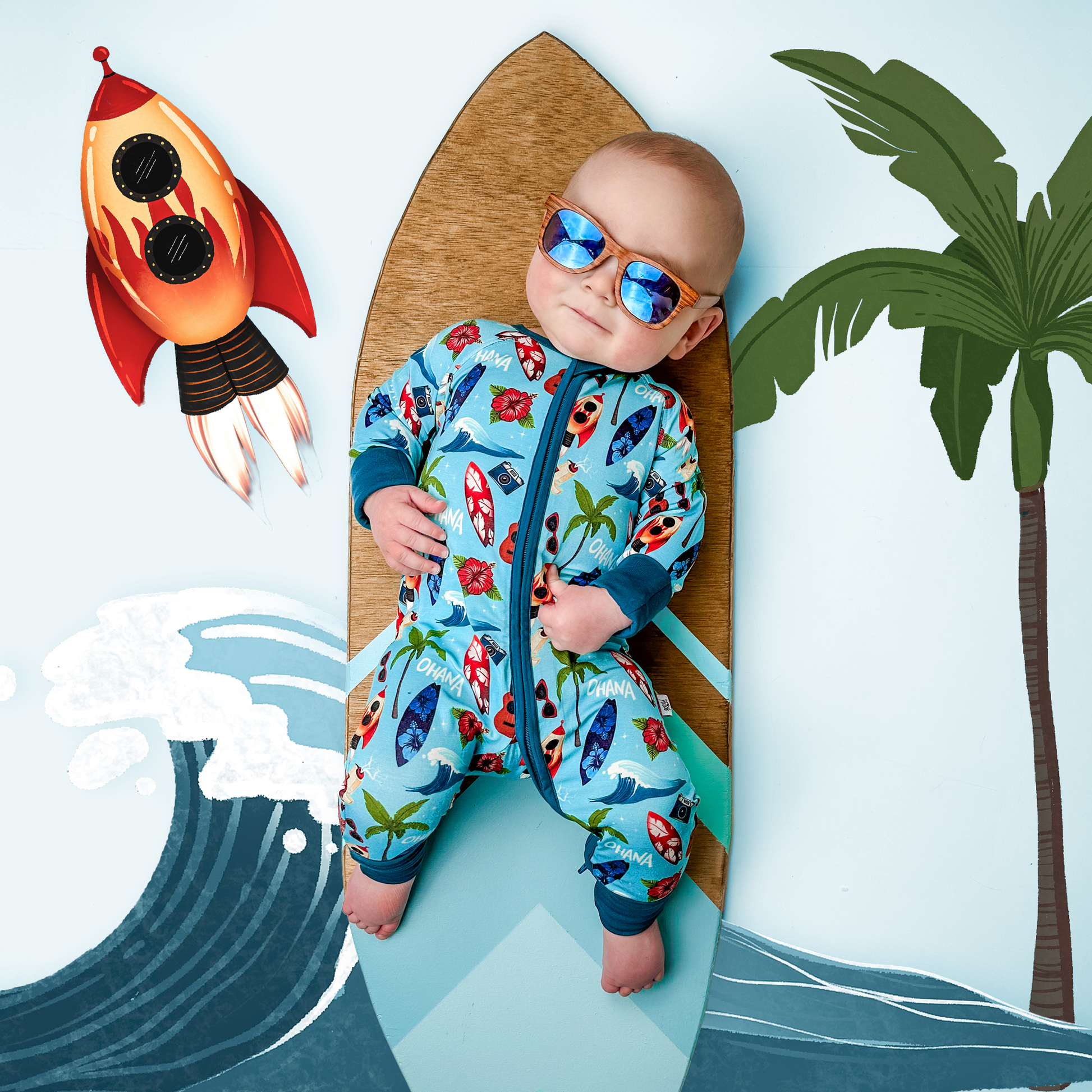 Ride the wave of imagination with our dreamy Cosmic Surf print! This out-of-this-world design features a playful aqua blue background splashed with colorful surfboards, guitars, and alien rocket ships! Perfect for your little beach babe who's ready to make a splash while never forgetting that Ohana means family!