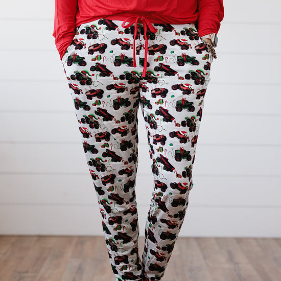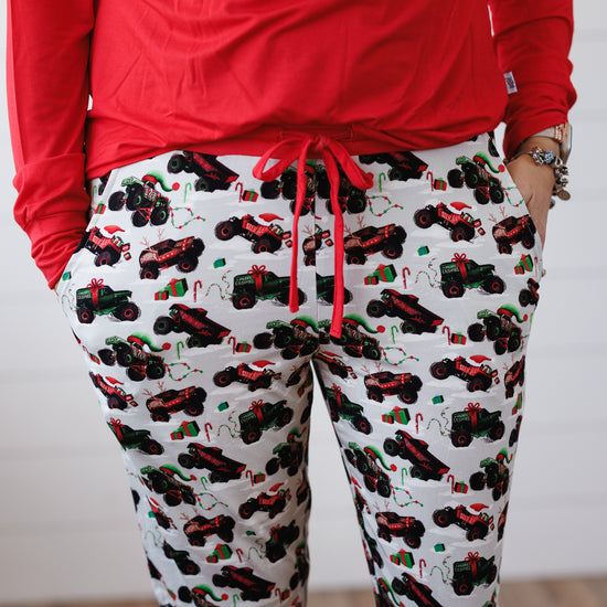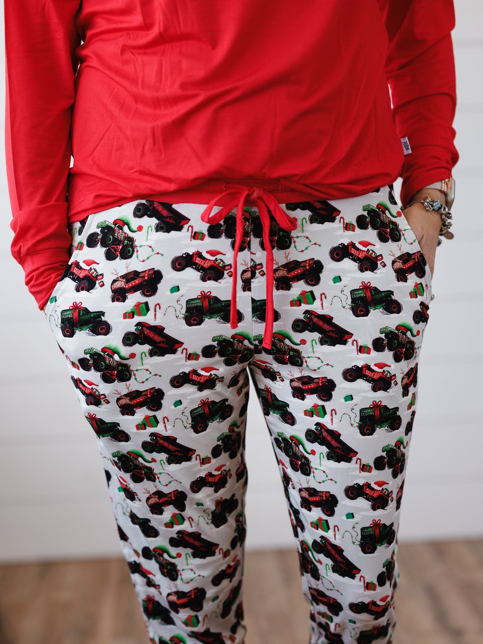 This epic Christmas design is revving up the holiday spirit with some seriously rad monster trucks! Little dudes/dudettes will be stoked to see these big-wheeled motors decked out in festive holiday style. The print features monster trucks with names like "Sleighride," "Merry Crushmas," and "Joyride" that are totally perfect for the season because who says Santa can't ride in style with oversized tires and serious horsepower!