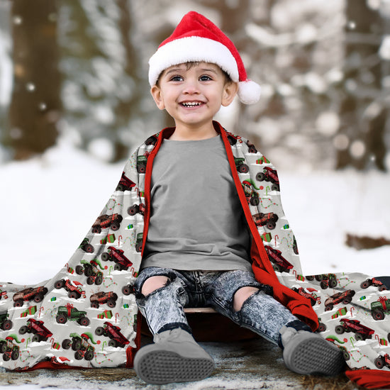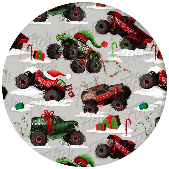 This epic Christmas design is revving up the holiday spirit with some seriously rad monster trucks! Little dudes/dudettes will be stoked to see these big-wheeled motors decked out in festive holiday style. The print features monster trucks with names like "Sleighride," "Merry Crushmas," and "Joyride" that are totally perfect for the season because who says Santa can't ride in style with oversized tires and serious horsepower!