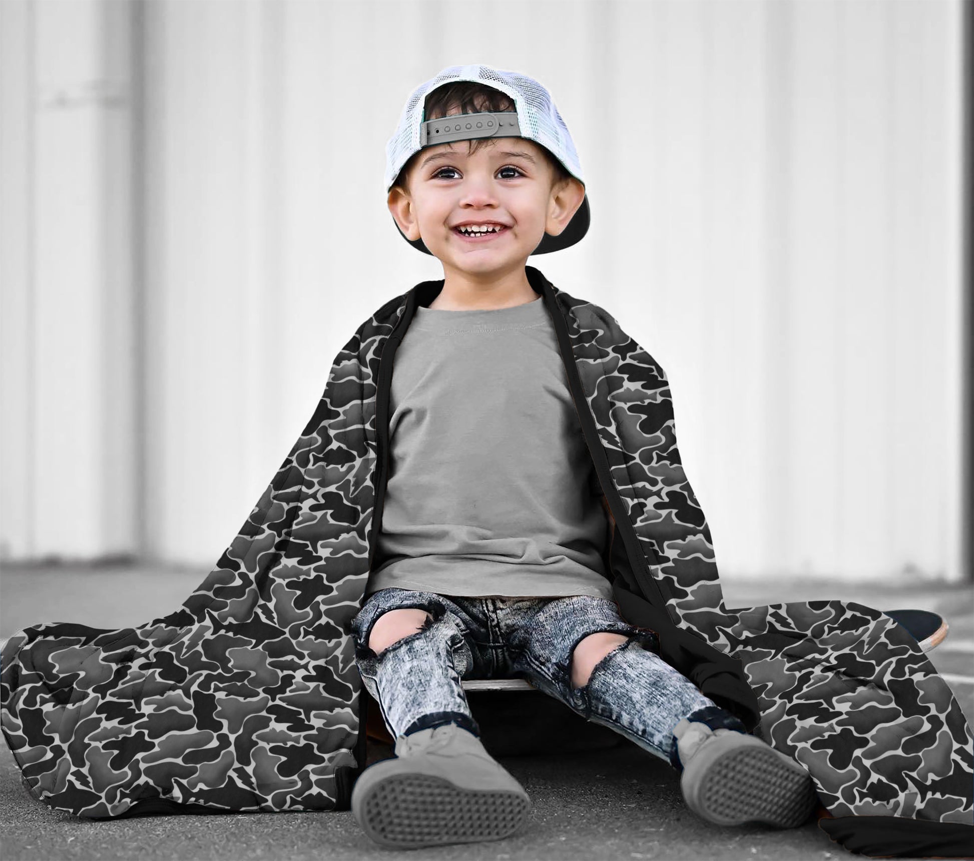 Dive into the deep end with this rad shark print! Dark camo waves create an epic underwater camouflage pattern where lightning bolts swim alongside sharks in the deep sea! Stealthy camo tones blend the ocean predators into their territory - incognito style. It's all about fearless ocean vibes meets camo energy, where predators own their underwater domain. This design is ready to make some serious waves like your kiddo!