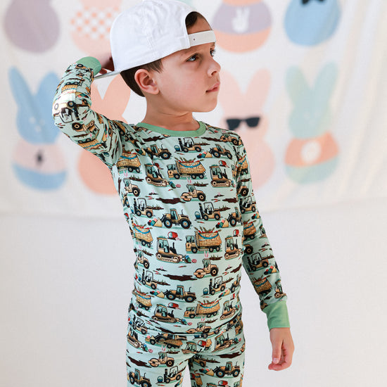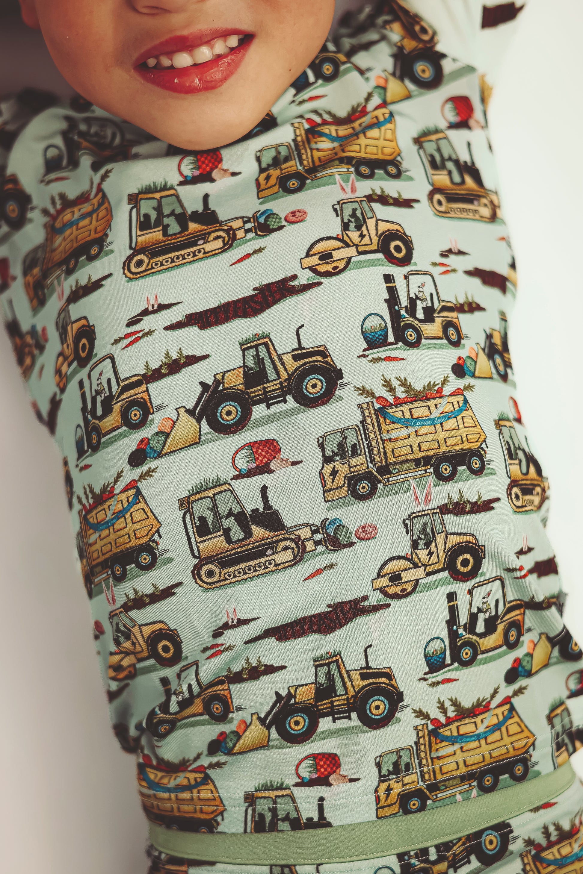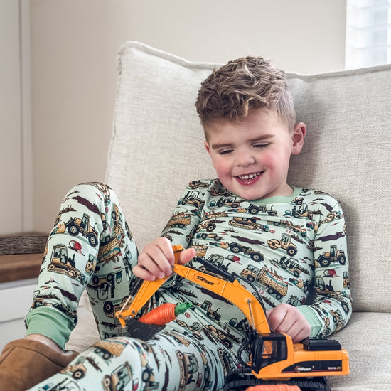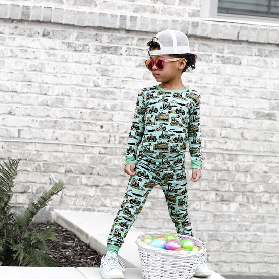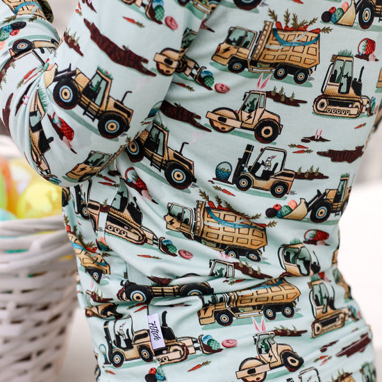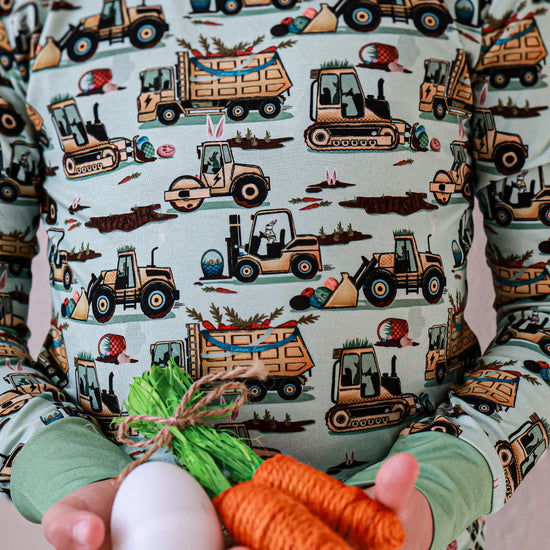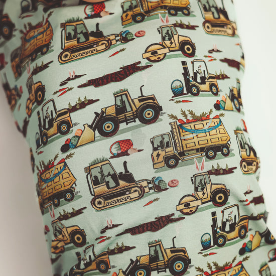 Easter Egg-scavation Crew: Dig into Easter fun! This egg-cellent construction print brings the Easter egg hunt to the job site with tractors, dump trucks, bulldozers, and steamrollers working overtime. Little bunnies supervise the Easter eggs getting loaded, hauled, and delivered across the construction zone. Plaid egg crates ride in truck beds alongside Easter treasures waiting to be discovered. Heavy motors keep it rolling while bunny ears bring the hoppy Easter magic. Perfect for little builders ready to excavate some Easter fun and construct the ultimate Sunday egg hunt! The perfect Easter basket gift.