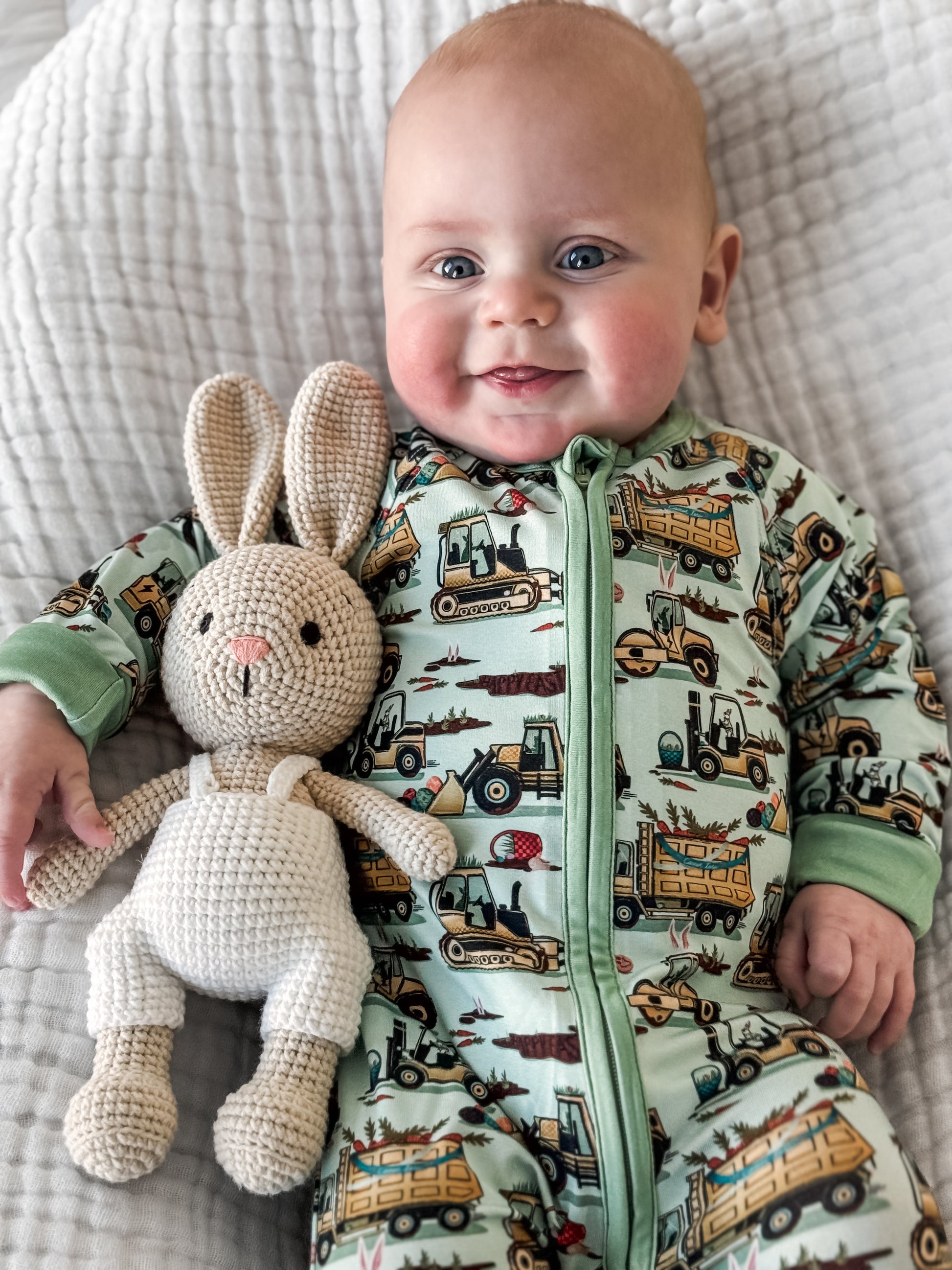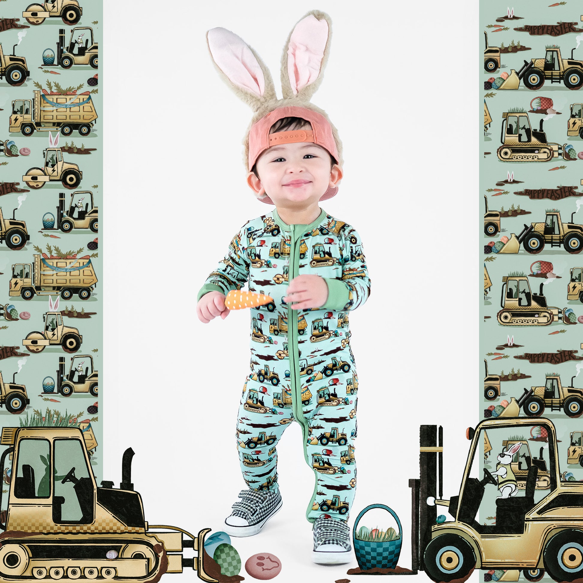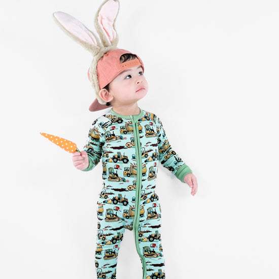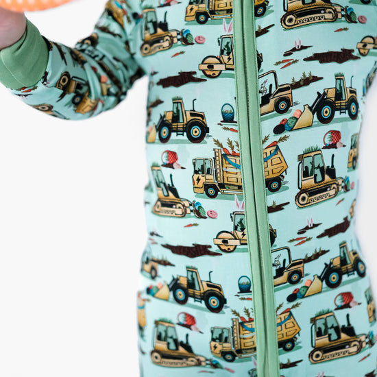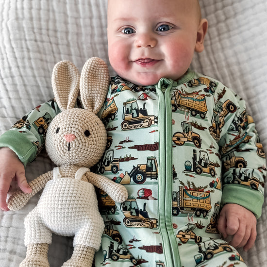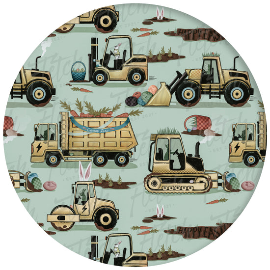 Easter Egg-scavation Crew: Dig into Easter fun! This egg-cellent construction print brings the Easter egg hunt to the job site with tractors, dump trucks, bulldozers, and steamrollers working overtime. Little bunnies supervise the Easter eggs getting loaded, hauled, and delivered across the construction zone. Plaid egg crates ride in truck beds alongside Easter treasures waiting to be discovered. Heavy motors keep it rolling while bunny ears bring the hoppy Easter magic. Perfect for little builders ready to excavate some Easter fun and construct the ultimate Sunday egg hunt! The perfect Easter basket gift.