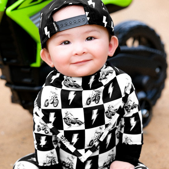An adrenaline pumping, heart- racing print for kids obsessed with extreme sports and electric motorbike adventures. Featuring dirt bikes and motorcycles in full action mode, this design has a killer black & white checkered pattern with lightning bolts. It’s all about high- voltage adventure and two- wheeled thrills. Perfect for any future rider who lives for the rush and isn't afraid to push the limits! You can feel the dirt flying and engine motors roaring! Warning: May cause shocking levels of rad.