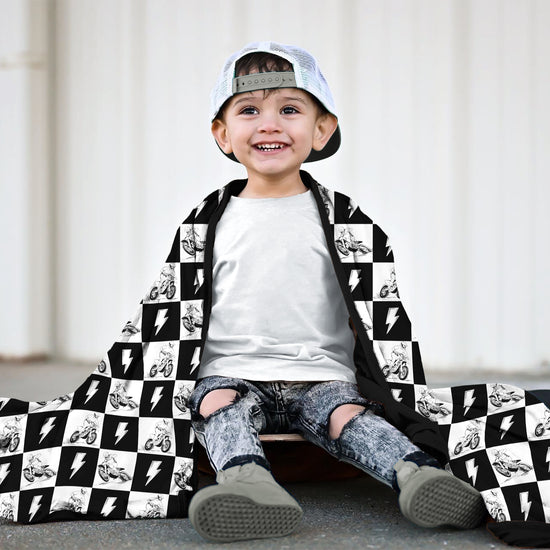 An adrenaline pumping, heart- racing print for kids obsessed with extreme sports and electric motorbike adventures. Featuring dirt bikes and motorcycles in full action mode, this design has a killer black & white checkered pattern with lightning bolts. It’s all about high- voltage adventure and two- wheeled thrills. Perfect for any future rider who lives for the rush and isn't afraid to push the limits! You can feel the dirt flying and engine motors roaring! Warning: May cause shocking levels of rad.
