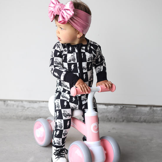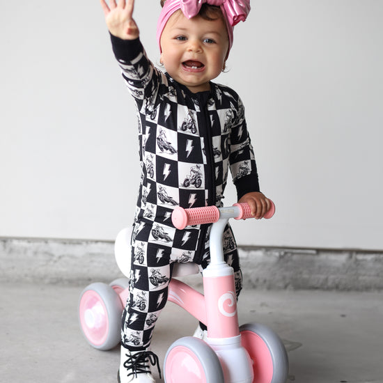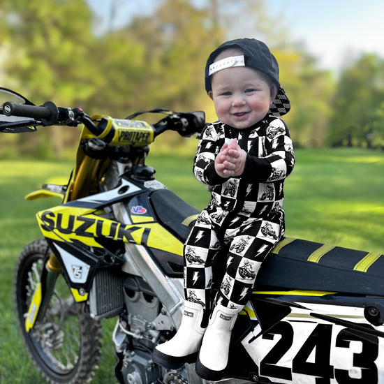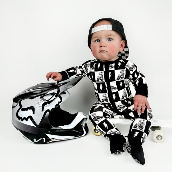 An adrenaline pumping, heart- racing print for kids obsessed with extreme sports and electric motorbike adventures. Featuring dirt bikes and motorcycles in full action mode, this design has a killer black & white checkered pattern with lightning bolts. It’s all about high- voltage adventure and two- wheeled thrills. Perfect for any future rider who lives for the rush and isn't afraid to push the limits! You can feel the dirt flying and engine motors roaring! Warning: May cause shocking levels of rad.