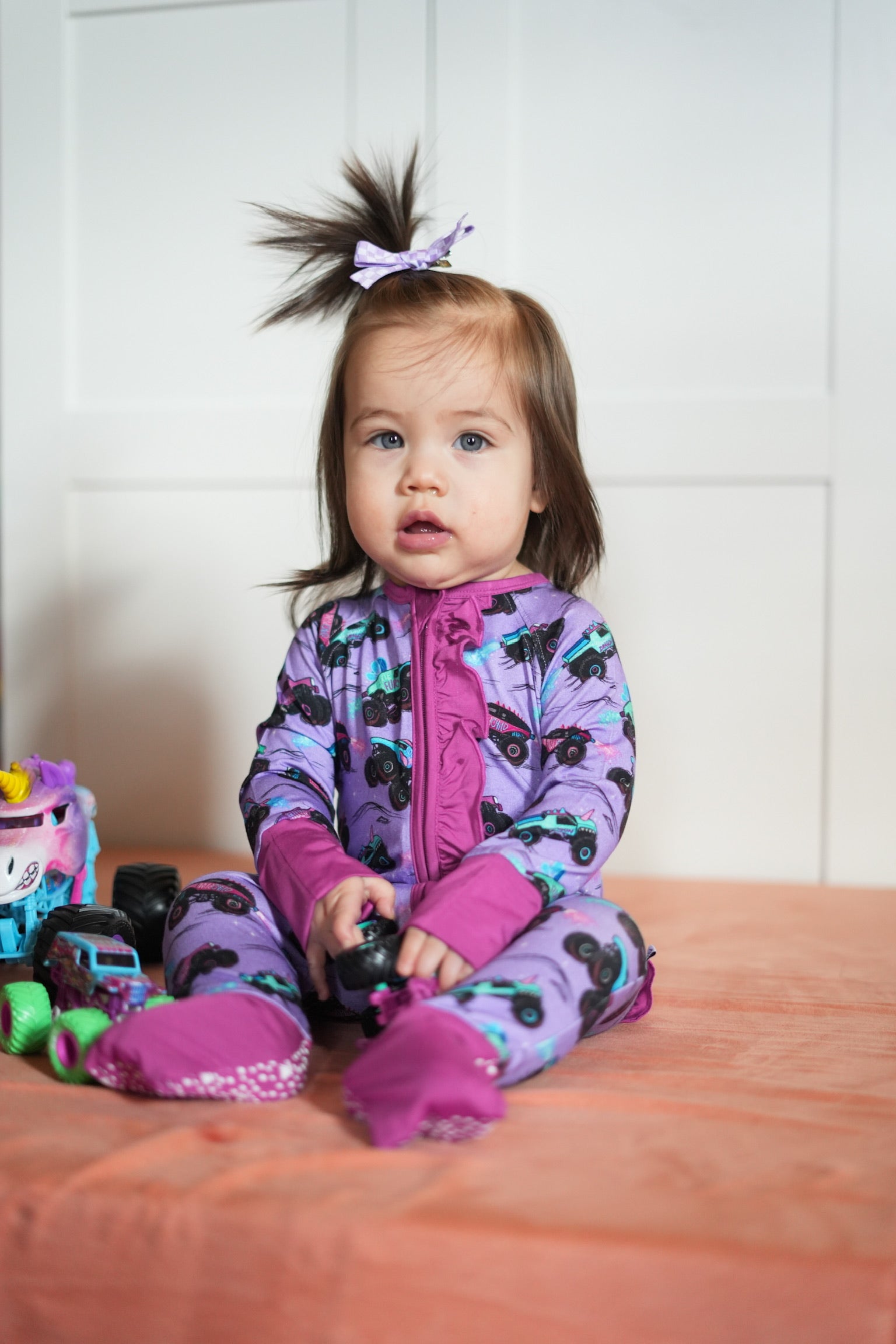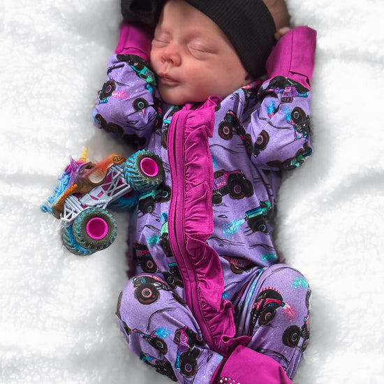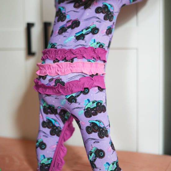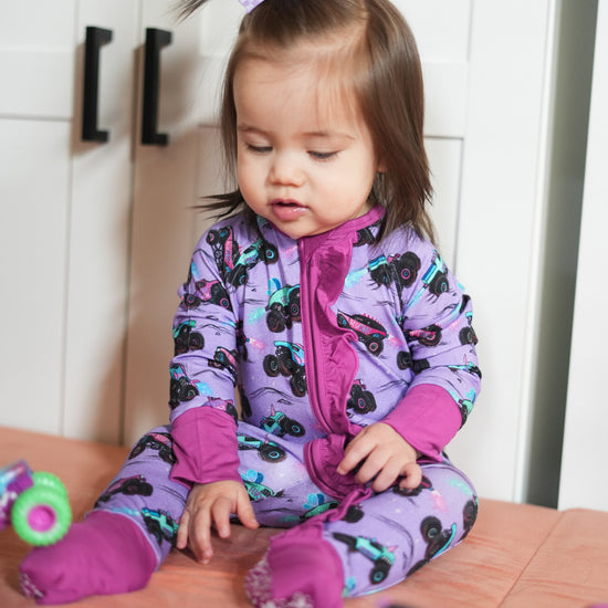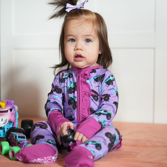 Who says monster trucks can't be pretty? This rad Glitter Smash print has all the crushing trucks with bold graphics. These big cars glitter and shine with epic wheels showing off their engine skills. Girls love monster truck mayhem too! Did someone say monster jams please? The dreamy purple keeps things fun for girls while the trucks bring that fierce, fearless motor energy just like your little one. Perfect for girly daredevils who rock bows and big wheels with total confidence! Rev, ready & roll girlie!
