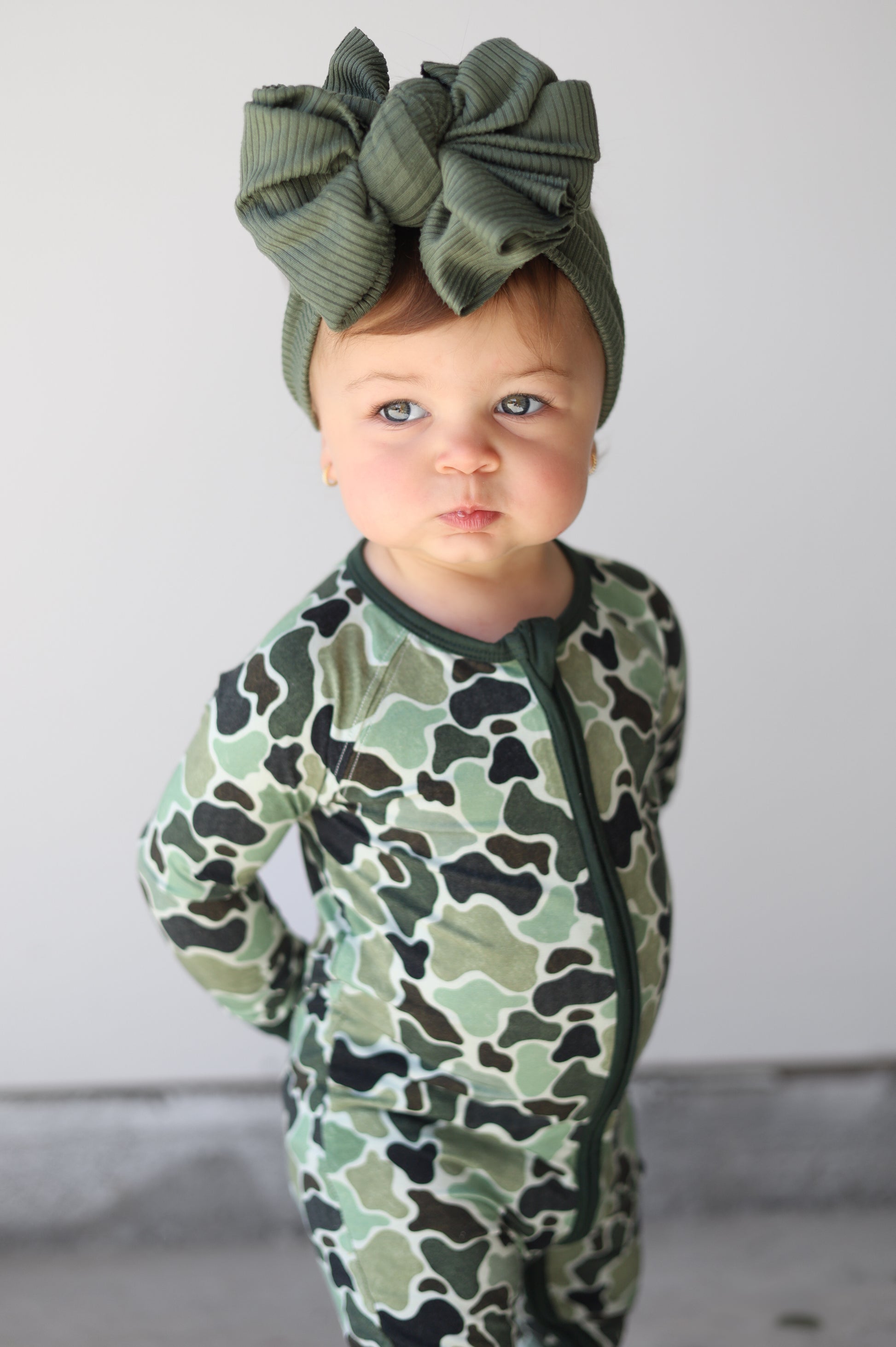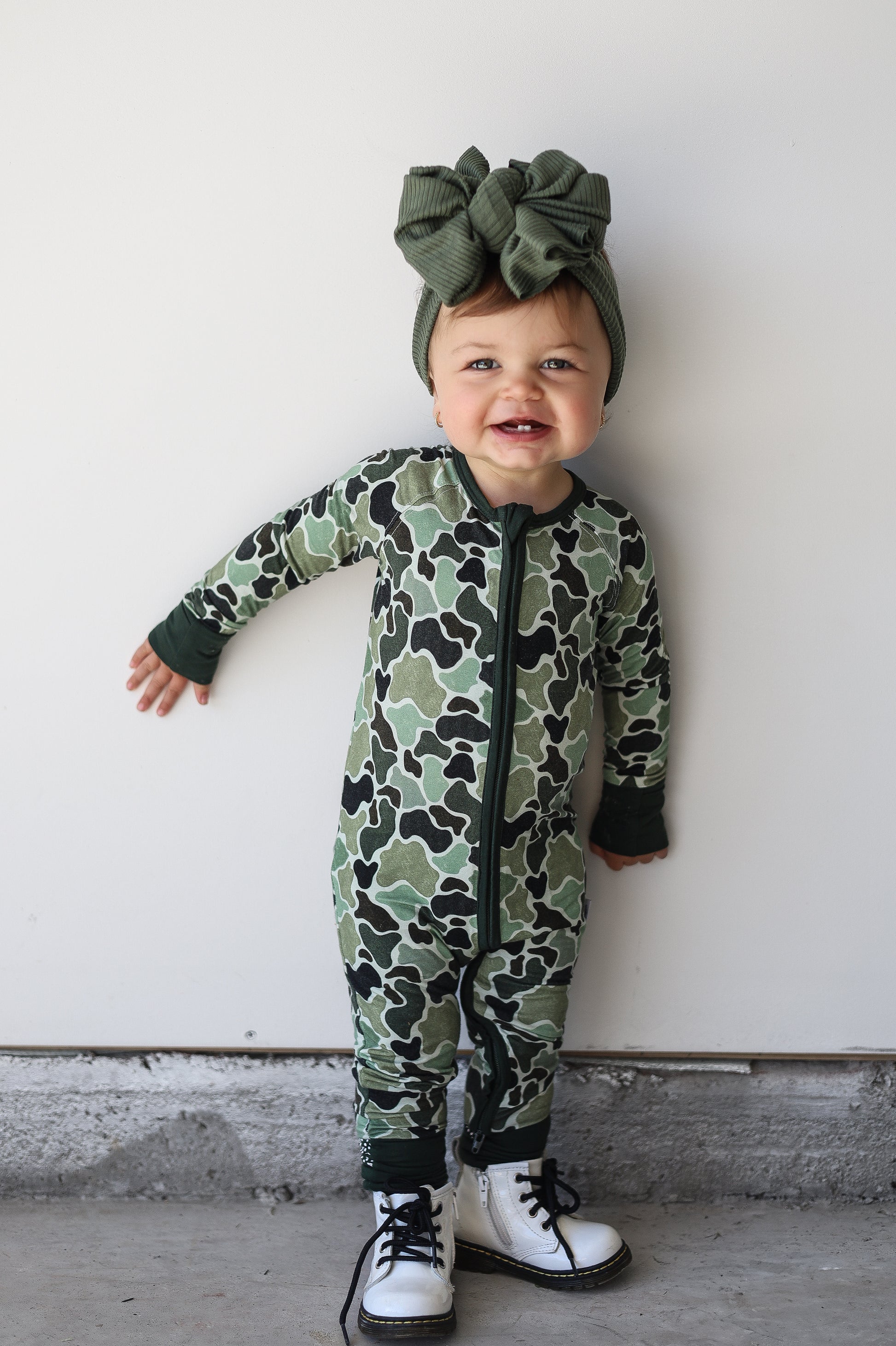 A Camouflage Classic: invisible since forever. Some might even call it the O.G. disappearing act or the original Hide and Seek, "now you see me... actually, you don't!". This camouflage is a classic outdoor camo print designed to keep your babe feeling hidden and winning during any mountain, fishing, camping or forest adventure. Camp incognito with animal tree friends or blend in with the frogs by the pond! Camouflage is key!