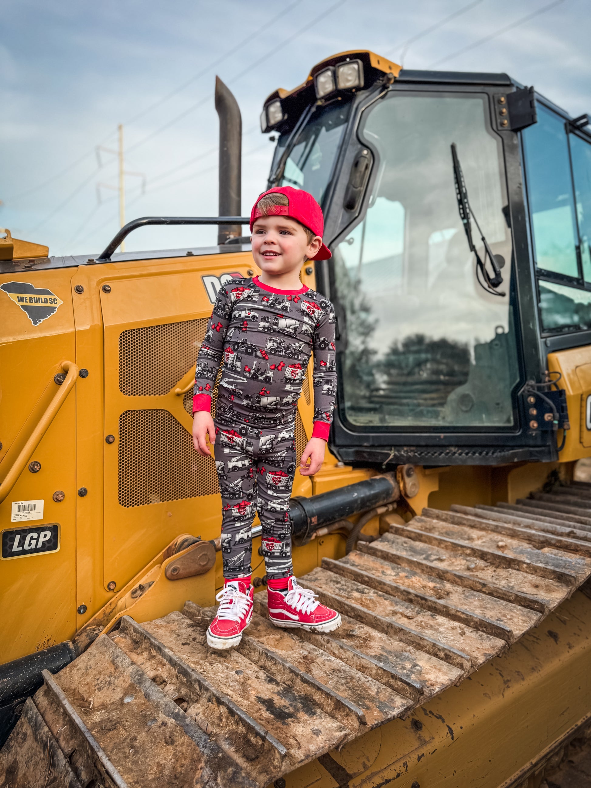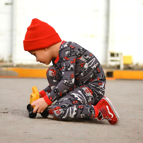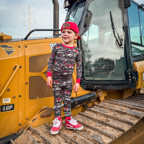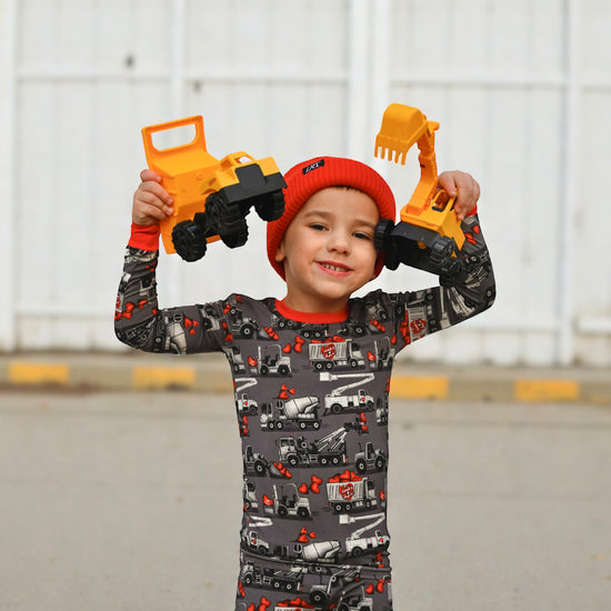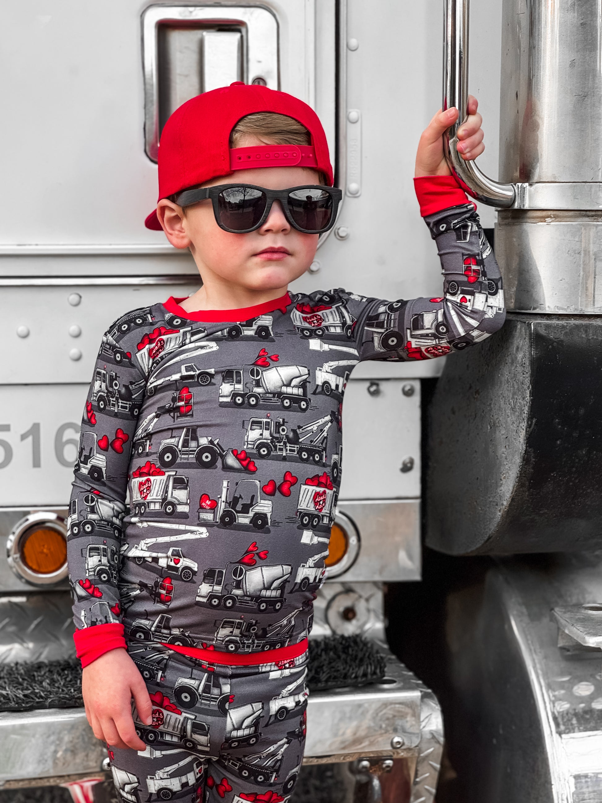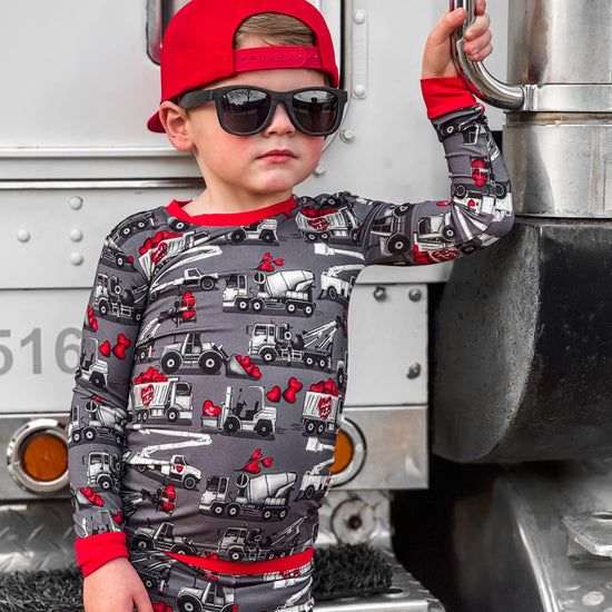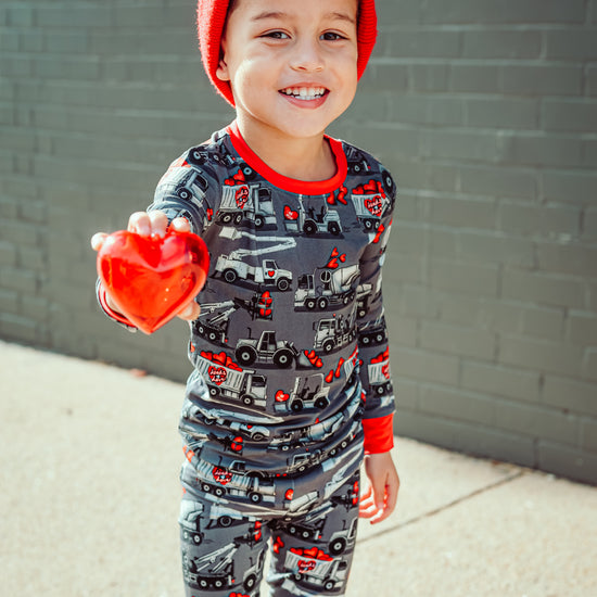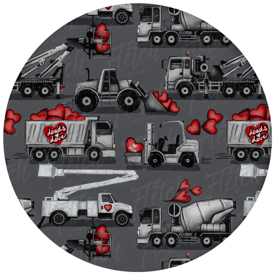 Delivering some serious Valentine's vibes with Loads of Love! This construction truck print hauls valentines' love with big rigs, cement mixers, dump trucks, and tractors carrying their precious cargo - bright red hearts! These hardworking vehicles are on a special Valentine's mission, scooping up hearts and spreading love everywhere they go. "Be Mine" and "Fragile" signs add that sweet touch to all the construction action. It's the perfect mix of tough trucks with tender hearts - because even the biggest machines can deliver the biggest love! Ideal for little builders who dig big trucks and aren't afraid to show their sweet side!