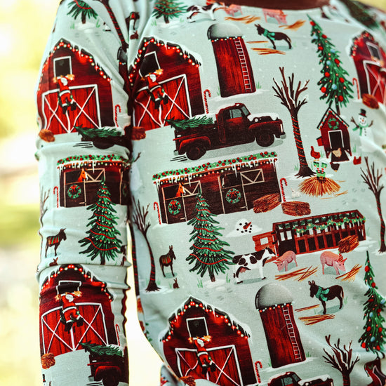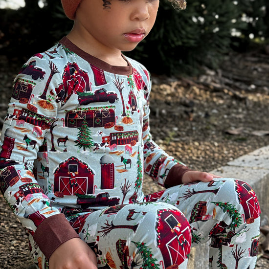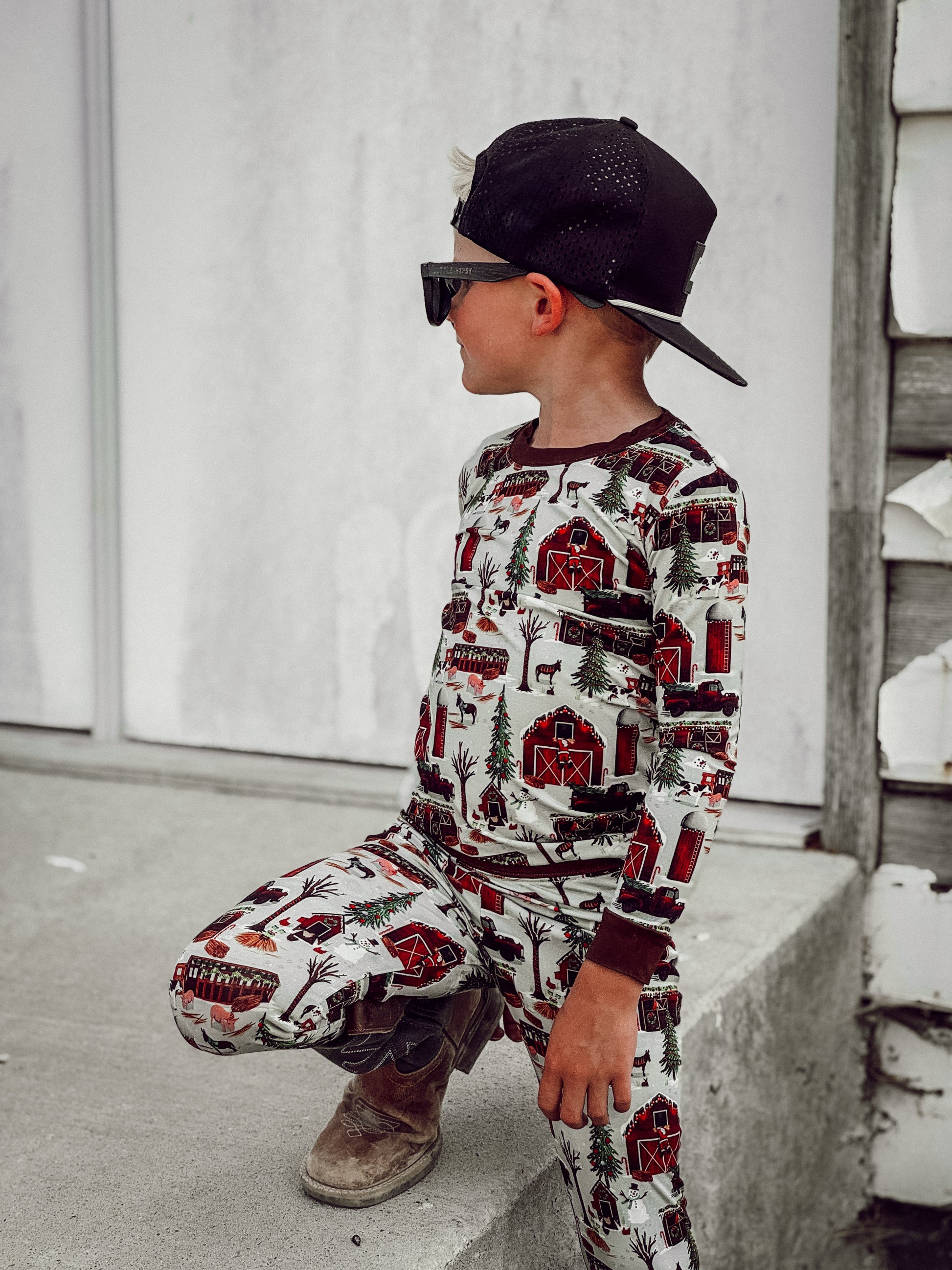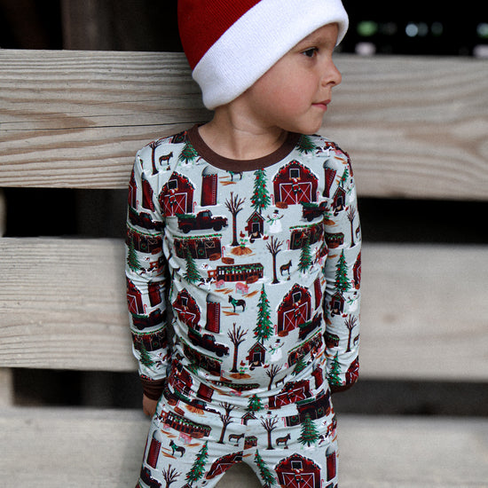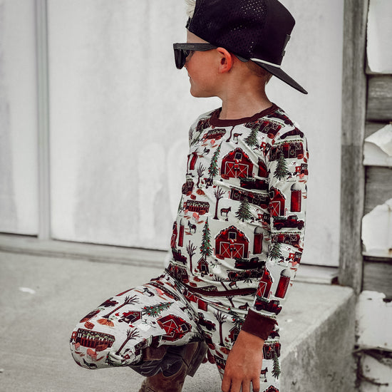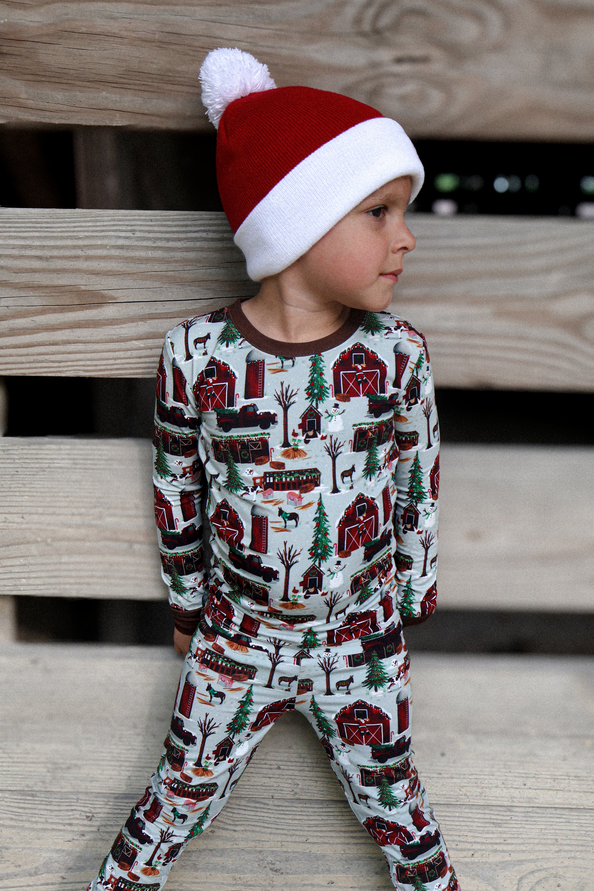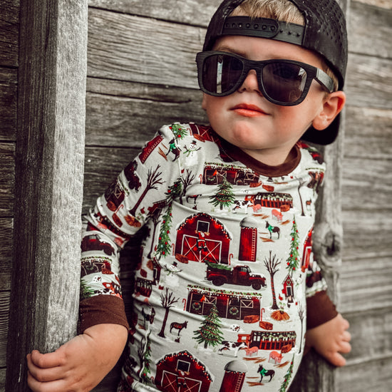 This Christmas farm print is bringing all the epic holiday vibes to the barnyard! Little dudes/dudettes will love this rad winter wonderland filled with classic red barns, cozy farmhouses, and festive farm animals getting into the Christmas spirit. Featuring cool vintage red pickup trucks hauling xmas trees, adorable farm animals like cows, pigs, chickens all bundled up for winter and cheery snowmen. This design is perfect for kids who love animals, farm life, and all the cozy vibes of a country Christmas!