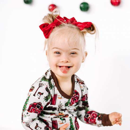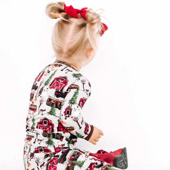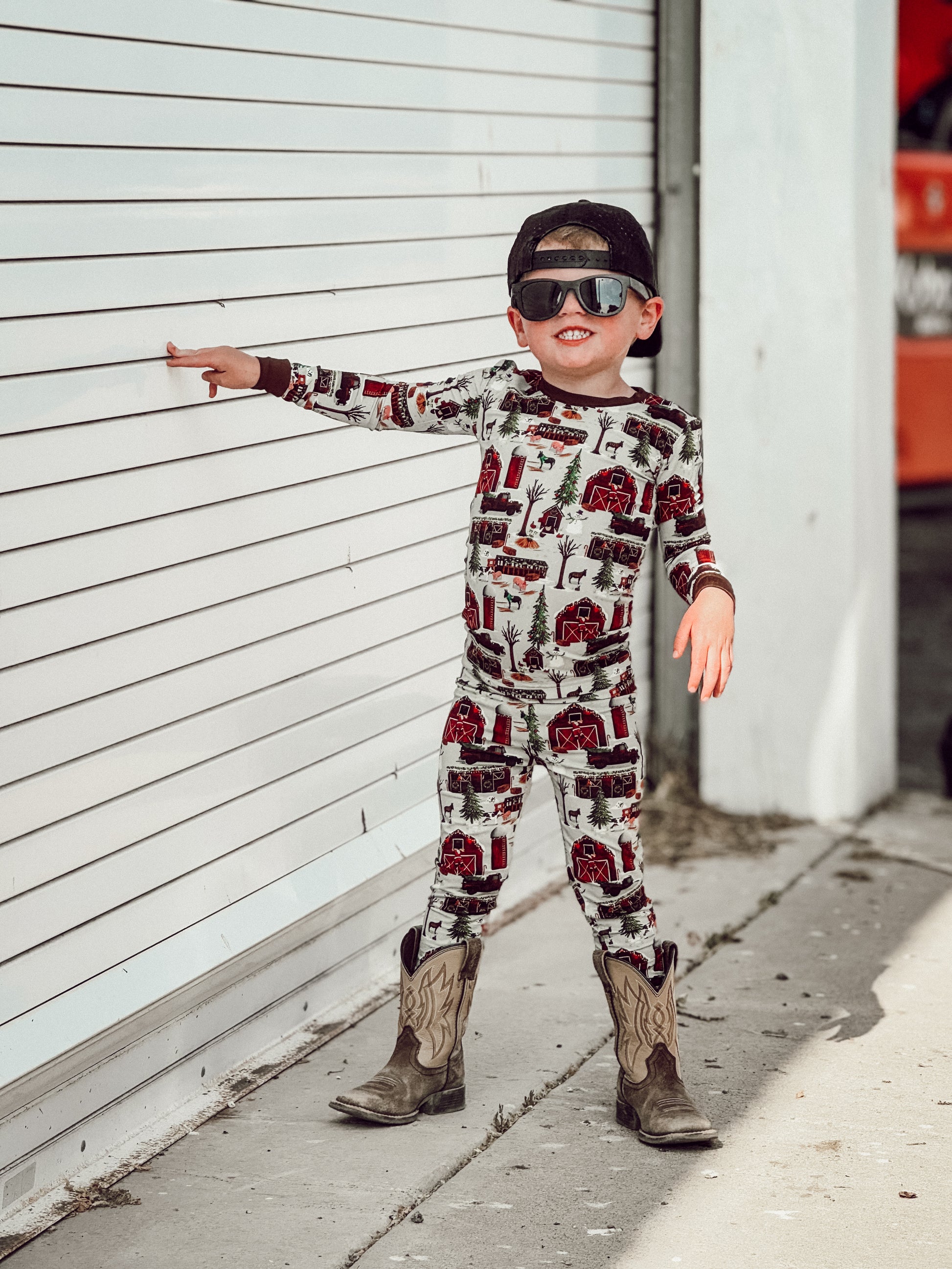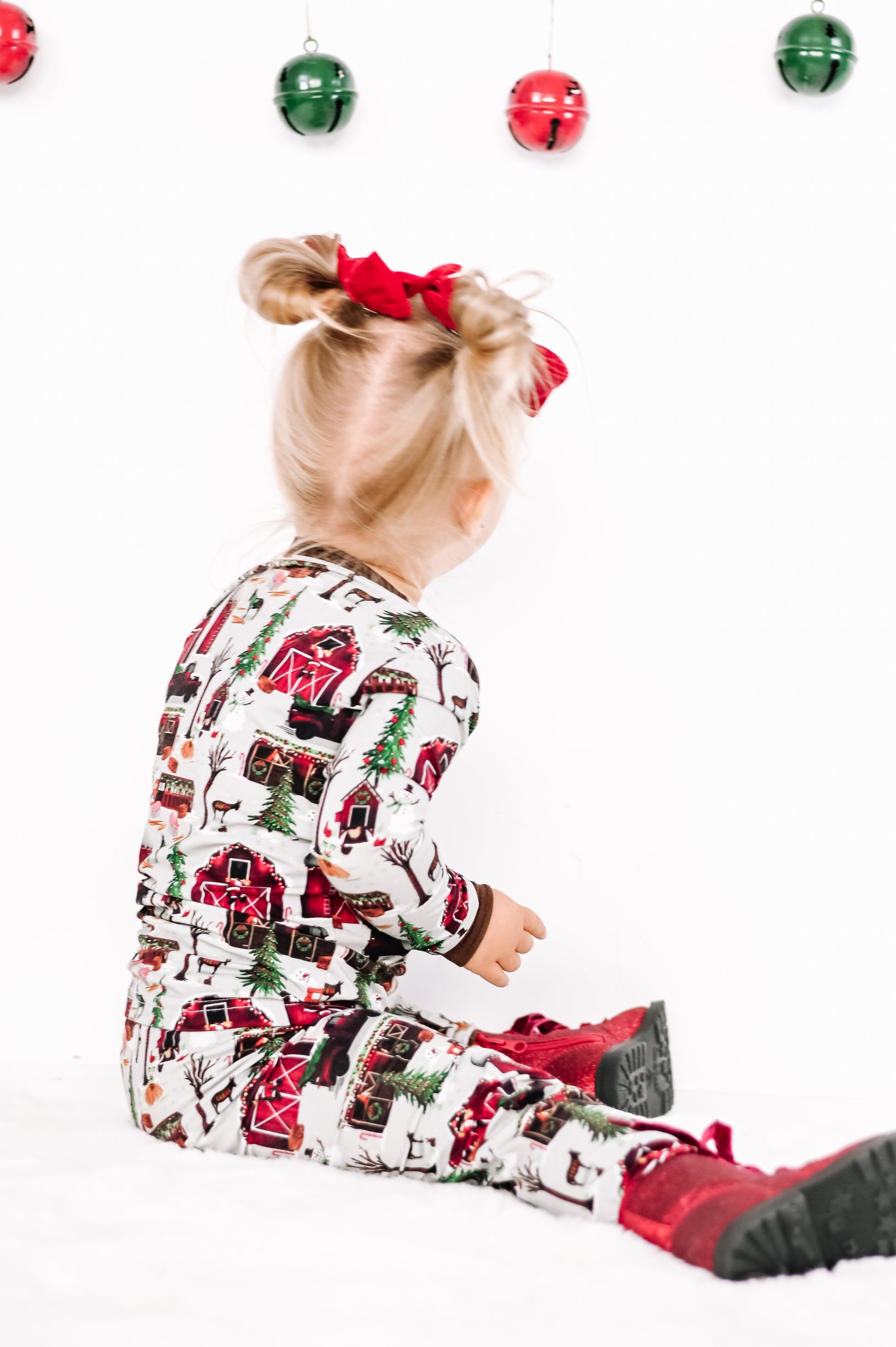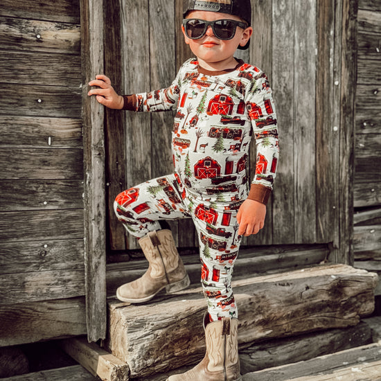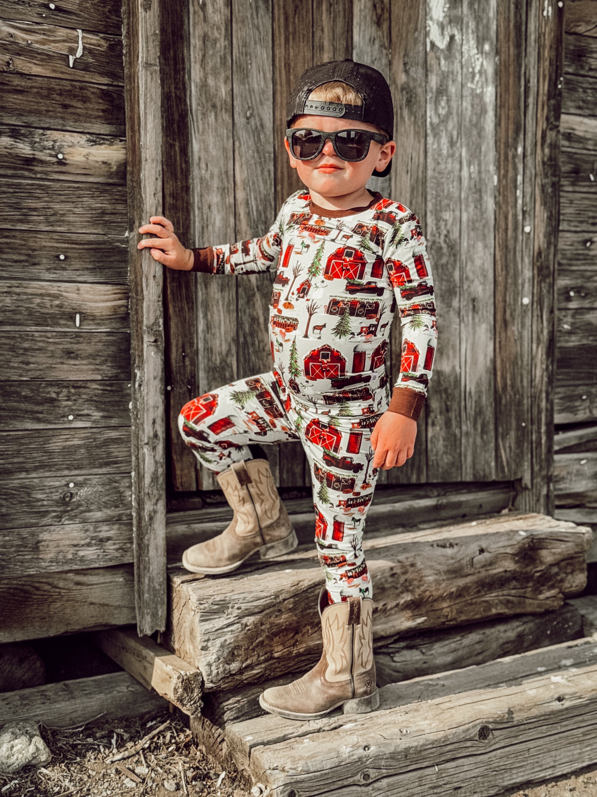 This Christmas farm print is bringing all the epic holiday vibes to the barnyard! Little dudes/dudettes will love this rad winter wonderland filled with classic red barns, cozy farmhouses, and festive farm animals getting into the Christmas spirit. Featuring cool vintage red pickup trucks hauling xmas trees, adorable farm animals like cows, pigs, chickens all bundled up for winter and cheery snowmen. This design is perfect for kids who love animals, farm life, and all the cozy vibes of a country Christmas!