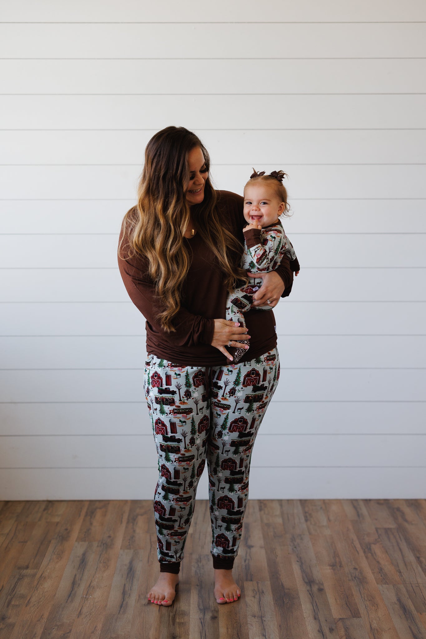 This Christmas farm print is bringing all the epic holiday vibes to the barnyard! Little dudes/dudettes will love this rad winter wonderland filled with classic red barns, cozy farmhouses, and festive farm animals getting into the Christmas spirit. Featuring cool vintage red pickup trucks hauling xmas trees, adorable farm animals like cows, pigs, chickens all bundled up for winter and cheery snowmen. This design is perfect for kids who love animals, farm life, and all the cozy vibes of a country Christmas!