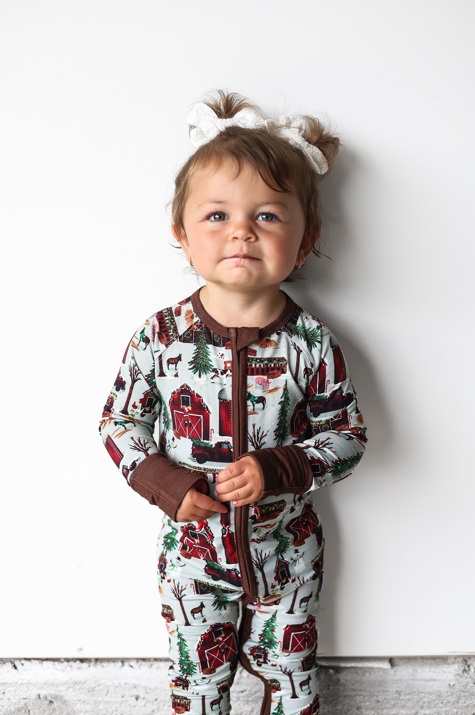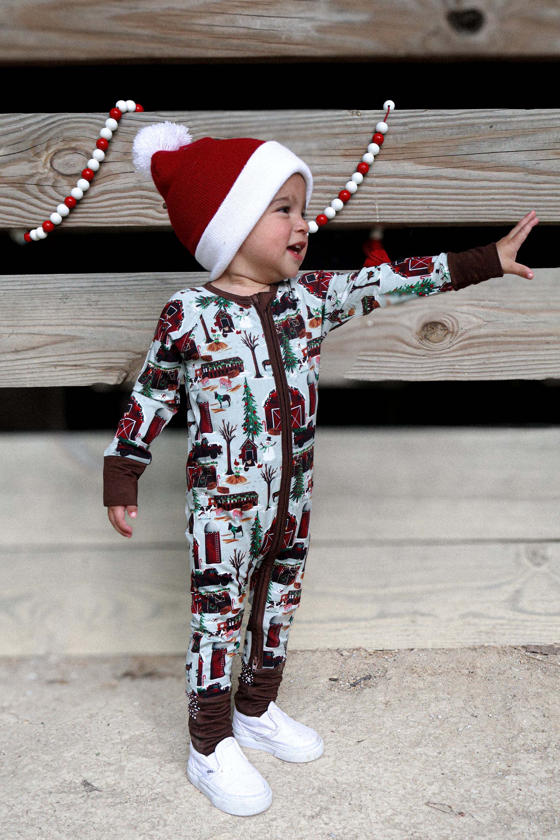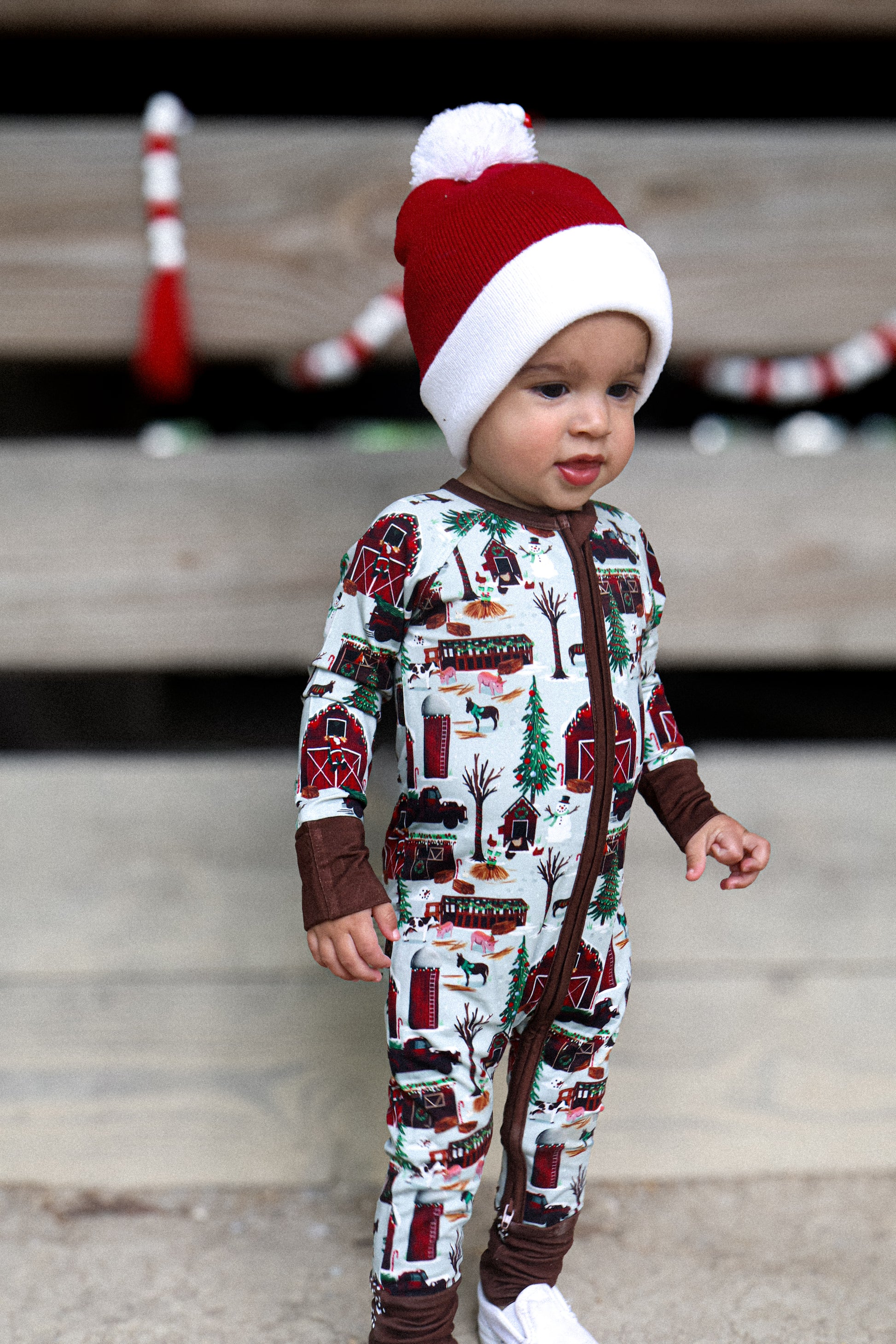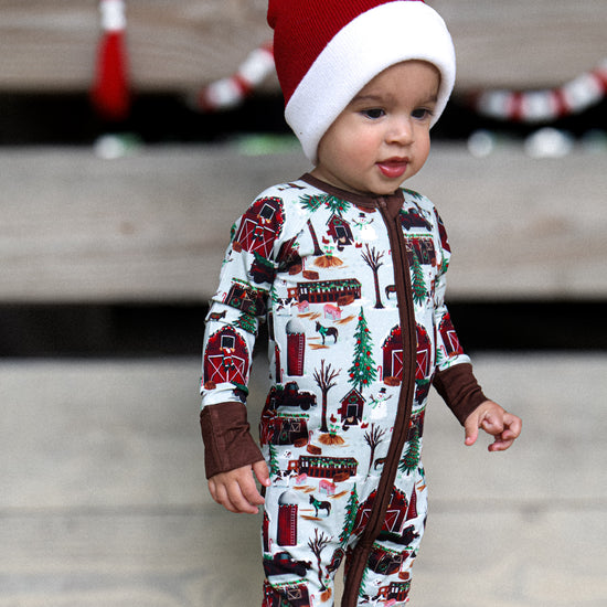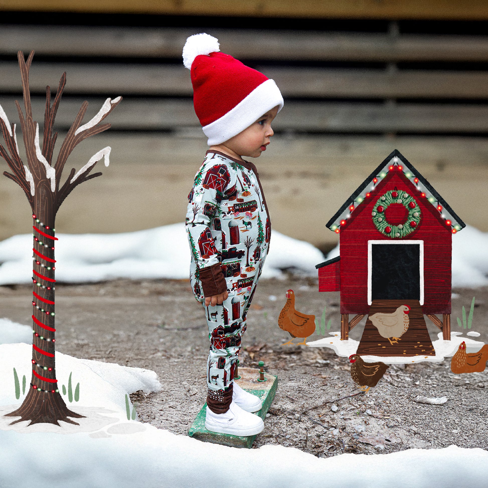 This Christmas farm print is bringing all the epic holiday vibes to the barnyard! Little dudes/dudettes will love this rad winter wonderland filled with classic red barns, cozy farmhouses, and festive farm animals getting into the Christmas spirit. Featuring cool vintage red pickup trucks hauling xmas trees, adorable farm animals like cows, pigs, chickens all bundled up for winter and cheery snowmen. This design is perfect for kids who love animals, farm life, and all the cozy vibes of a country Christmas!