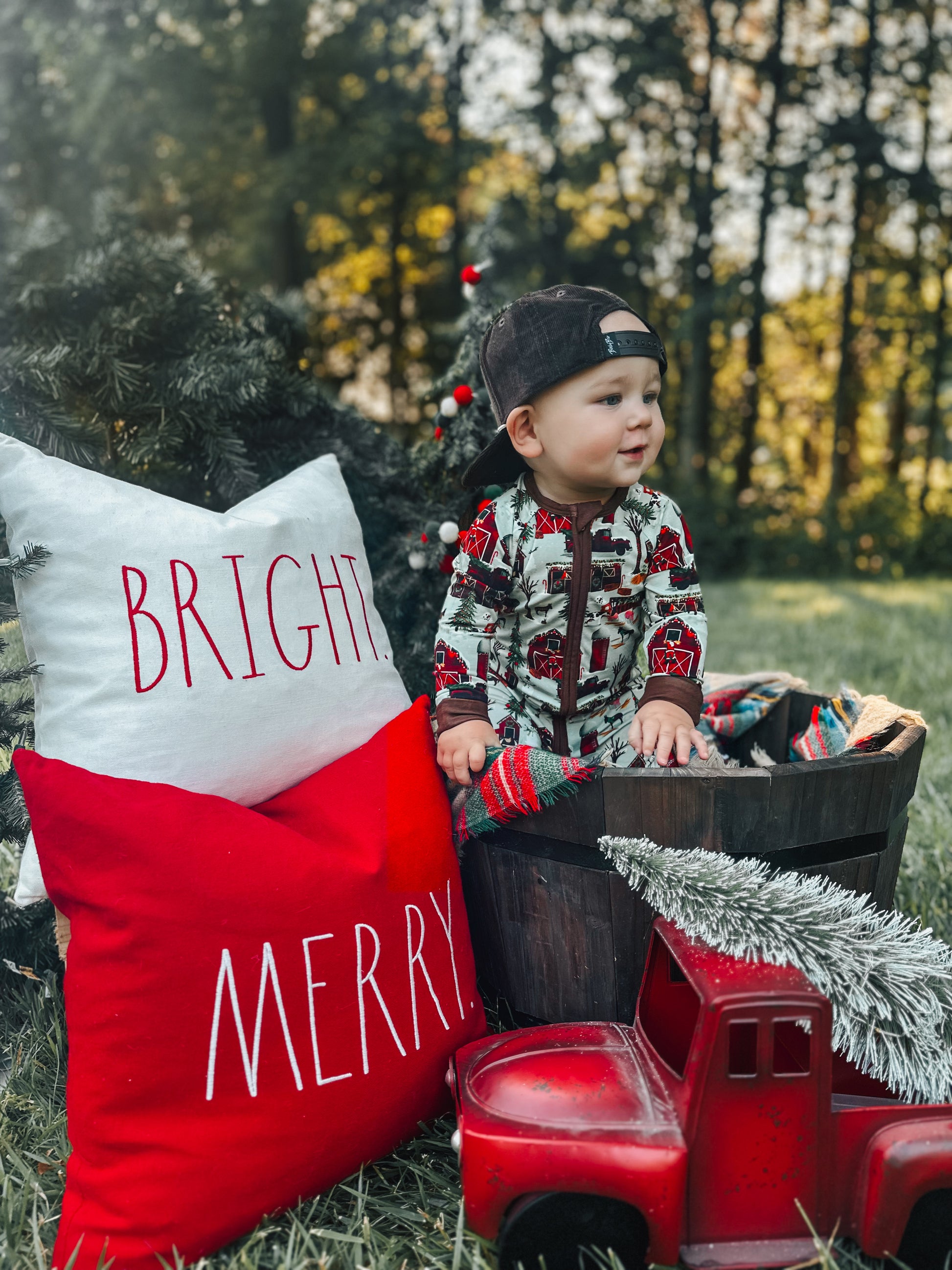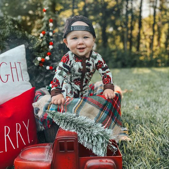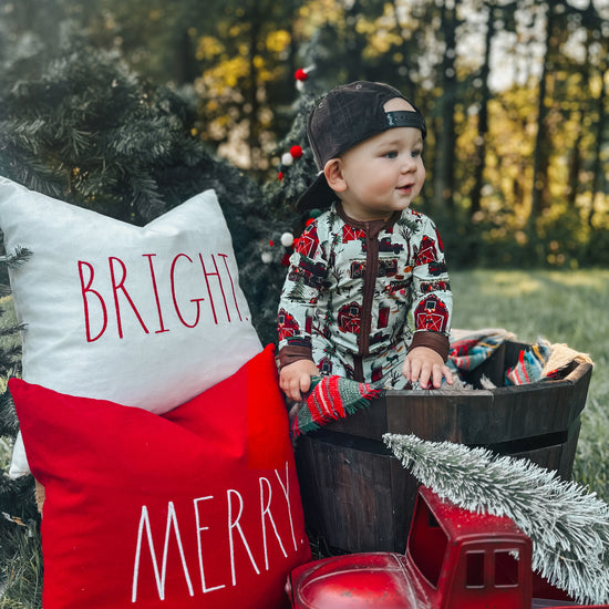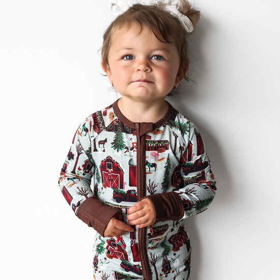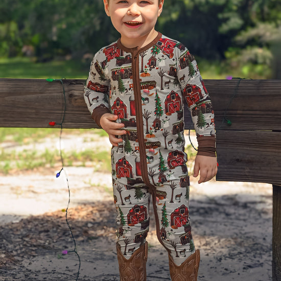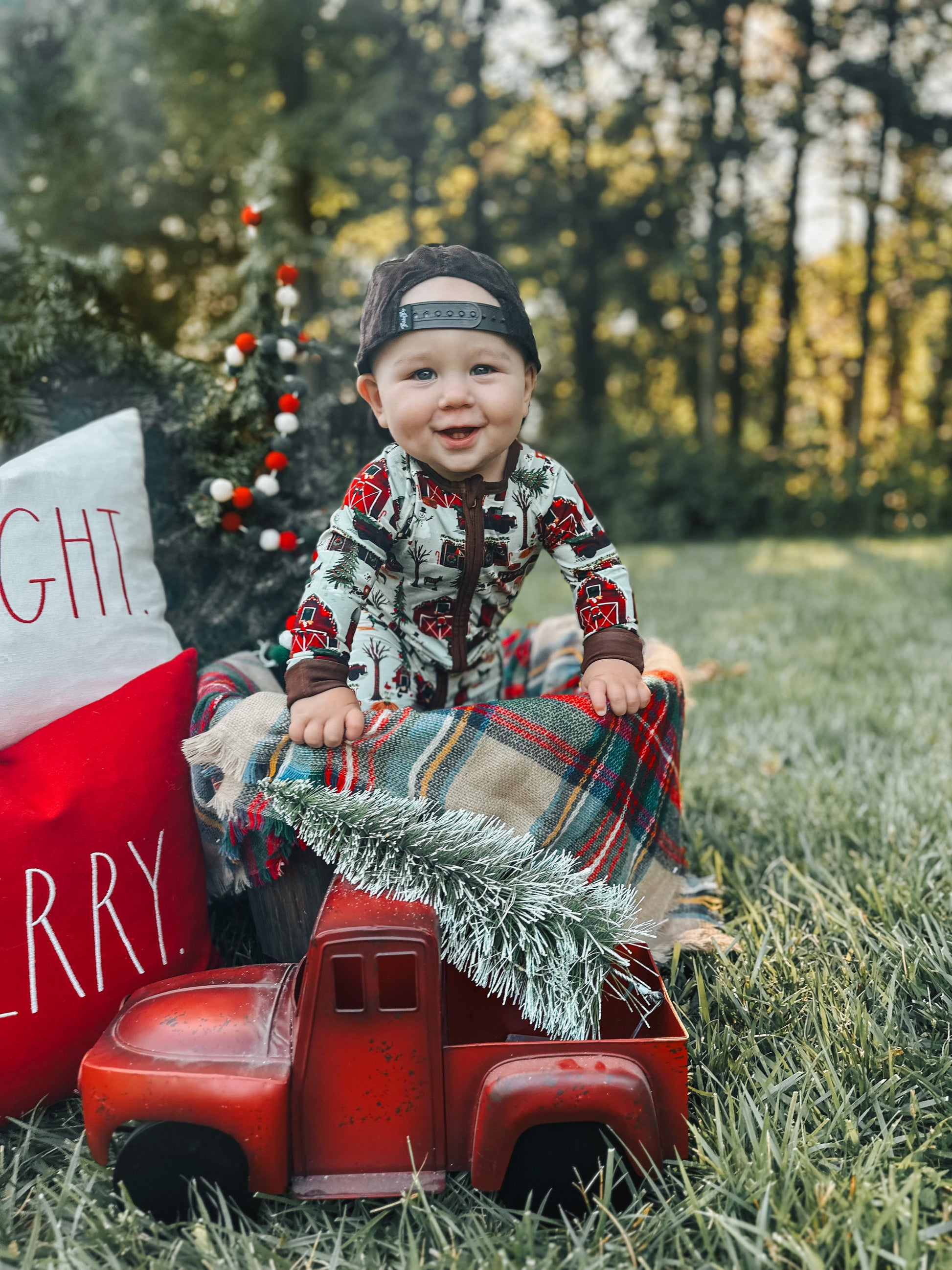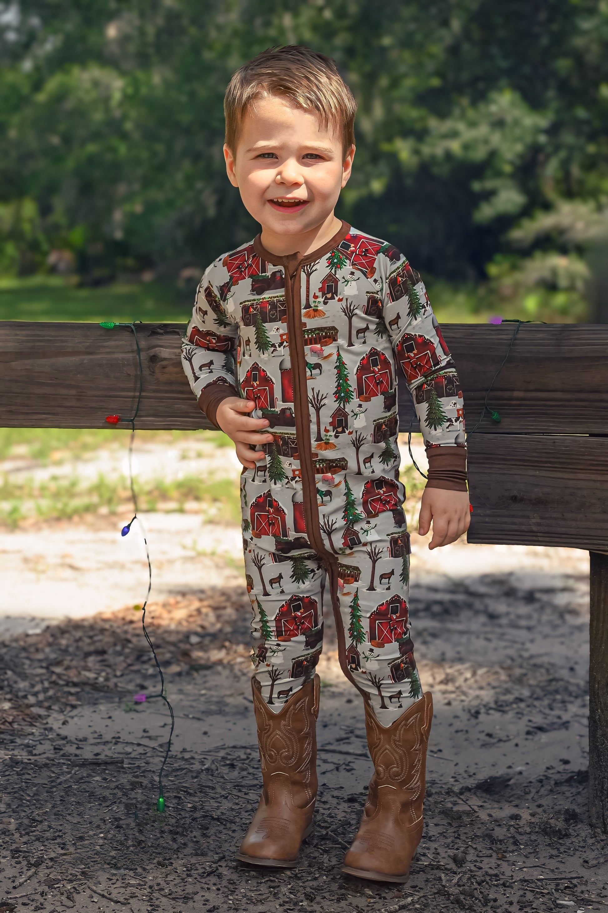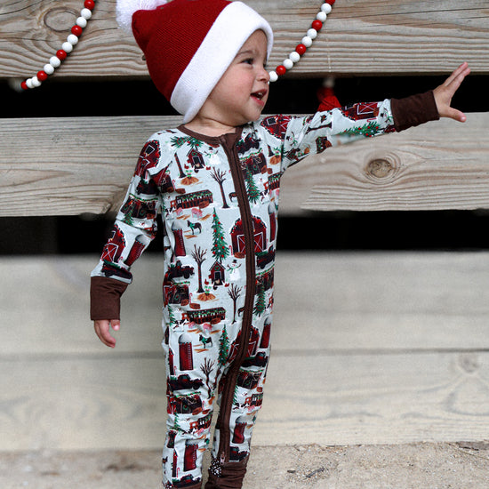 This Christmas farm print is bringing all the epic holiday vibes to the barnyard! Little dudes/dudettes will love this rad winter wonderland filled with classic red barns, cozy farmhouses, and festive farm animals getting into the Christmas spirit. Featuring cool vintage red pickup trucks hauling xmas trees, adorable farm animals like cows, pigs, chickens all bundled up for winter and cheery snowmen. This design is perfect for kids who love animals, farm life, and all the cozy vibes of a country Christmas!