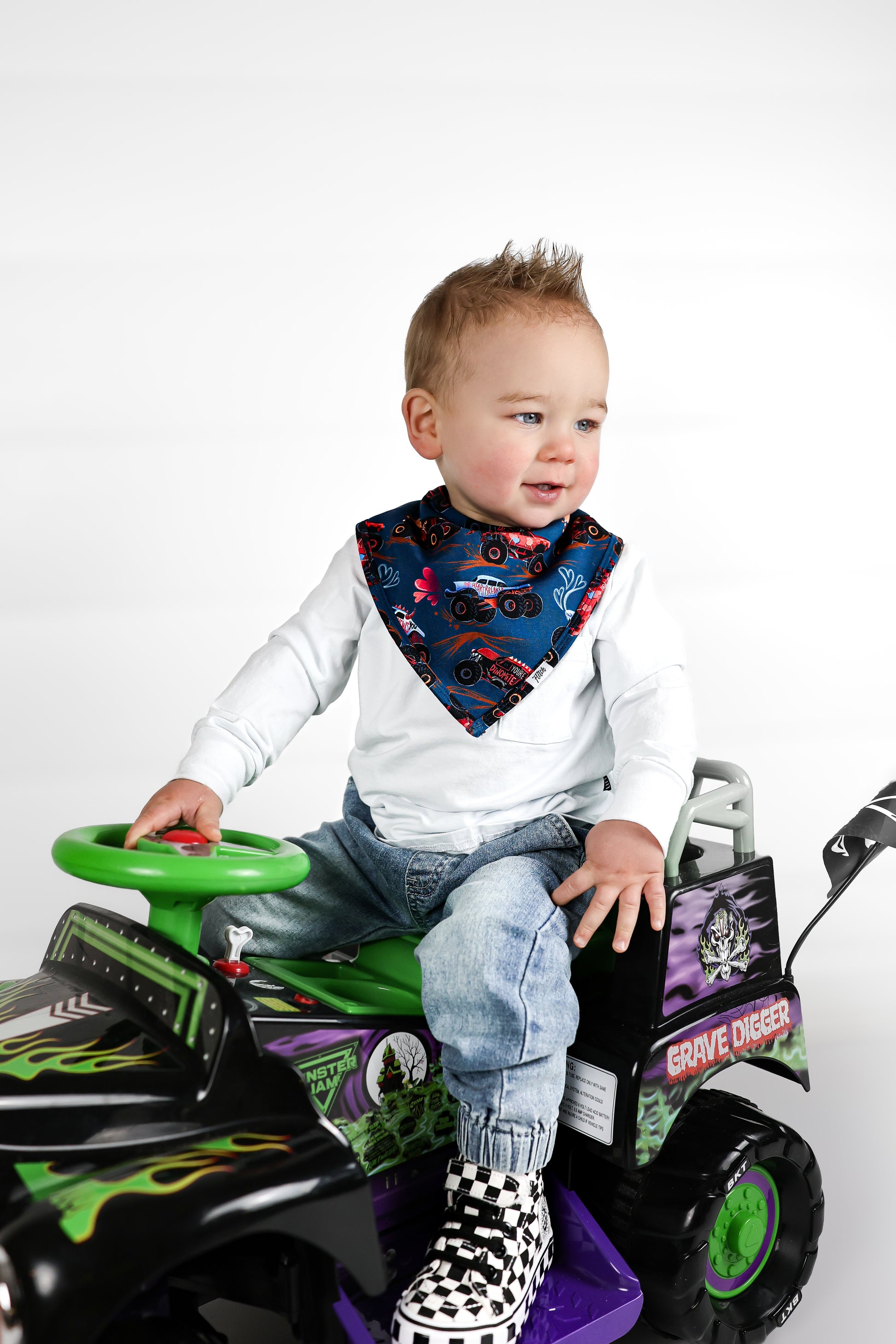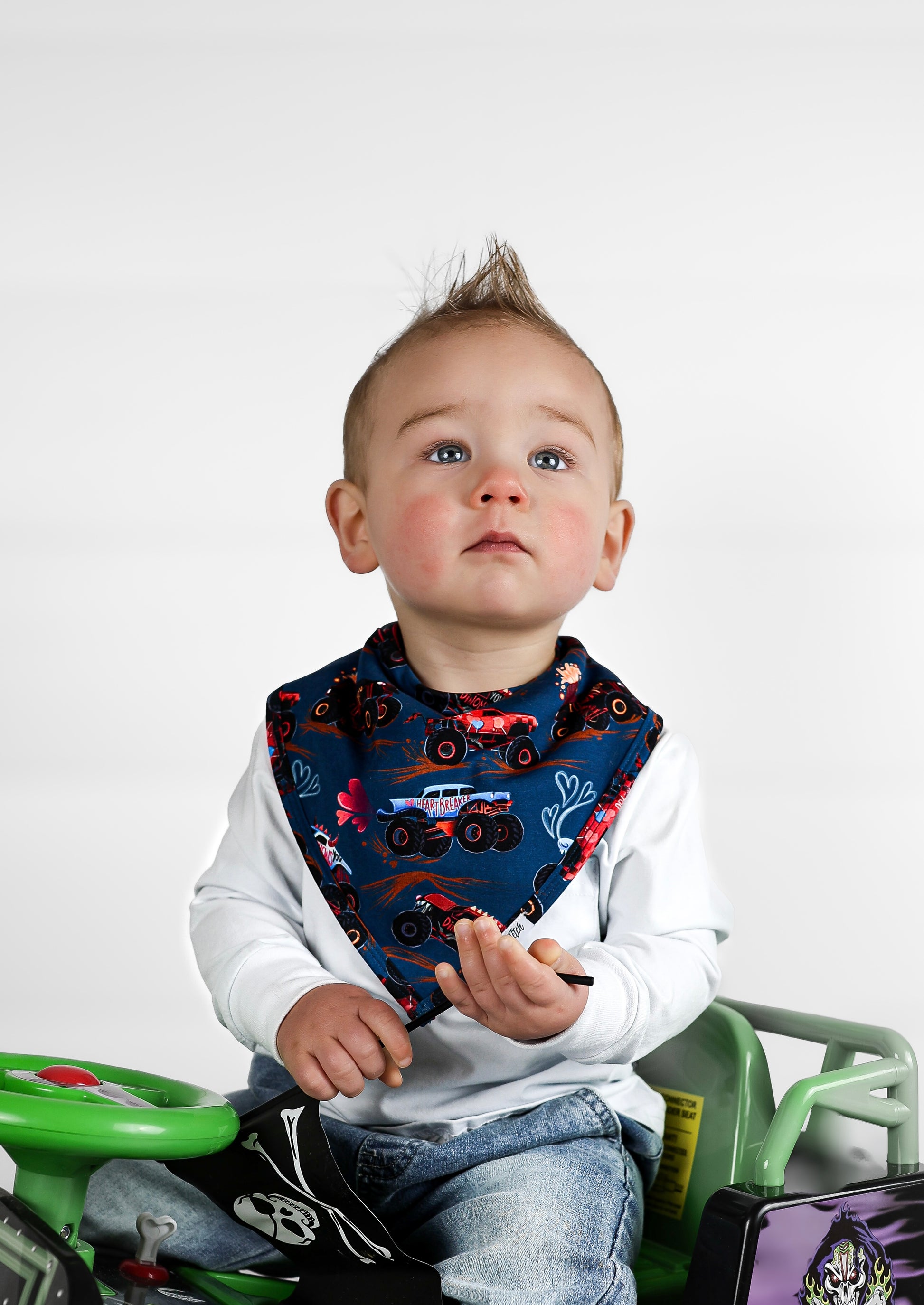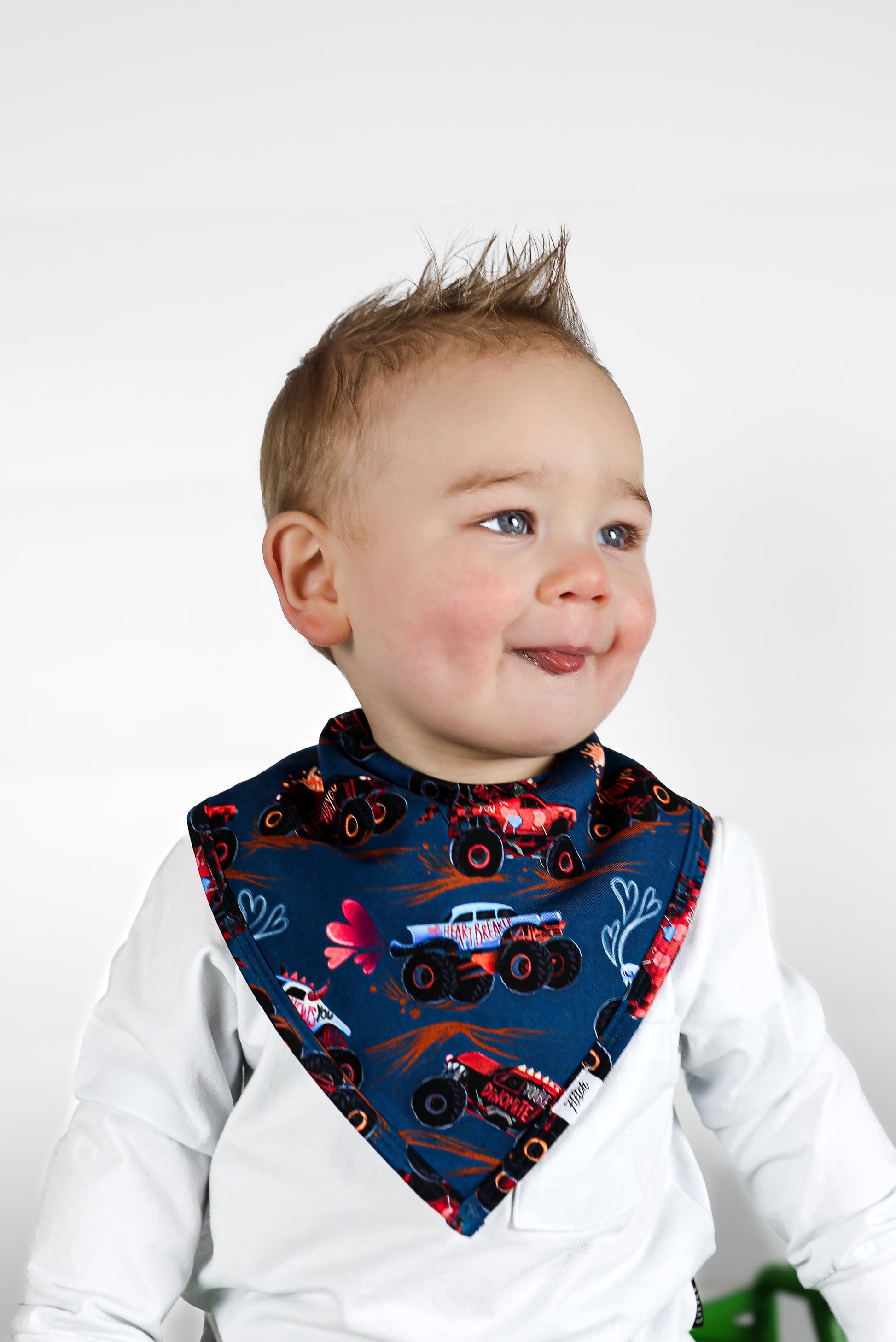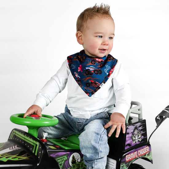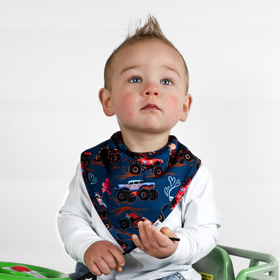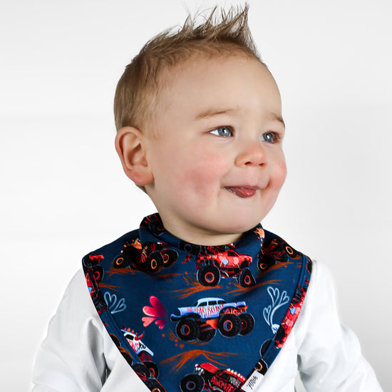Feel the love in our print that features monster trucks zoomin’ with lots of love to chew on in a deep blue background adorned in hearts. Trucks and big wheels adorn this Valentine's print made perfect for your motor-obsessed kiddo. Zoom in this epic car print with hearts full of love. I Chews You dude!