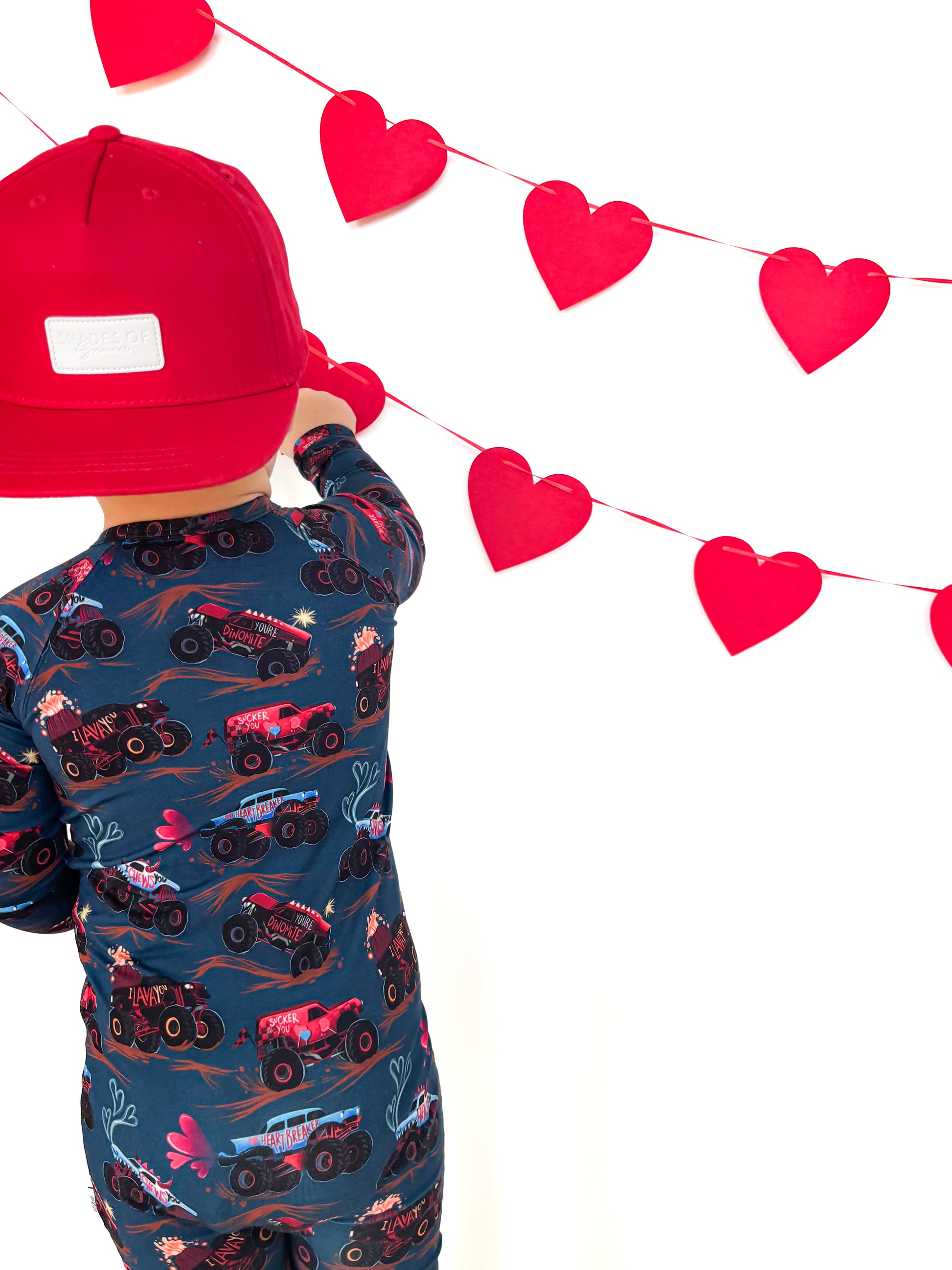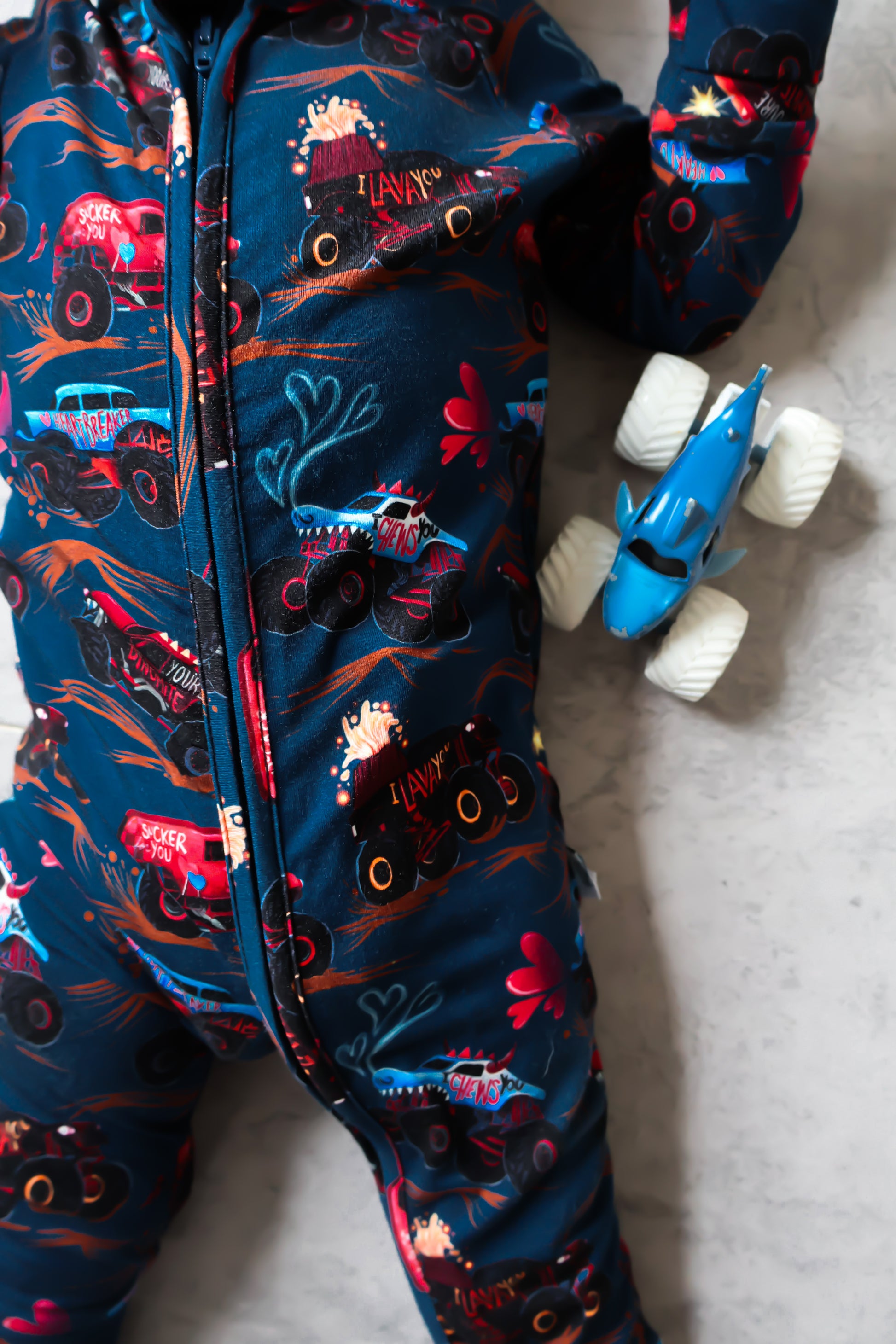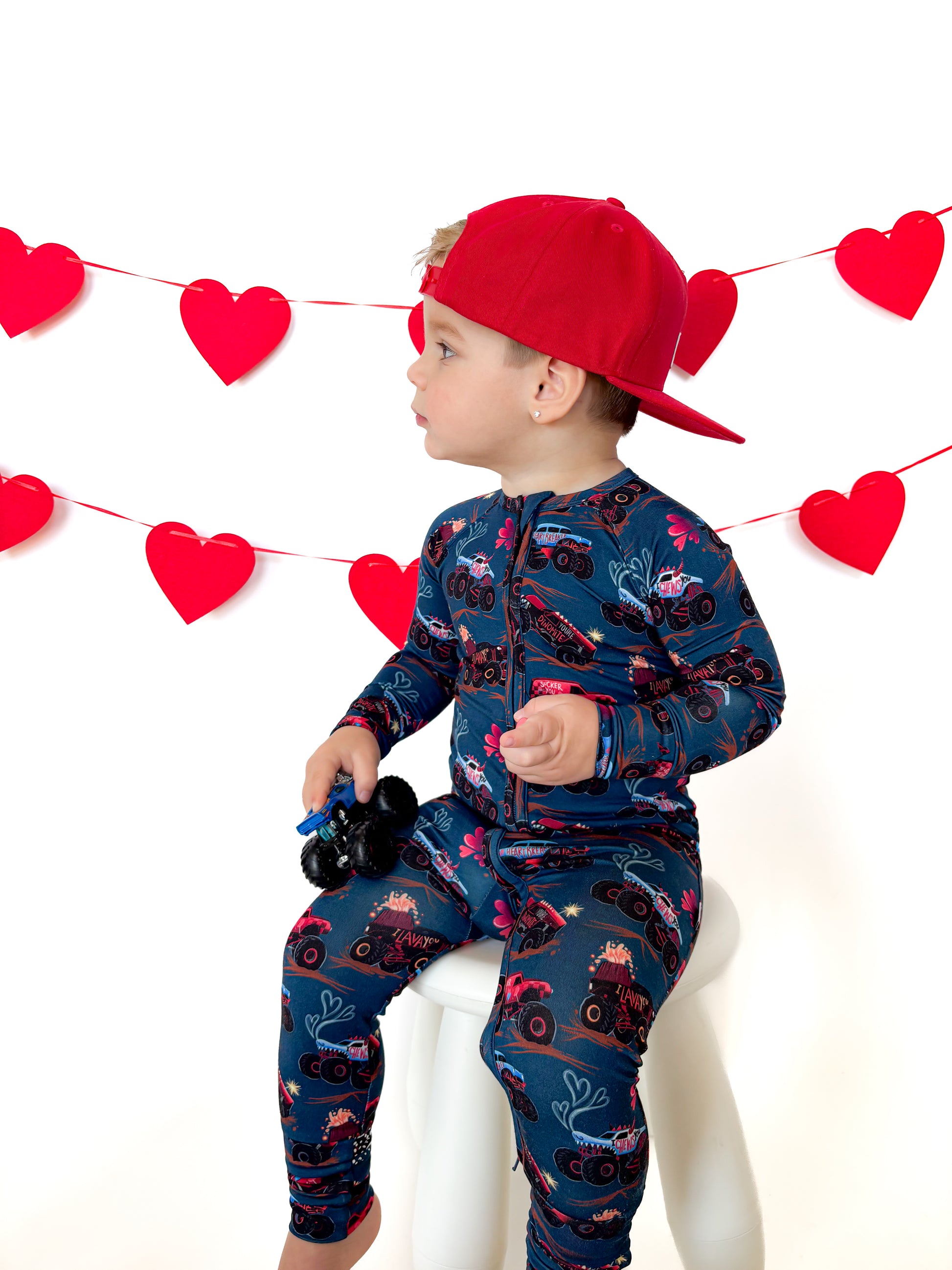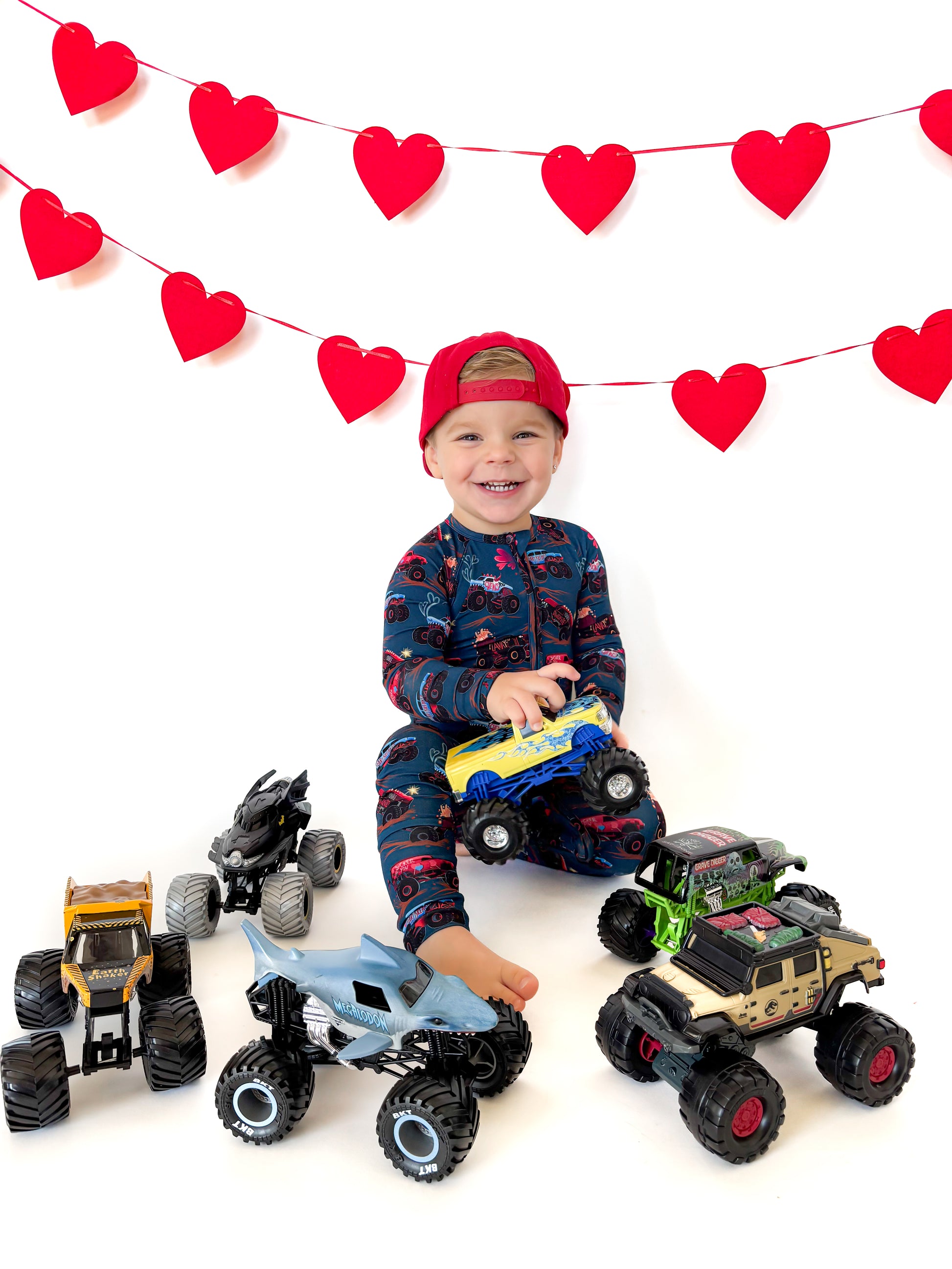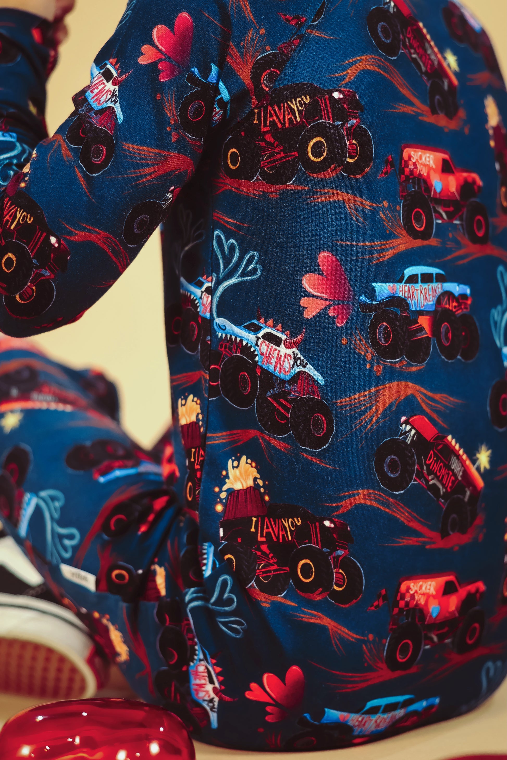 Feel the love in our print that features monster trucks zoomin’ with lots of love to chew on in a deep blue background adorned in hearts.
