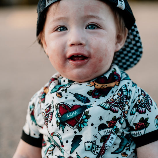 Rad ink and love for mama! This vintage tattoo print celebrates moms with classic tat art style. Bold red hearts wrapped in "MOM" and "MAMA" banners show that forever kind of love - the tattoo parlor way! Turquoise swallows soar between blooming flowers and skull moths while lucky dice roll alongside bird feathers and vibrant florals. It's old-school tattoo shop meets Mother's Day tribute - because mama's love is permanent, powerful, and totally legendary. Perfect for mamas and their little ones who appreciate rad art and unconditional mama love!