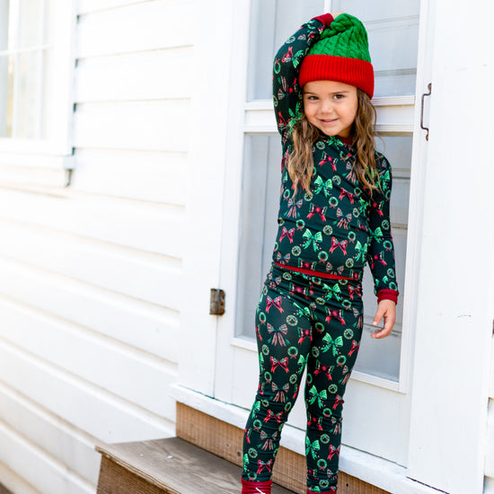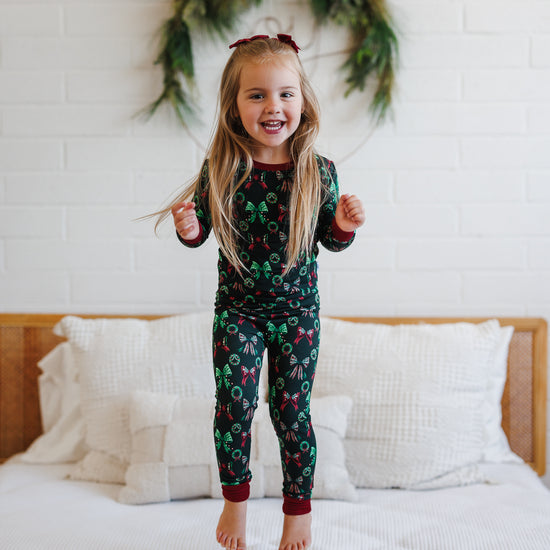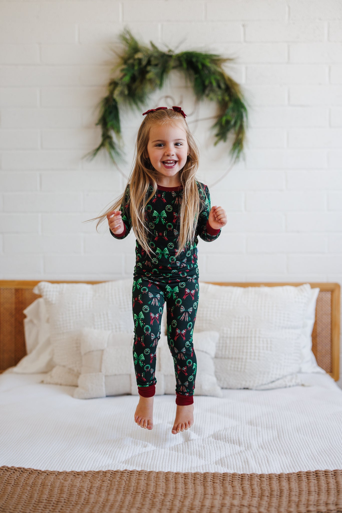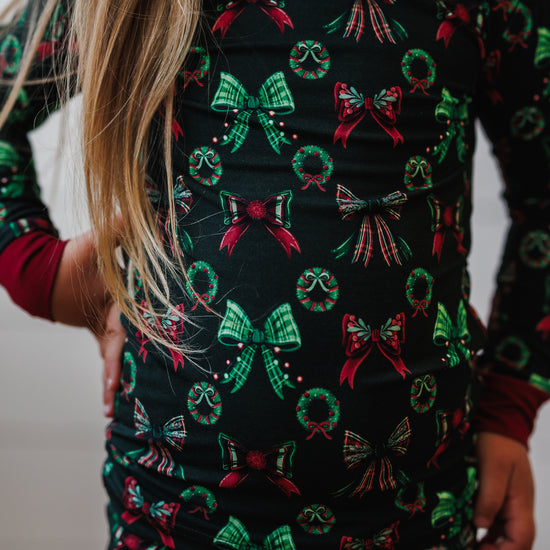 This print is serving the Christmas classics that'll have your fam feeling fancy & festive! Featuring bows that are perfect for girls who love the traditional side of Christmas, this design is packed with festive wreaths adorned with bright red ribbons and classical holiday wreaths that give off those old school Christmas vibes.