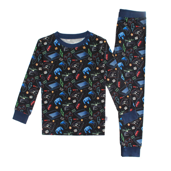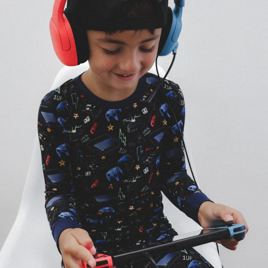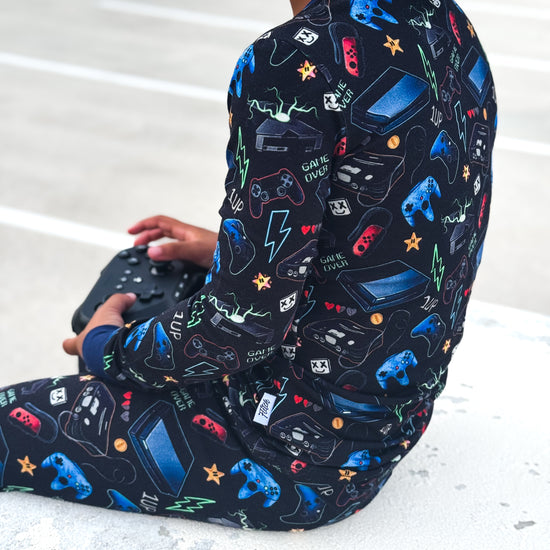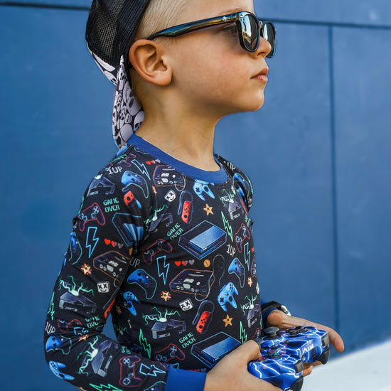Game on! This totally epic video game print is loaded with awesome controllers, rad consoles, and cool power-up stars scattered across a black backdrop. With "Game Over" vibes, lightning bolts, and hearts for extra lives, this arcade design is absolutely perfect for any little gamer ready to level up their style and conquer the most retro gaming adventures!