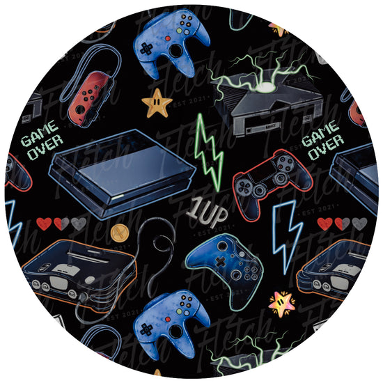 Game on! This totally epic video game print is loaded with awesome controllers, rad consoles, and cool power-up stars scattered across a black backdrop. With "Game Over" vibes, lightning bolts, and hearts for extra lives, this arcade design is absolutely perfect for any little gamer ready to level up their style and conquer the most retro gaming adventures!