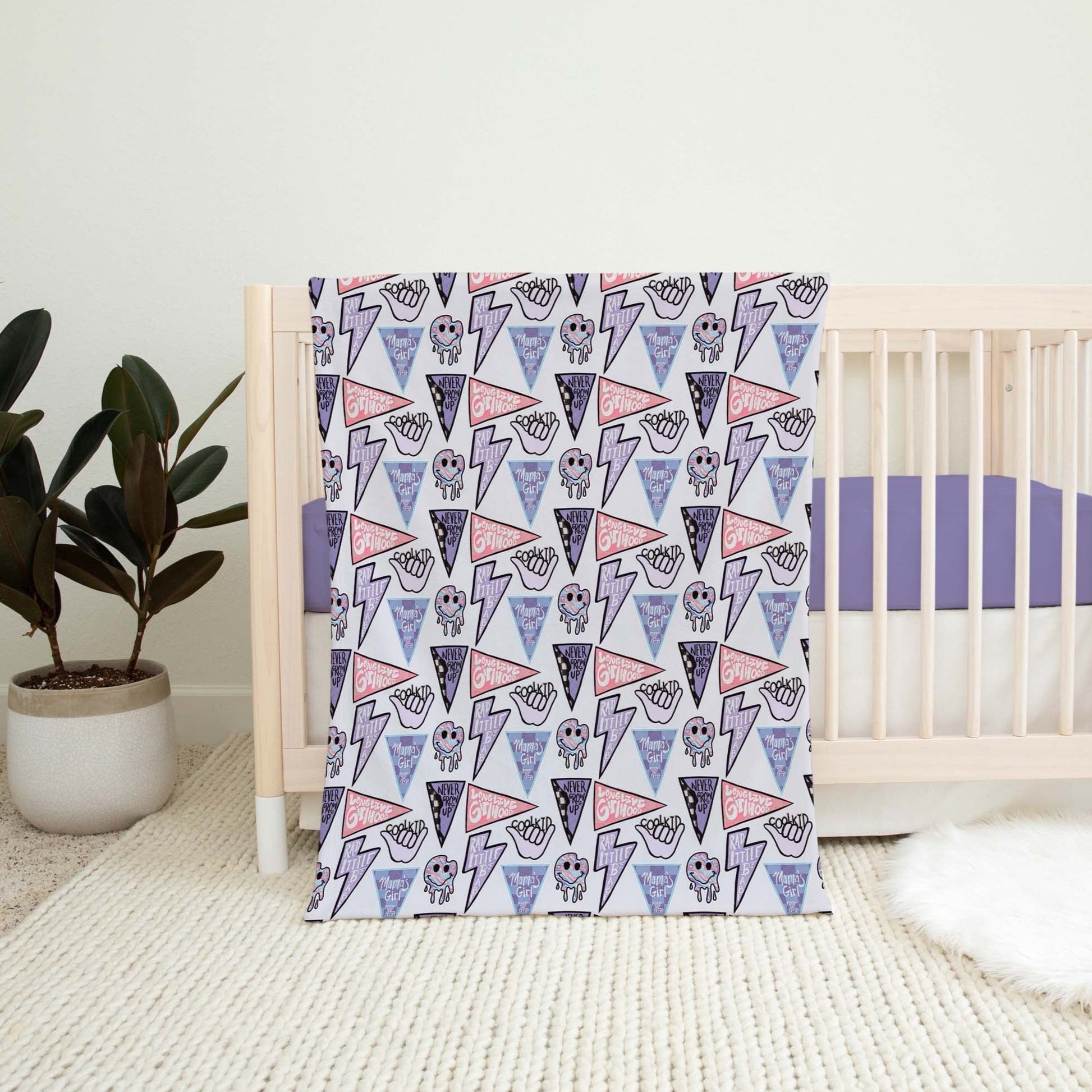 A Rad Print Is Perfect For Your Tough Girl! Featuring Word Bubbles on an Off-White Fabric That Say Things Like "Rad Little Babe" or "Never Grow Up".