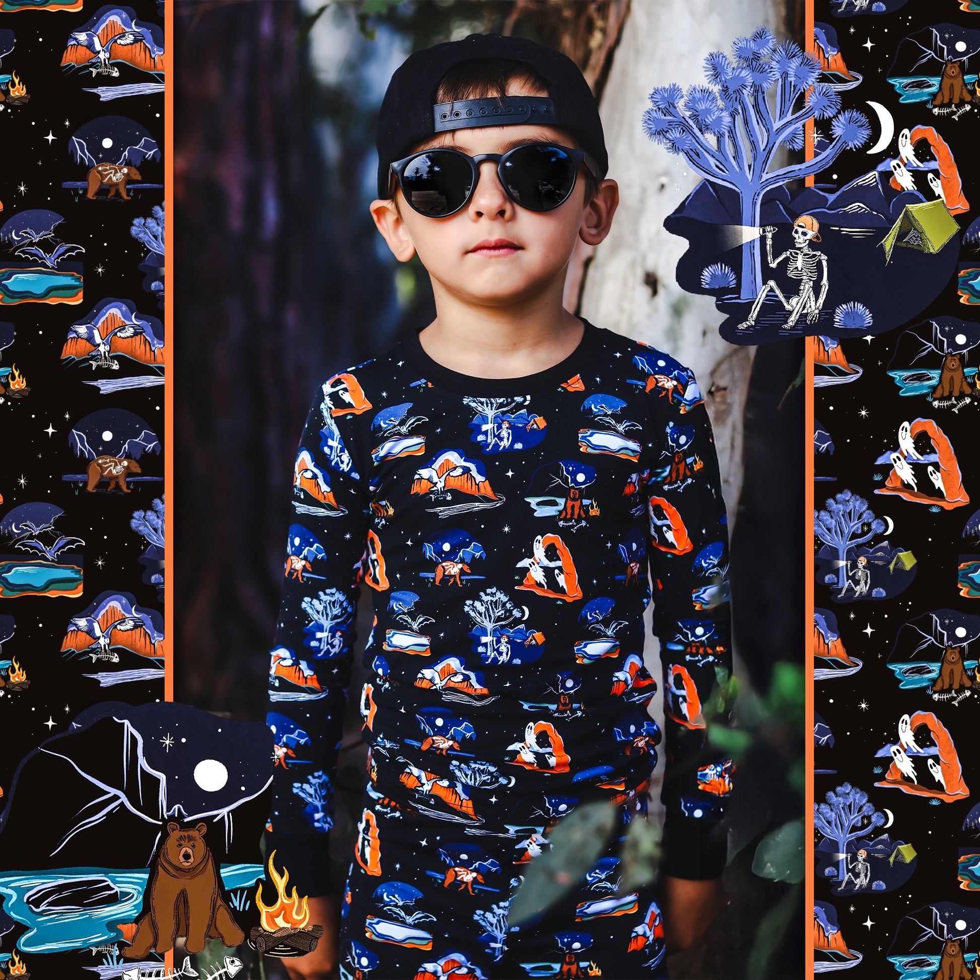 Totally adventurous & spooky vibes to haunt you with this glow in the dark print. It’s ghostly good at midnight with major camp energy & friendly creatures, we think. Featuring cool skeletons, bears, birds & spooky caves with ghosts, the mysterious wilderness adventures of this design are perfect for any little explorer ready to roam under the stars at bedtime. Glow in the dark for Halloween or any ghost story camp out.