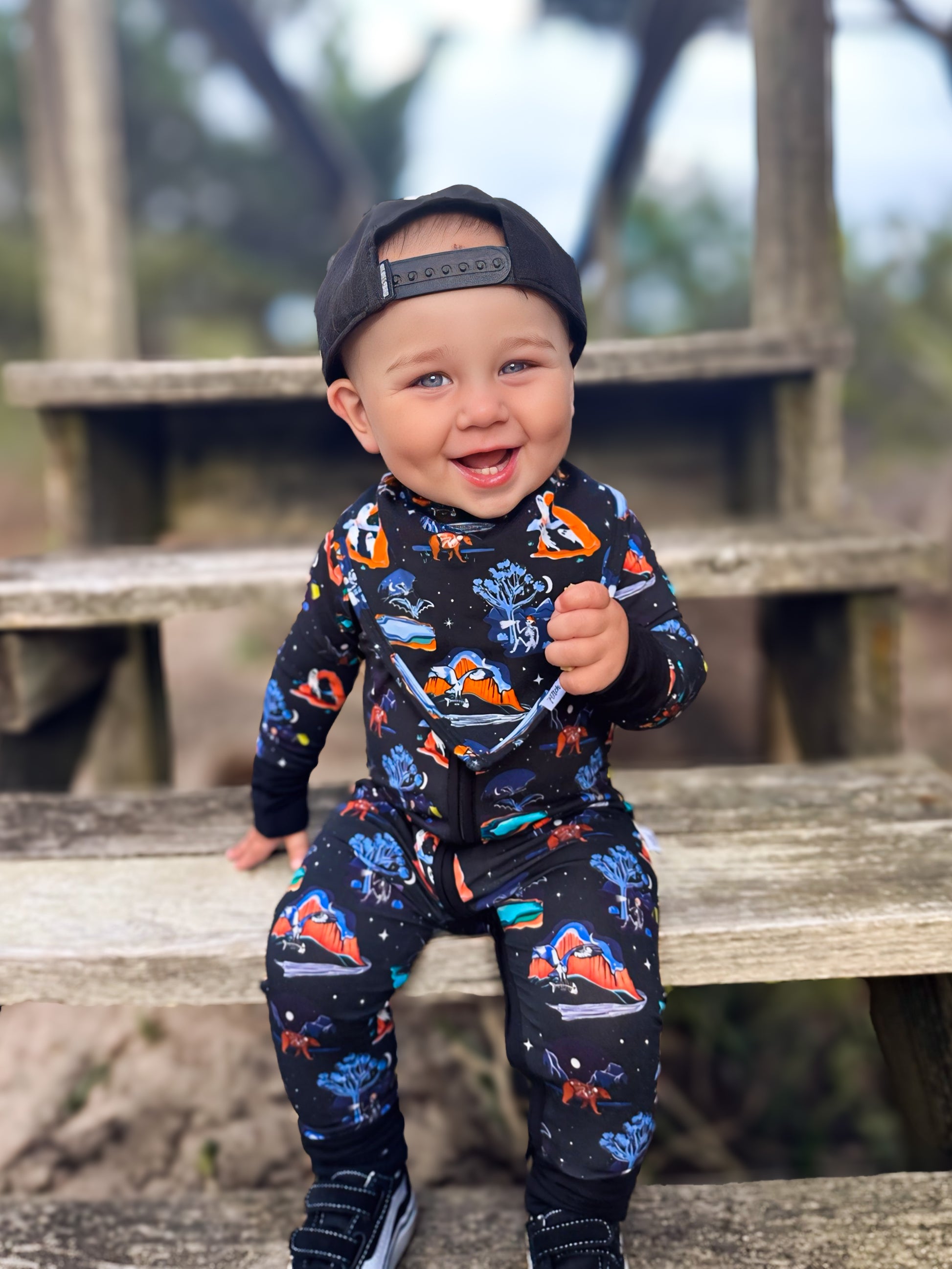 Totally adventurous & spooky vibes to haunt you with this glow in the dark print. It’s ghostly good at midnight with major camp energy & friendly creatures, we think. Featuring cool skeletons, bears, birds & spooky caves with ghosts, the mysterious wilderness adventures of this design are perfect for any little explorer ready to roam under the stars at bedtime. Glow in the dark for Halloween or any ghost story camp out.