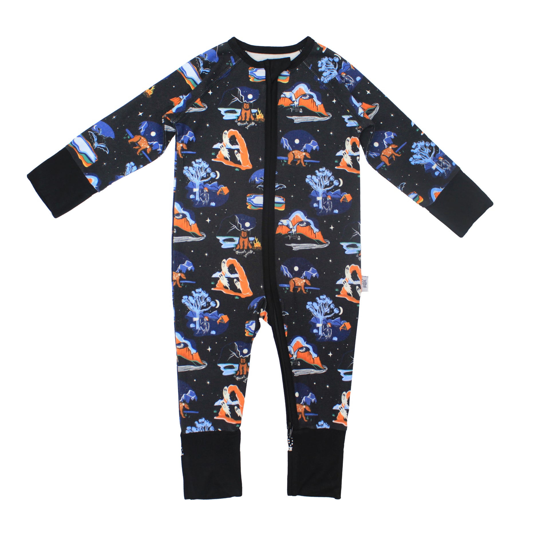 Totally adventurous & spooky vibes to haunt you with this glow in the dark print. It’s ghostly good at midnight with major camp energy & friendly creatures, we think. Featuring cool skeletons, bears, birds & spooky caves with ghosts, the mysterious wilderness adventures of this design are perfect for any little explorer ready to roam under the stars at bedtime. Glow in the dark for Halloween or any ghost story camp out.