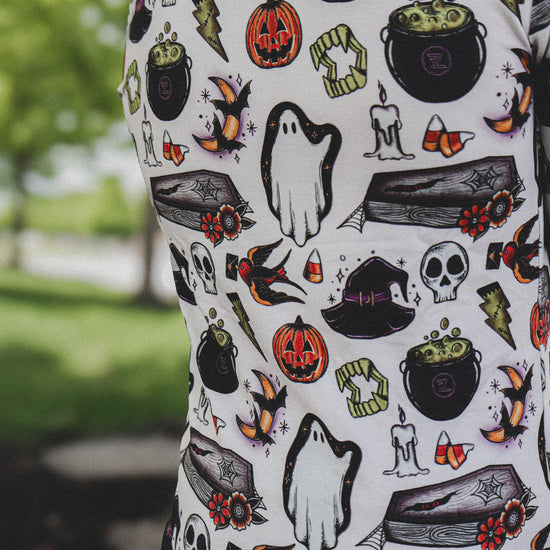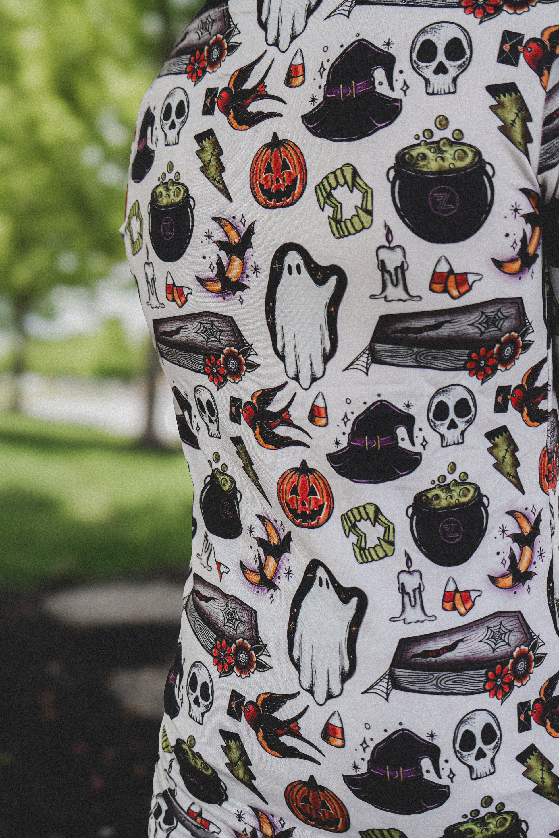 Super rad and mysterious! This design features spooky drawings such as vampire teeth that are fangtatsic, ghosts, skulls, jack-o-lanterns and more to be discovered. It's got that scary good Halloween vibe.