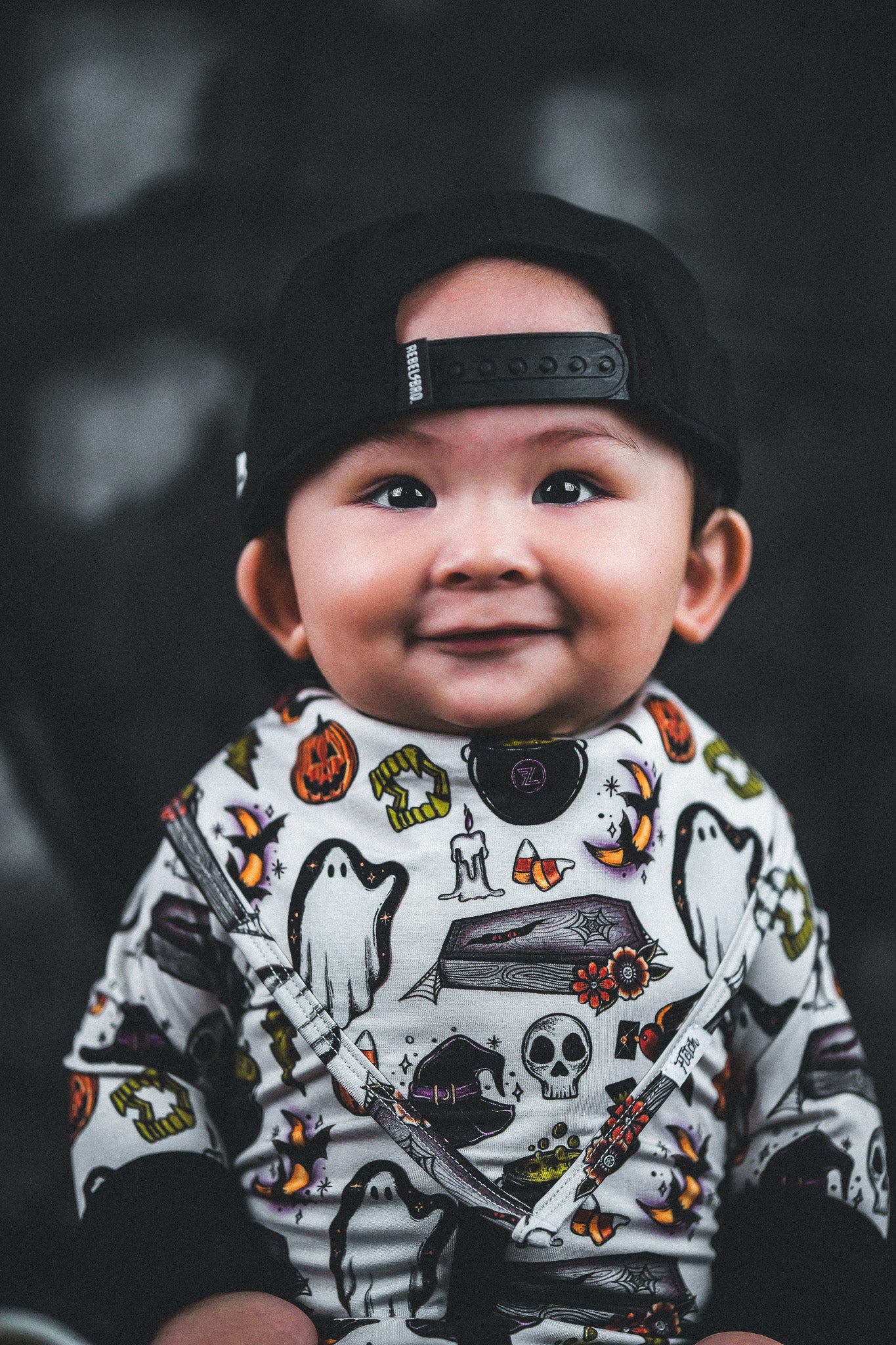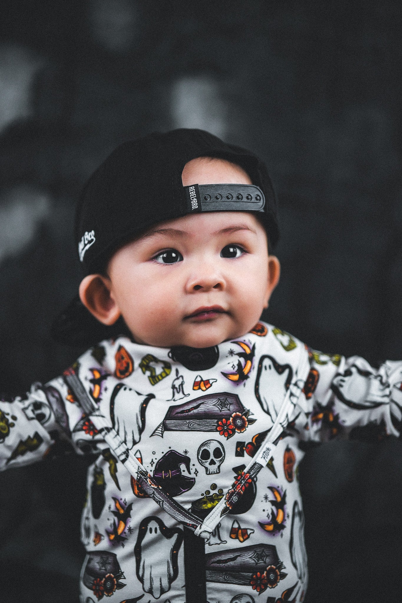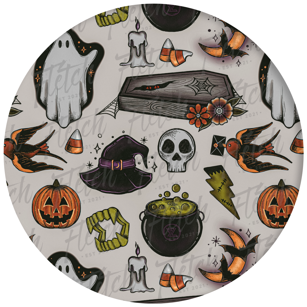 Super rad and mysterious! This design features spooky drawings such as vampire teeth that are fangtatsic, ghosts, skulls, jack-o-lanterns and more to be discovered. It's got that scary good Halloween vibe.