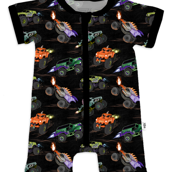 These monster truck pajamas are straight-up monstrously epic! Packed with rad monster vehicles in awesome colors - pumpkin cars, green machines with brains, purple powerhouses and many more in these rad monster truck PJs. Every truck looks ready to crush it and dominate the dirt track! It's scary cool for Halloween.