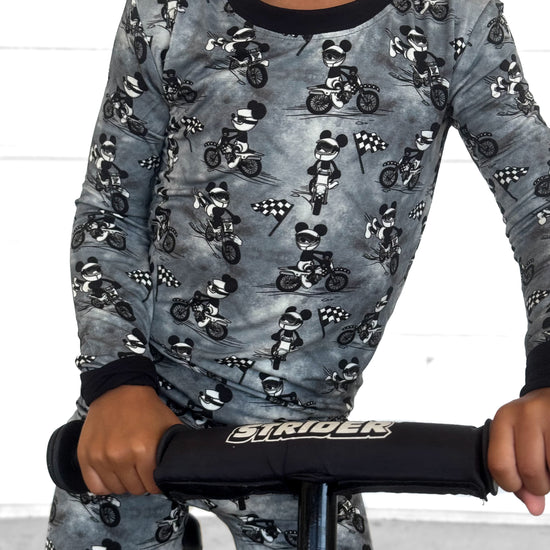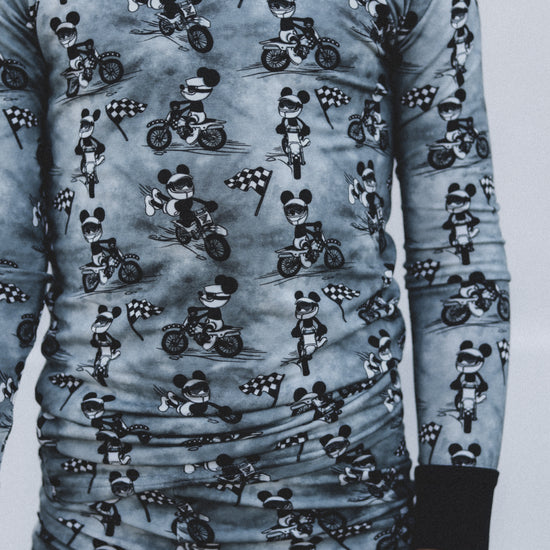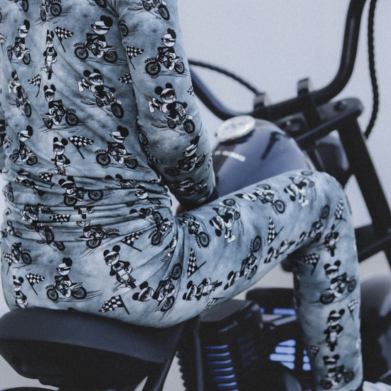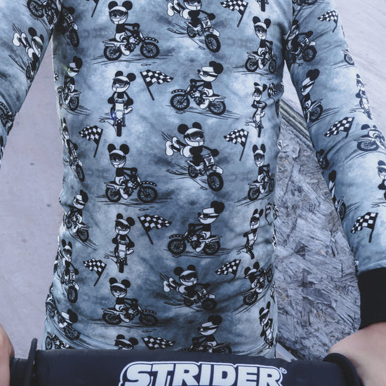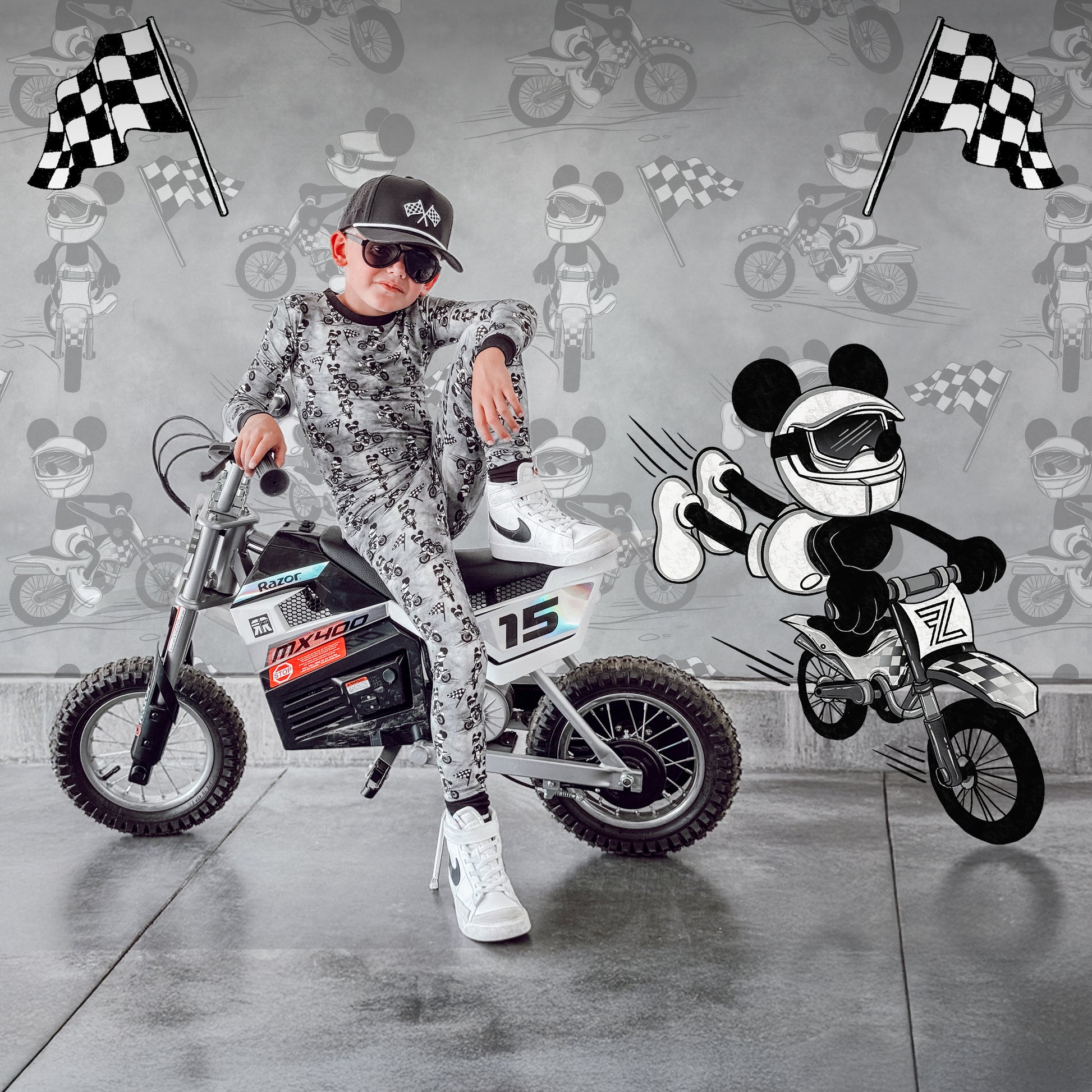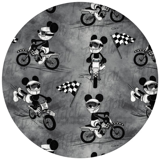Rev up for rad adventures! This motor print features your favorite cartoon mouse rider tearing up the track on a fast dirtbike with checkers. Motorcycles, checkered flags, helmets, goggles, & high-speed action make this design epic for any speed racer ready to vroom into the day on 2 wheels!