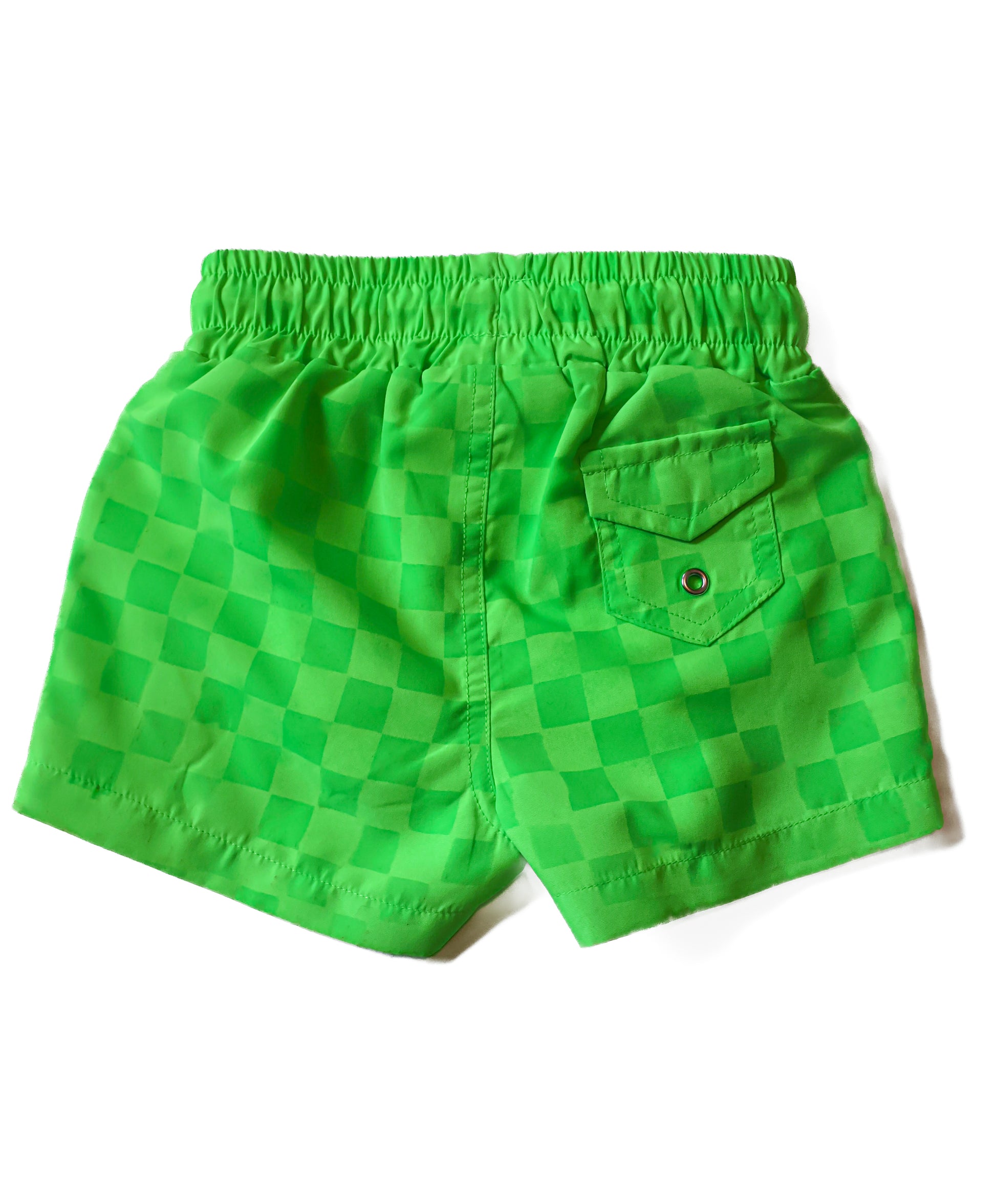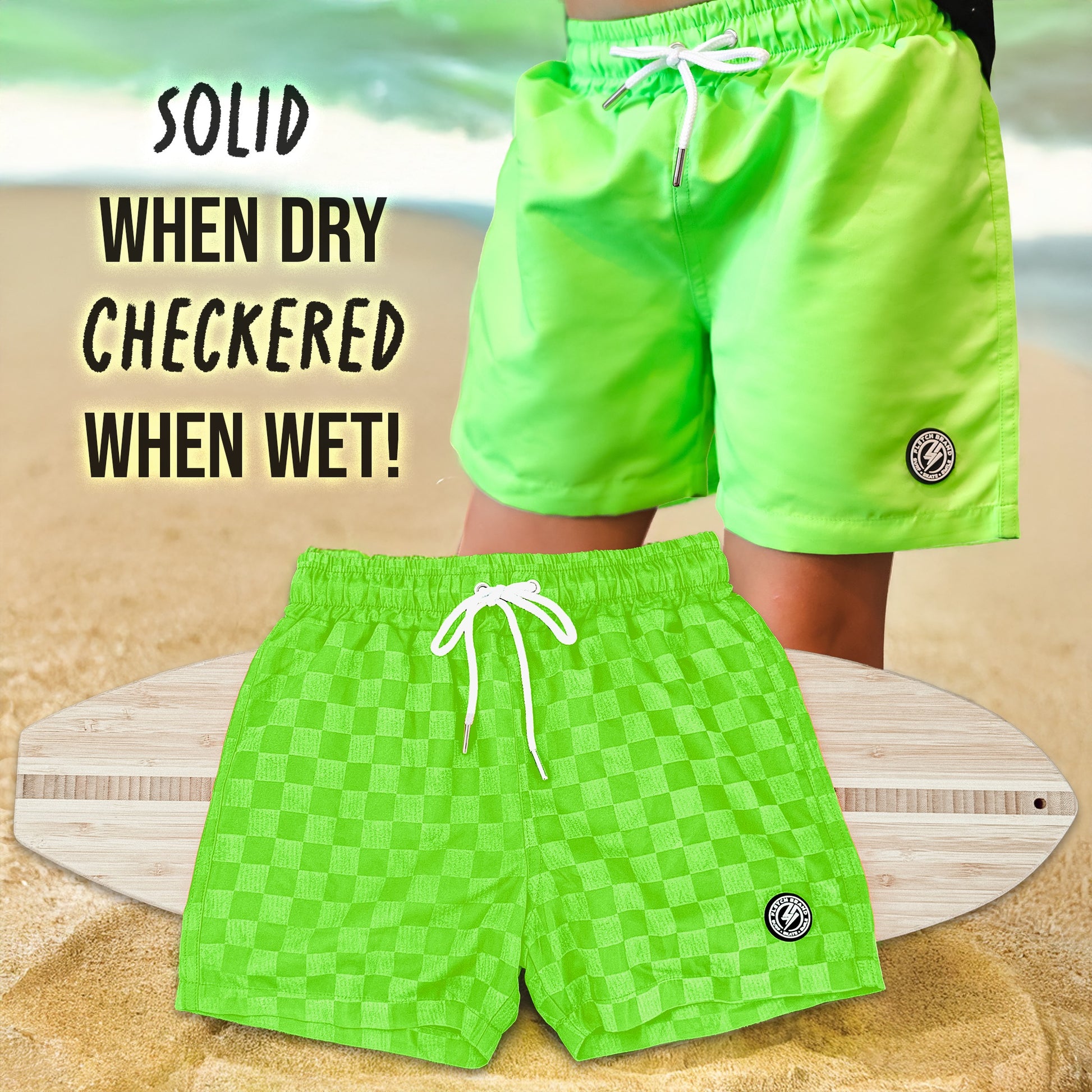 Color changing Neon swim shorts are solid when dry, and turn checkered when wet. Pool or ocean bound surf dudes will love them.