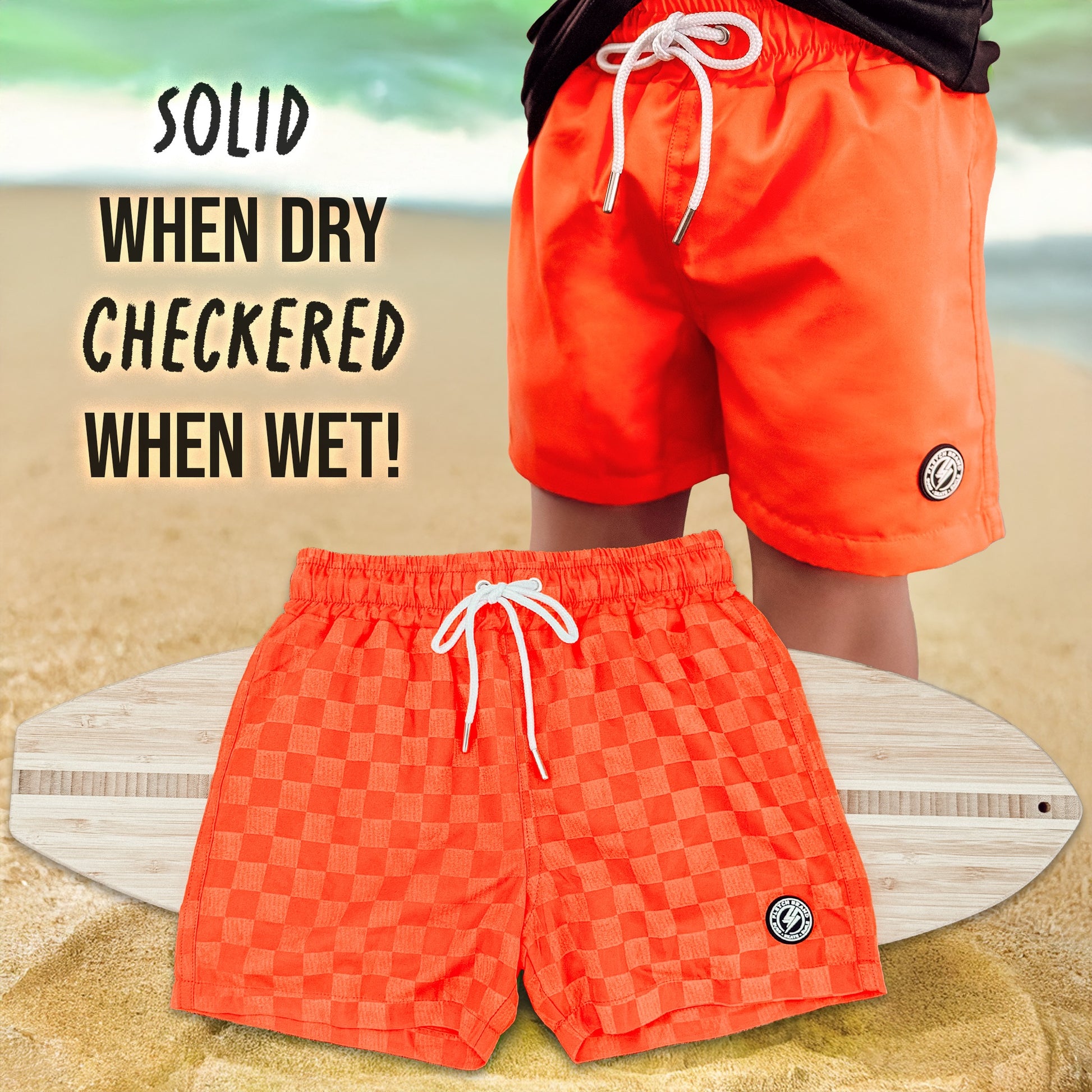 Color changing Neon swim shorts are solid when dry, and turn checkered when wet. Pool or ocean bound surf dudes will love them.