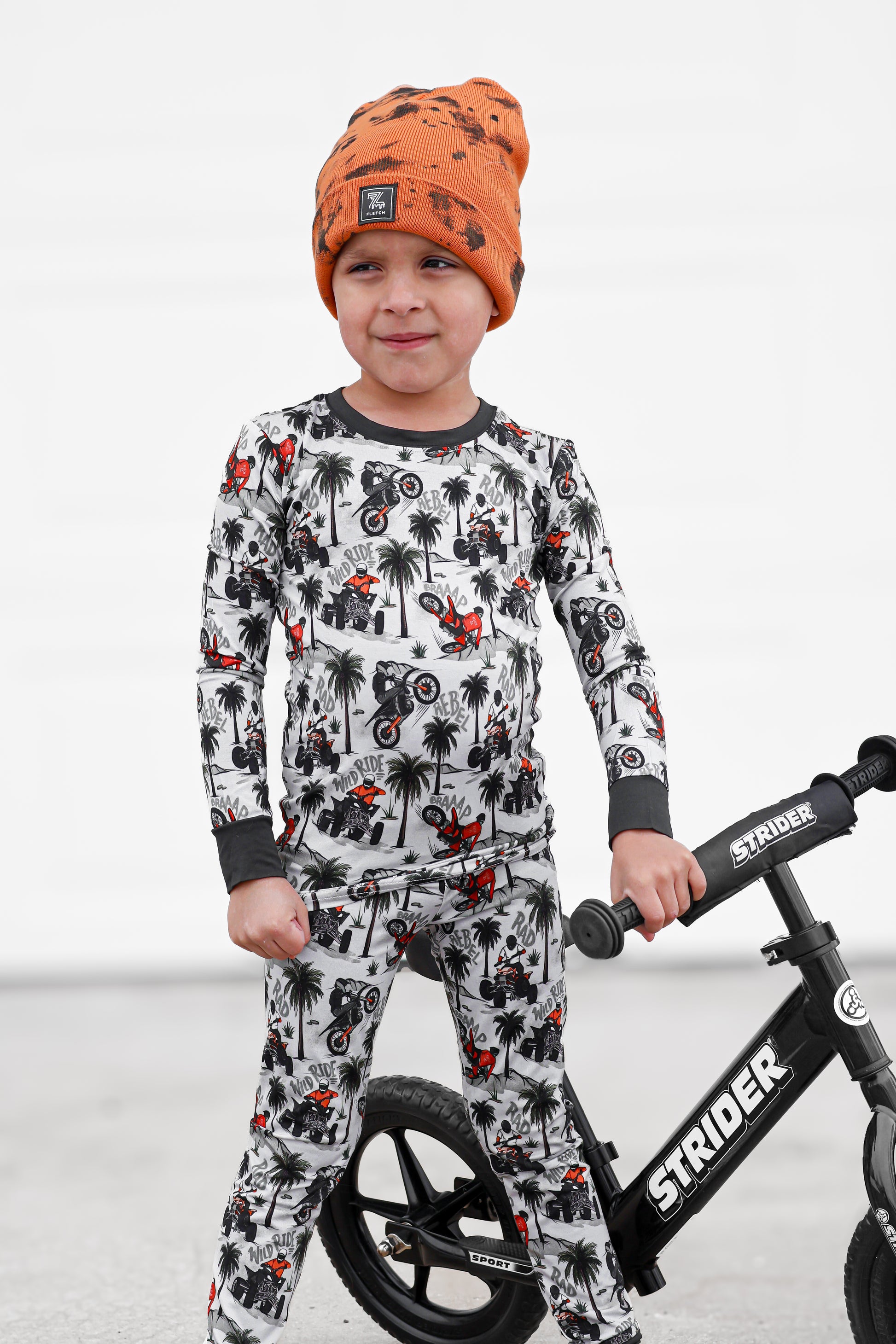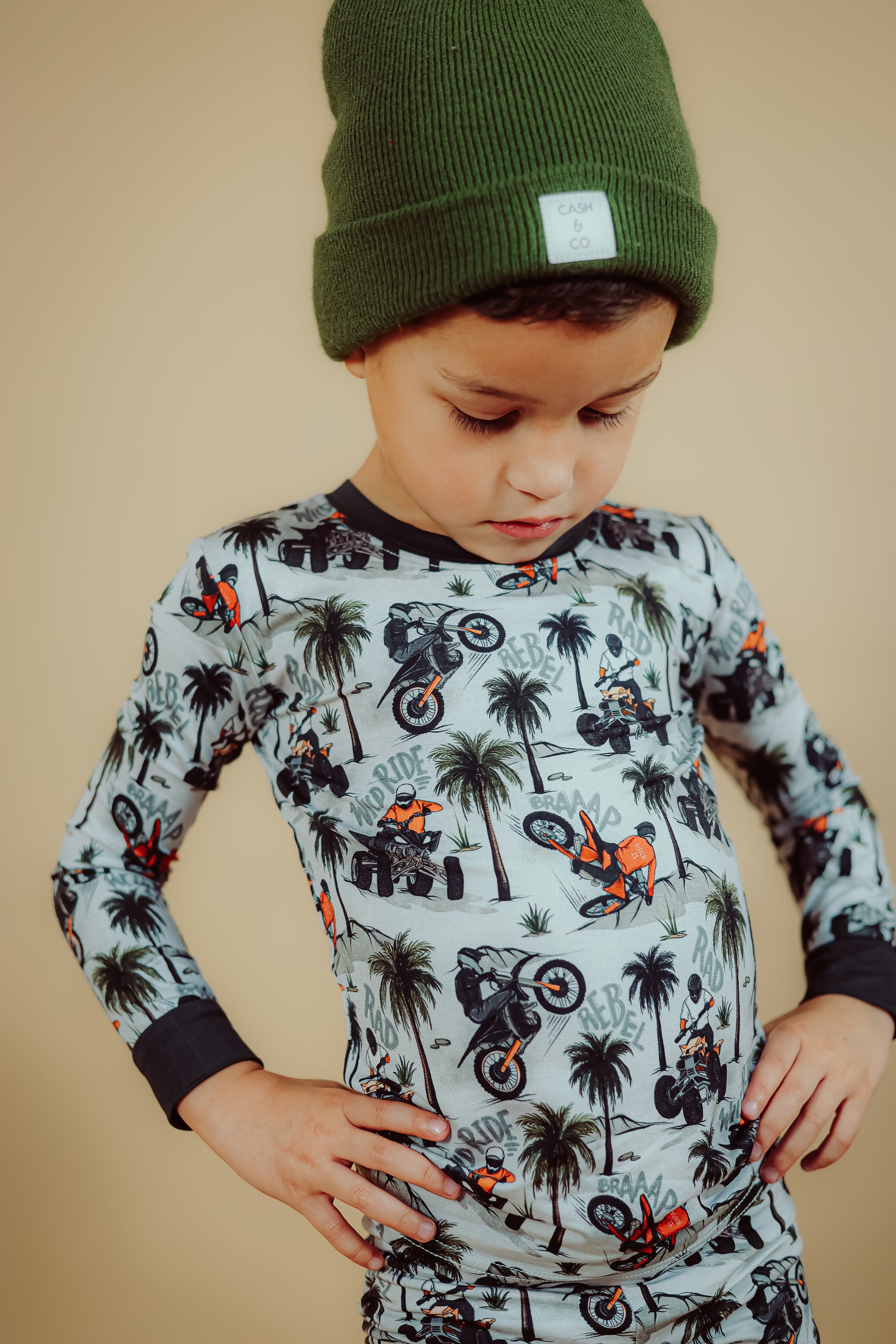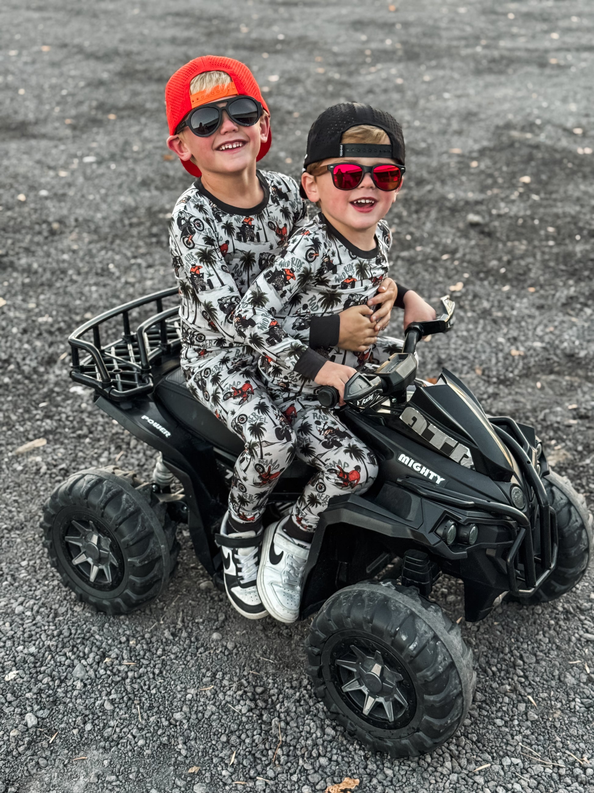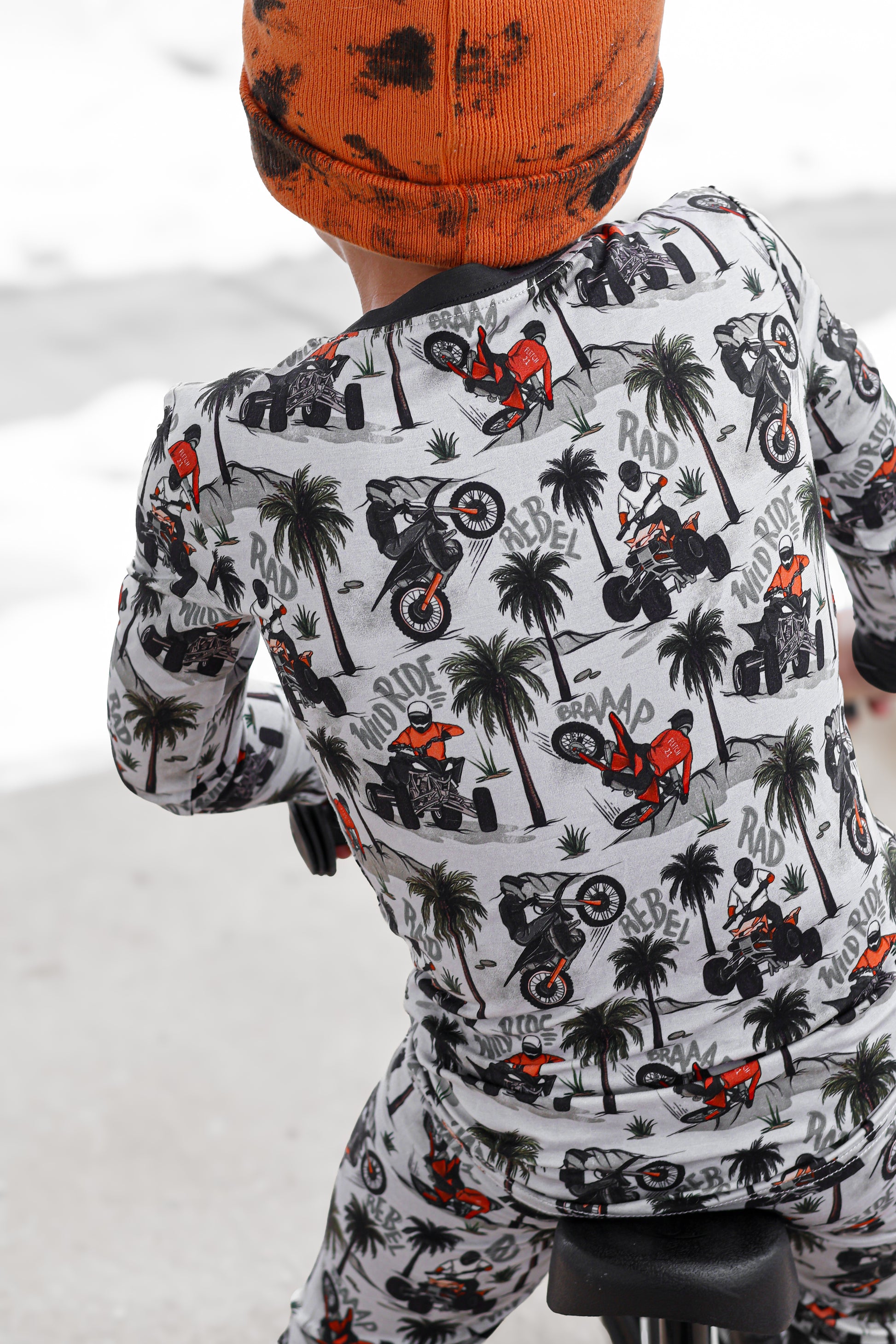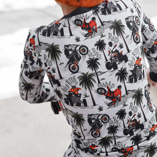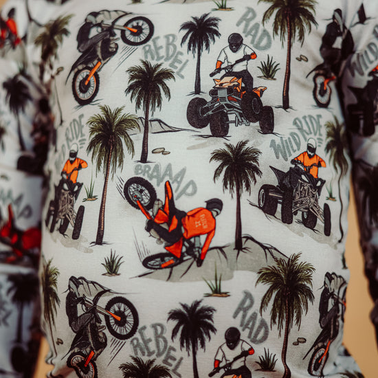 Time to hit the dunes! Rev in "Offroad Rebels" as dirtbikes tear through the desert on ATVs and motorcycles amongst palm trees that create a chill vibe. Riders will catch major air on every jump in this epic motor print. Your kiddo will love these desert vibes - it's all about freedom, adventure, and that rebel attitude. Perfect for little daredevils who crave wide-open spaces, sandy tracks, and the thrill of going totally off road with their dirt bikes. Start your engines dude!