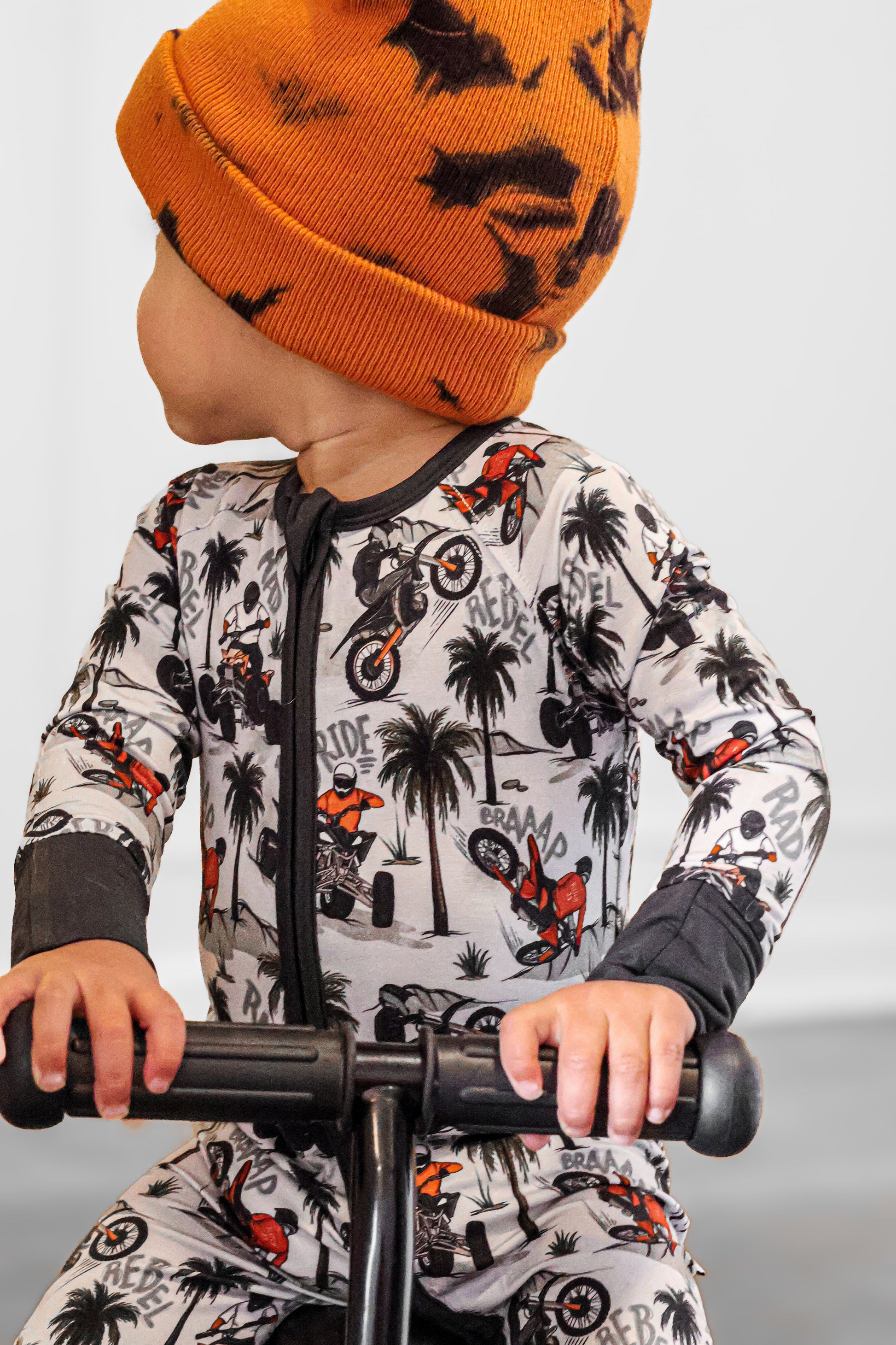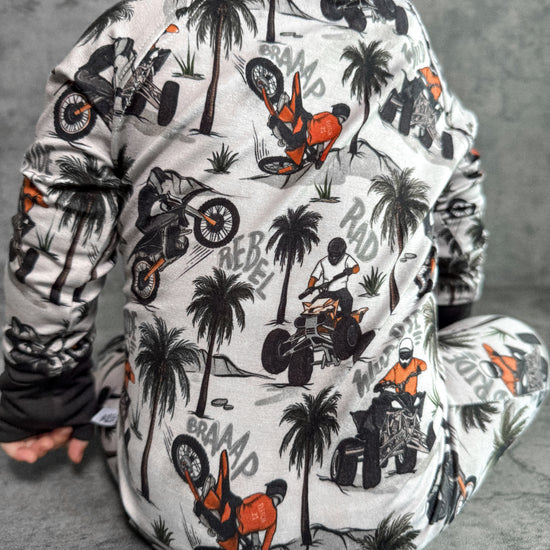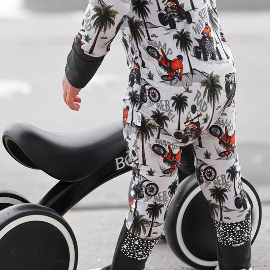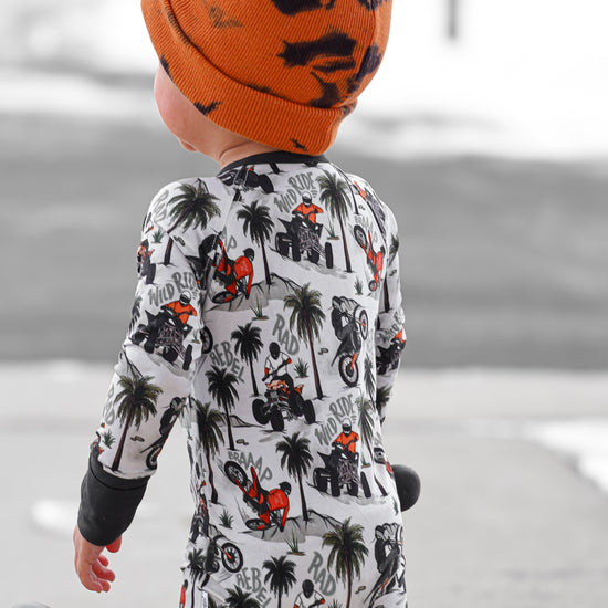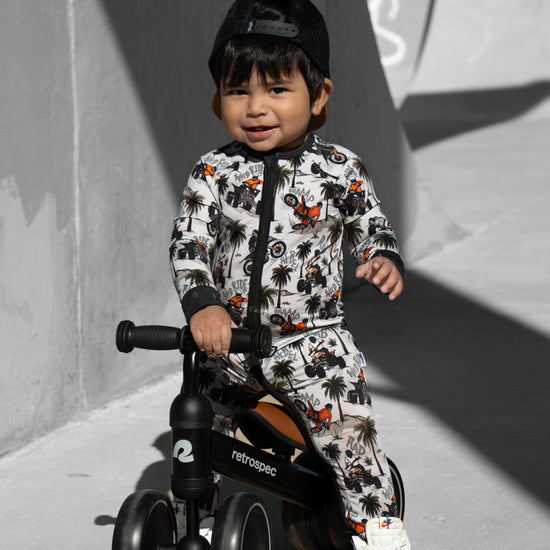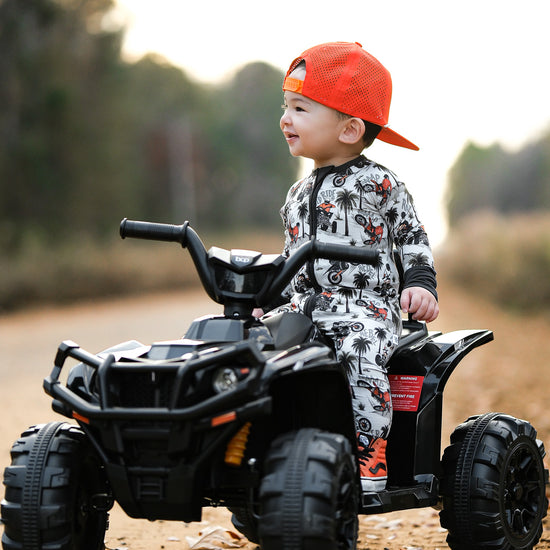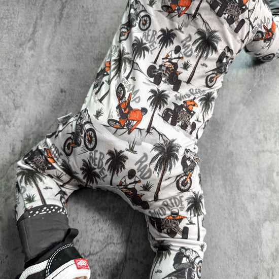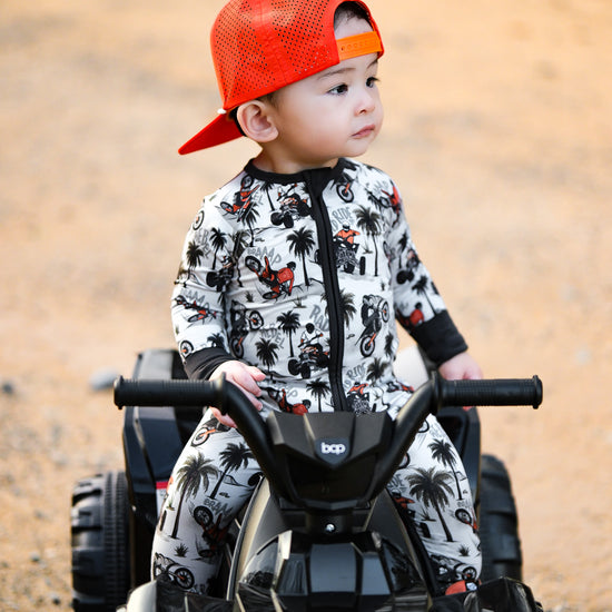 Time to hit the dunes! Rev in "Offroad Rebels" as dirtbikes tear through the desert on ATVs and motorcycles amongst palm trees that create a chill vibe. Riders will catch major air on every jump in this epic motor print. Your kiddo will love these desert vibes - it's all about freedom, adventure, and that rebel attitude. Perfect for little daredevils who crave wide-open spaces, sandy tracks, and the thrill of going totally off road with their dirt bikes. Start your engines dude!