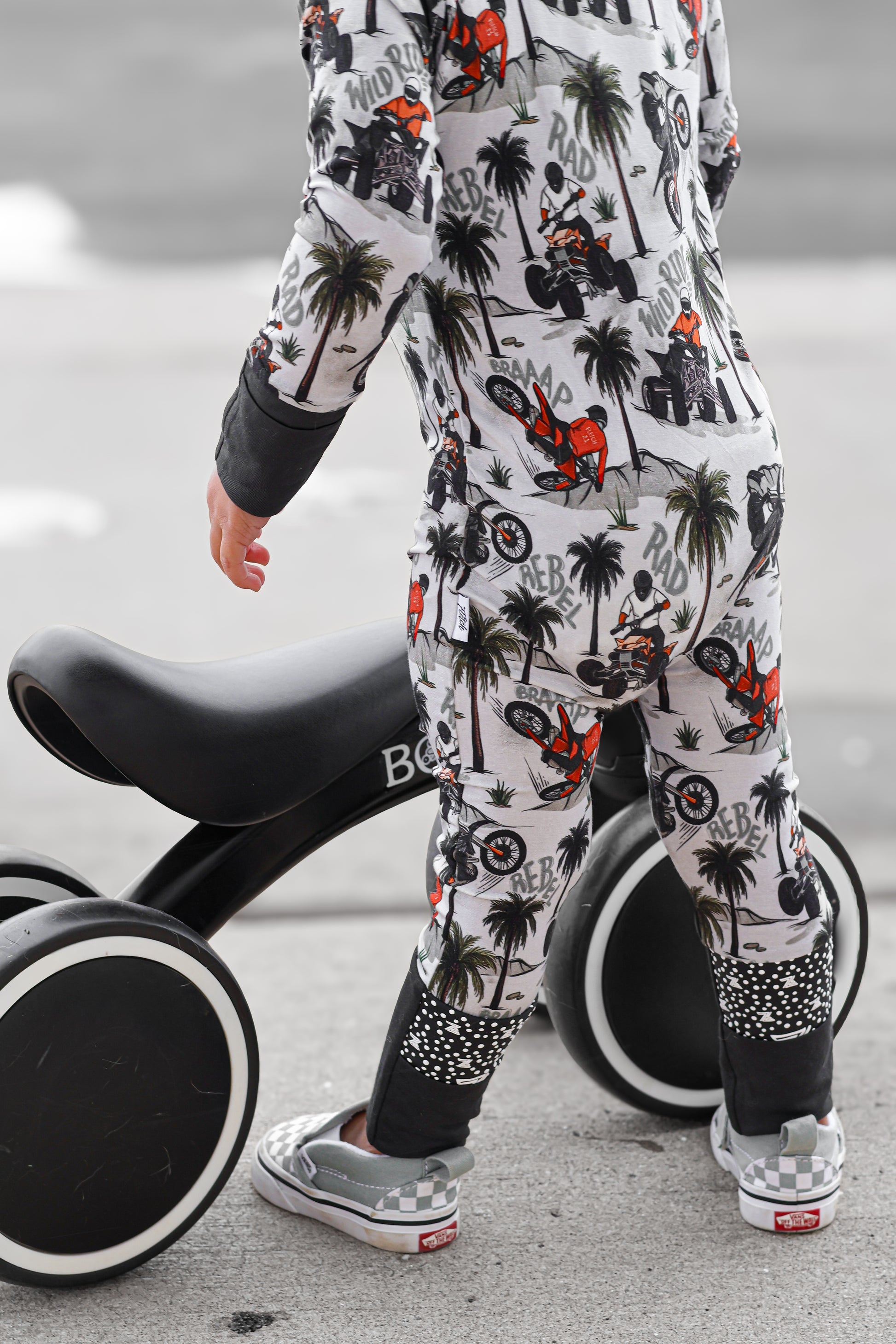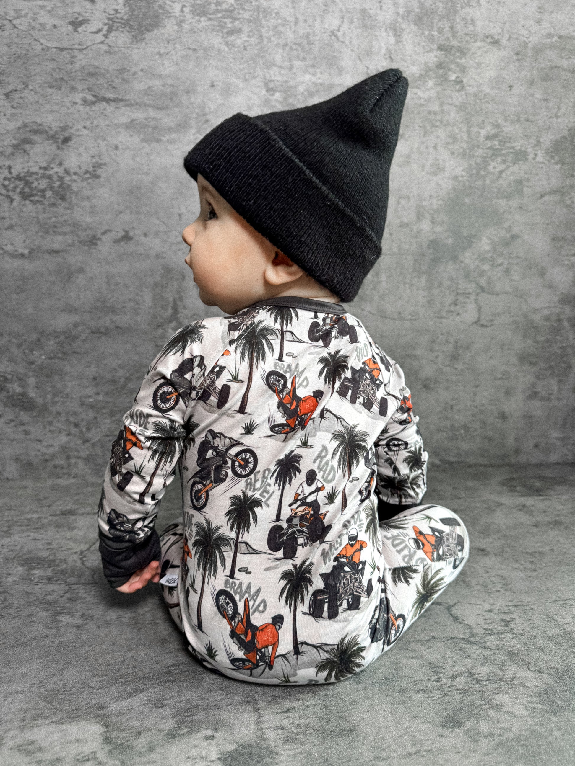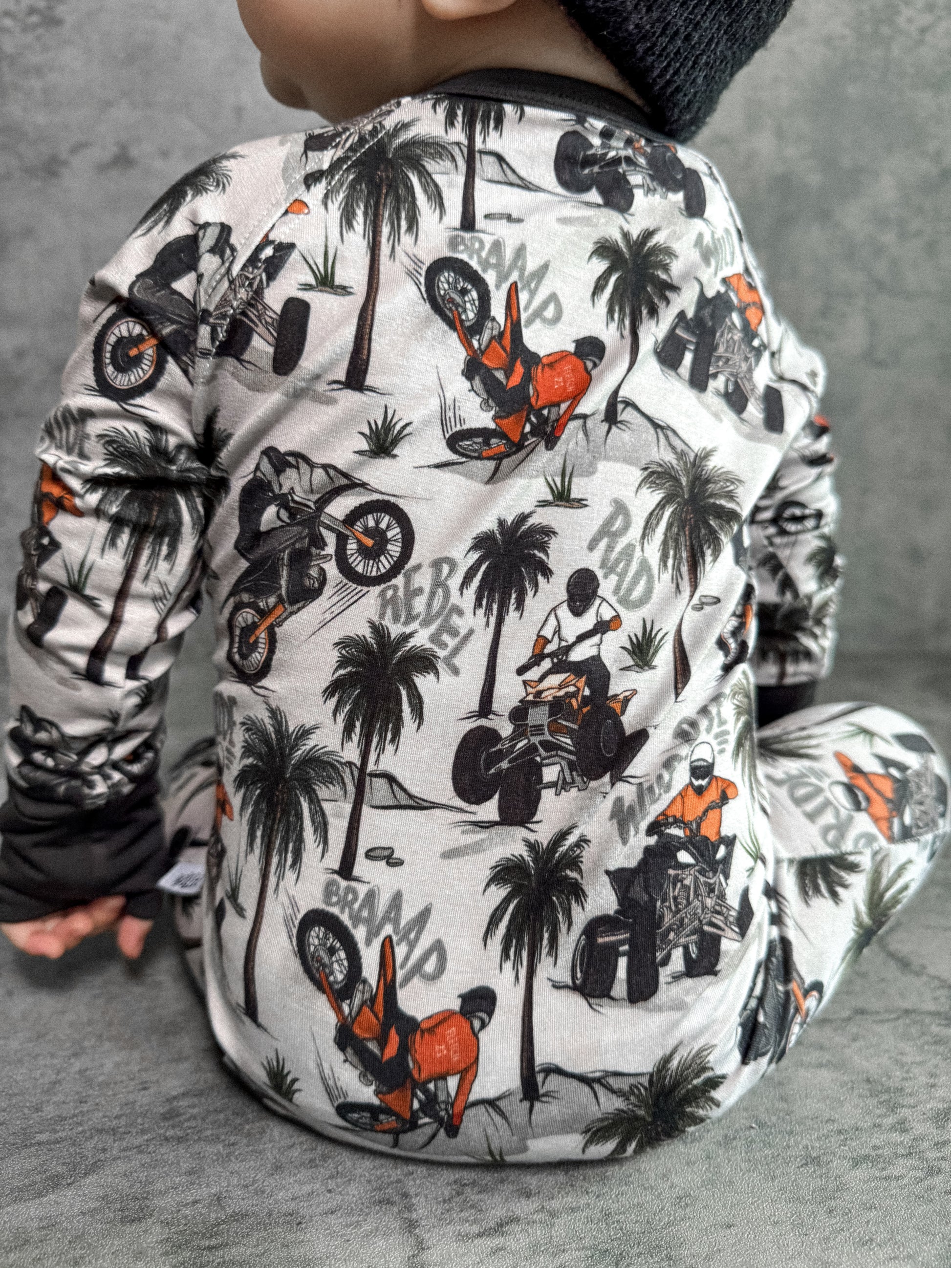 Time to hit the dunes! Rev in "Offroad Rebels" as dirtbikes tear through the desert on ATVs and motorcycles amongst palm trees that create a chill vibe. Riders will catch major air on every jump in this epic motor print. Your kiddo will love these desert vibes - it's all about freedom, adventure, and that rebel attitude. Perfect for little daredevils who crave wide-open spaces, sandy tracks, and the thrill of going totally off road with their dirt bikes. Start your engines dude!