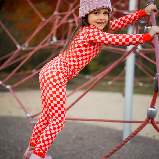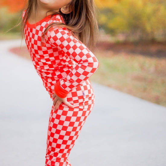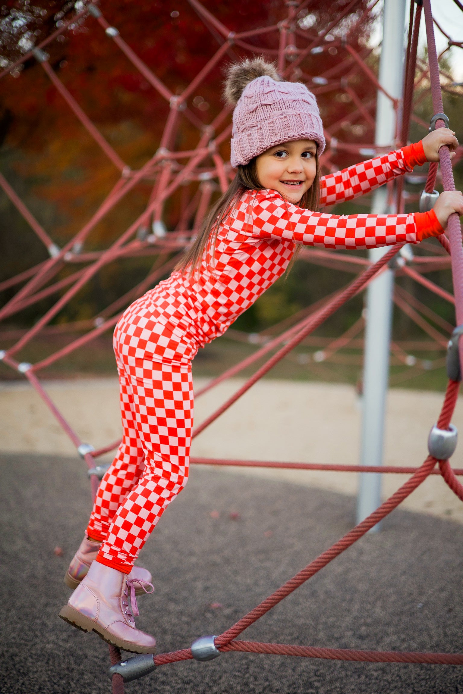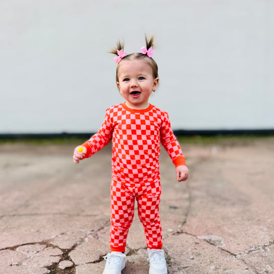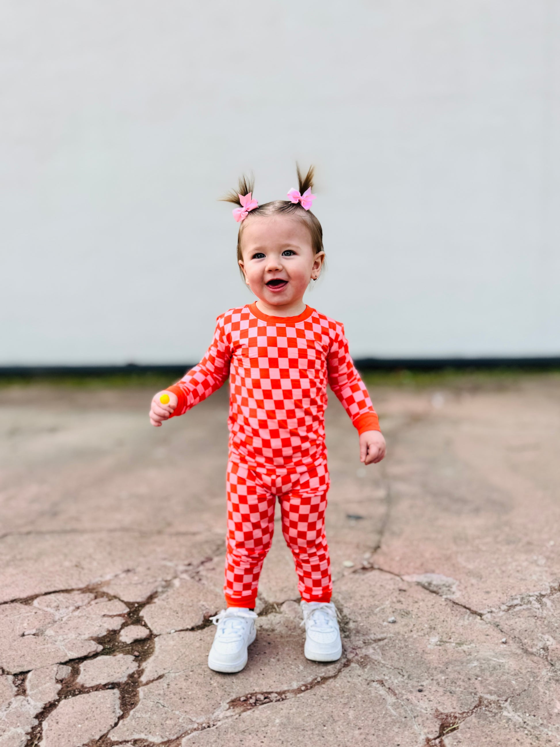 Total throwback vibes with a fresh twist! This bold red and pink checkered print brings serious retro energy that's having a moment. The classic checkerboard pattern rocks that vintage racing flag feel but makes it girly and fun, check! It's giving mod meets cool skater girl - perfect for any trendsetter who loves standing out. This checkers design is all about making a statement, just like your kiddo!
