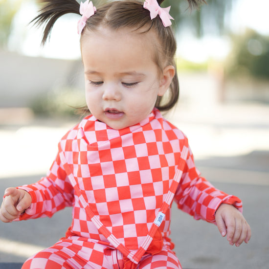 Total throwback vibes with a fresh twist! This bold red and pink checkered print brings serious retro energy that's having a moment. The classic checkerboard pattern rocks that vintage racing flag feel but makes it girly and fun, check! It's giving mod meets cool skater girl - perfect for any trendsetter who loves standing out. This checkers design is all about making a statement, just like your kiddo!