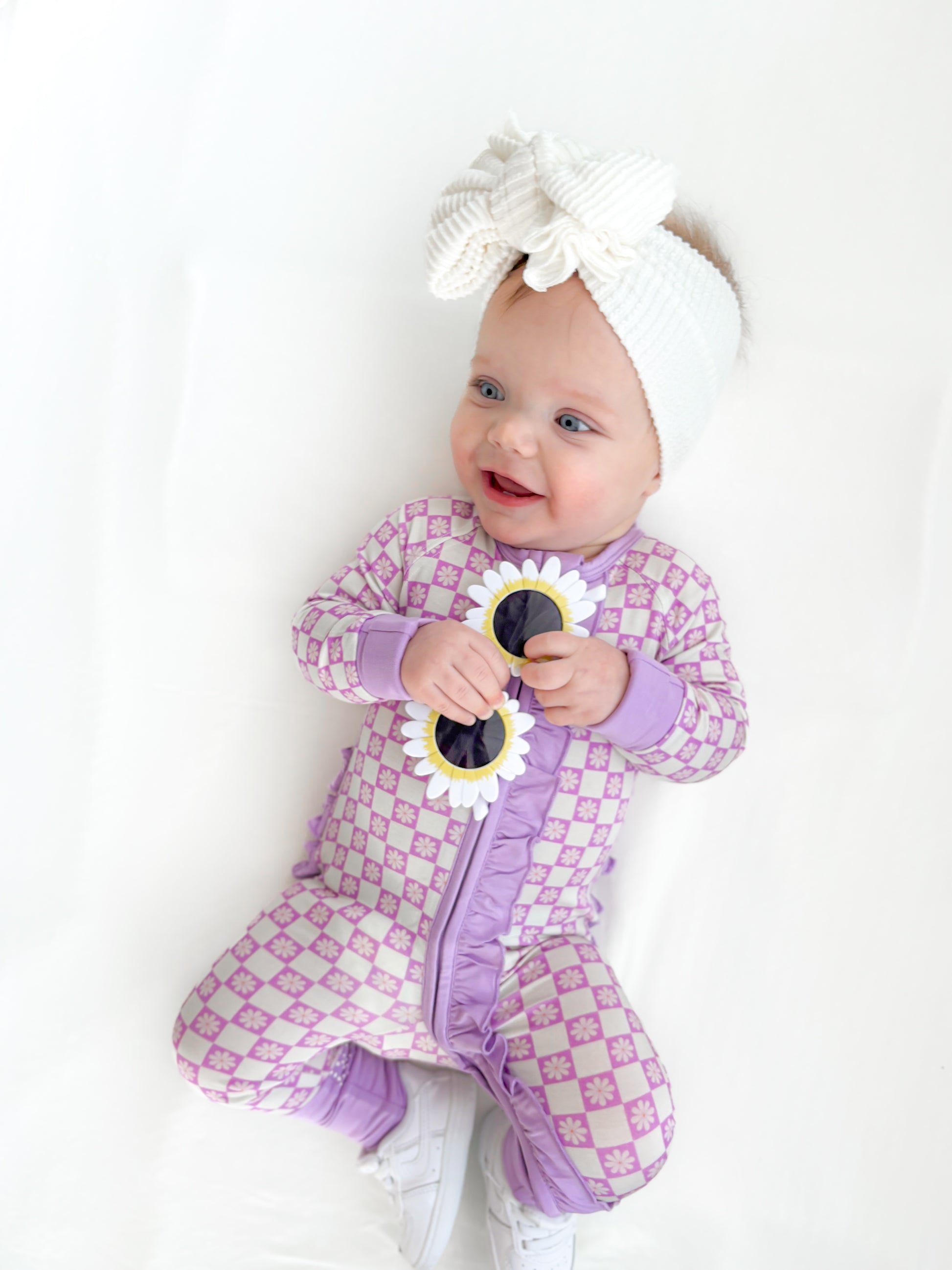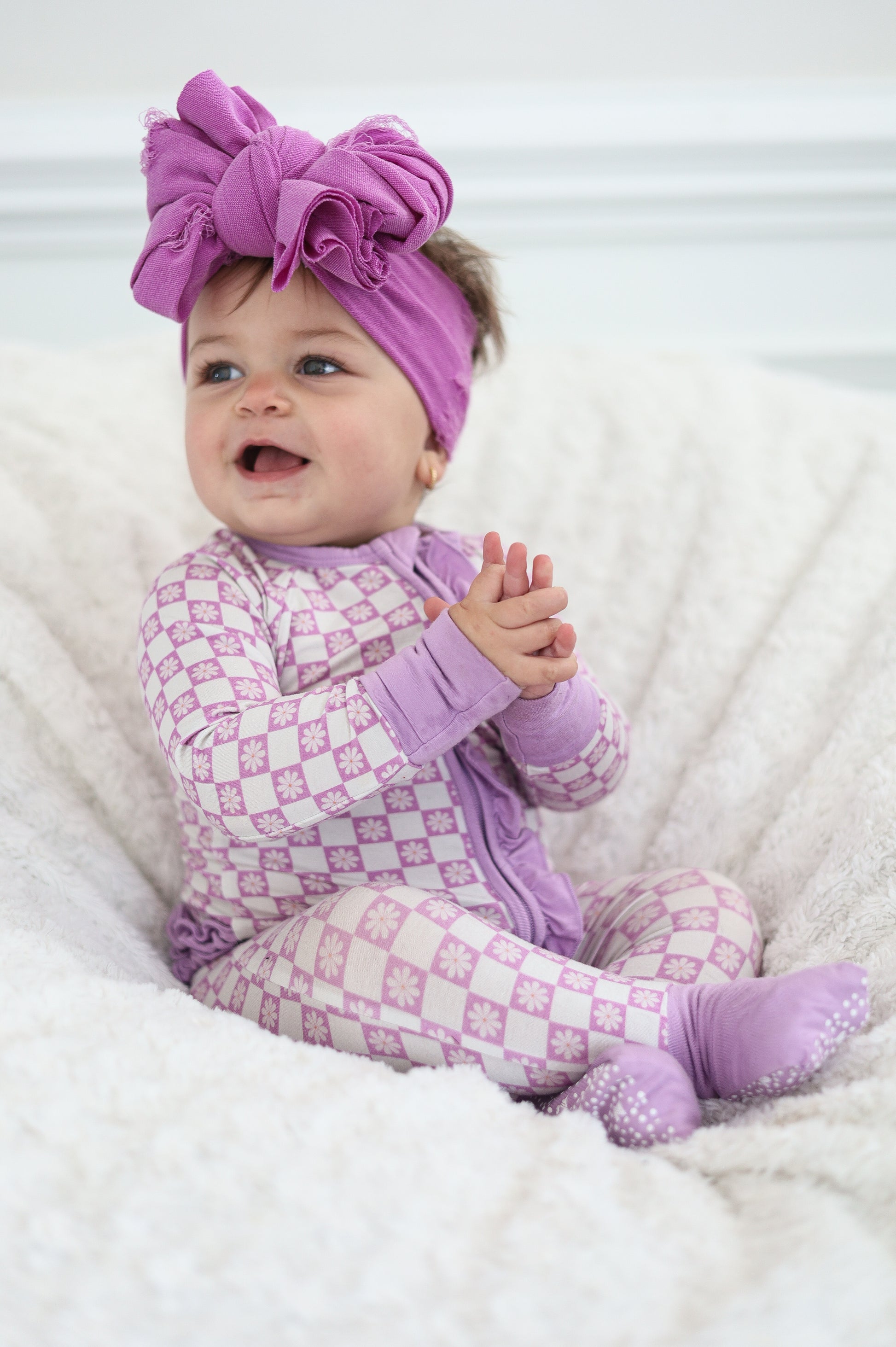 This retro purple & pink print features spring flowers in a checker theme, fitting for your rad flower-power gal that loves vintage vibes. The vibrant and playful color theme makes this print perfect for everyday wear when your babe’s feeling whimsical.