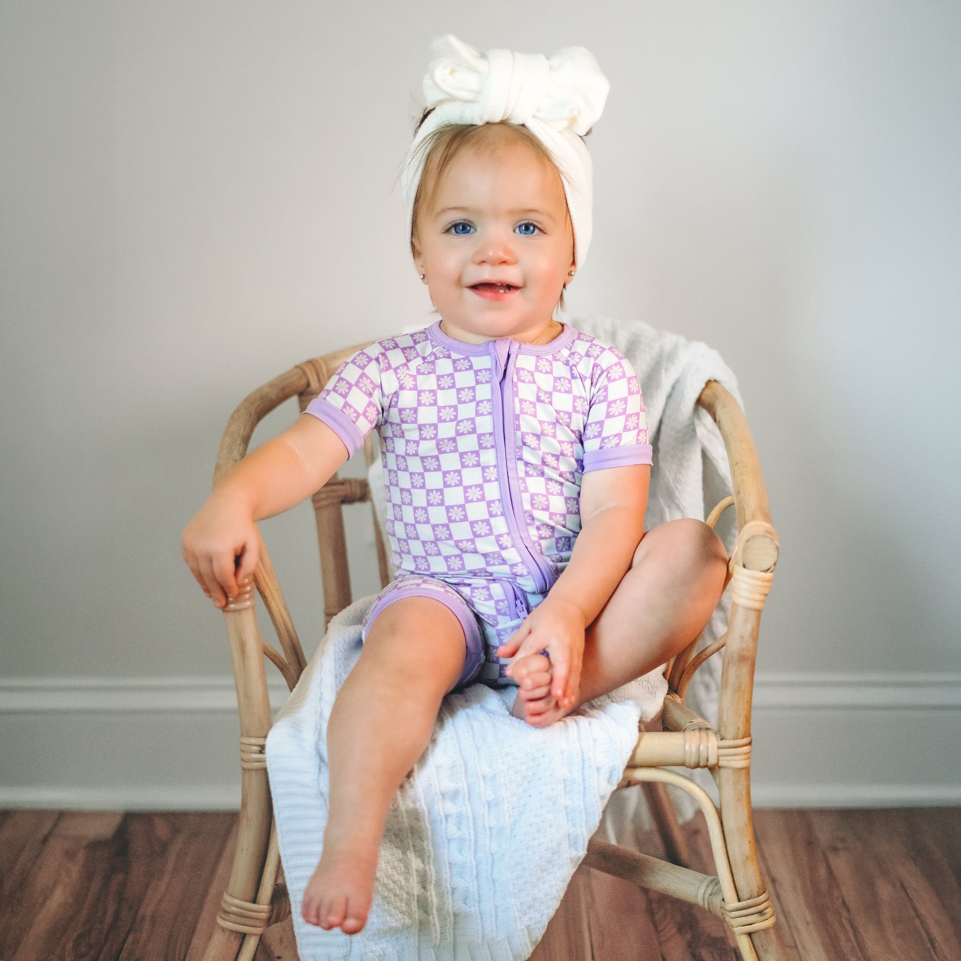 This retro purple & pink print features spring flowers in a checker theme, fitting for your rad flower-power gal that loves vintage vibes. The vibrant and playful color theme makes this print perfect for everyday wear when your babe’s feeling whimsical.
