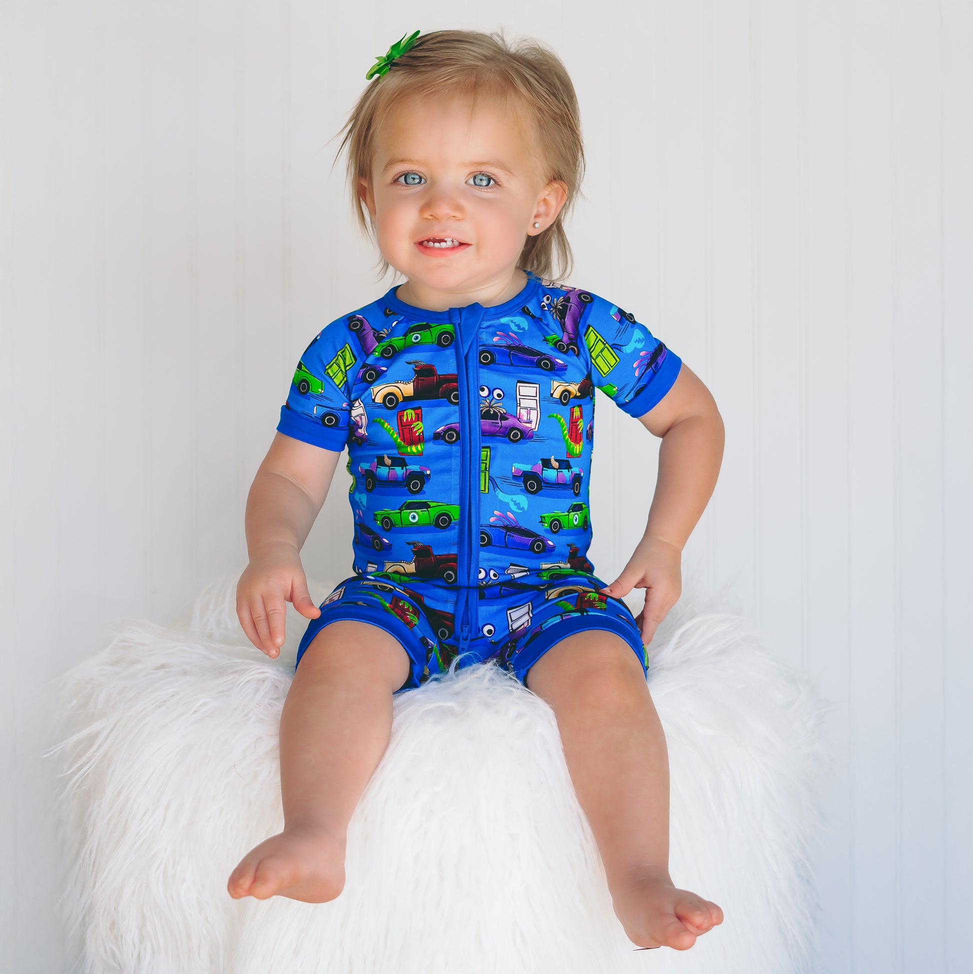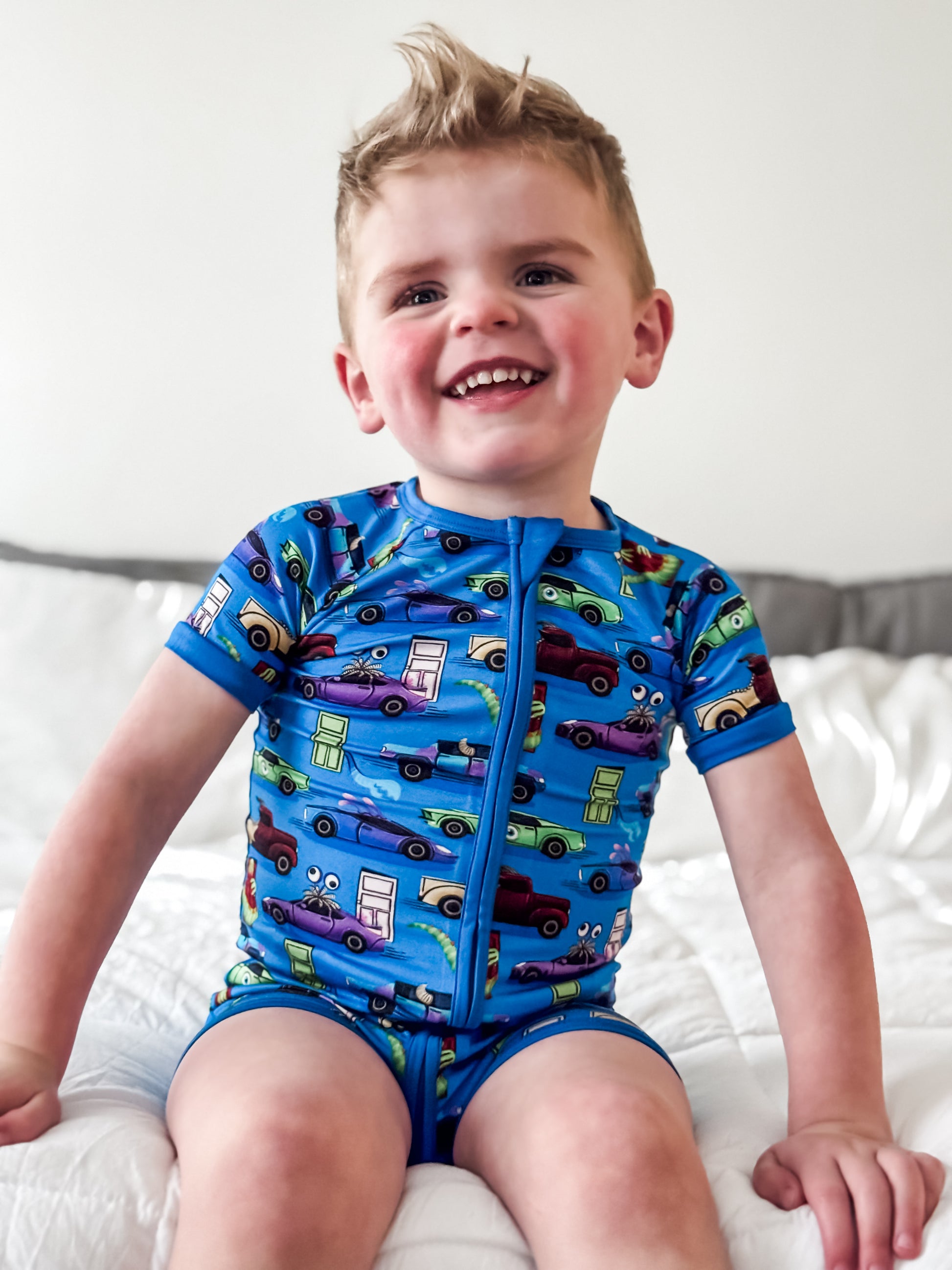 It's Giving Little Monster Energy. Take bedtime adventures to a whole new level with our monster & motors design: “Scaring is Caring”. Featuring sports cars and colorful monster trucks zooming alongside mysterious doors which the friendliest monsters use for their nightly visits! Perfect for little monsters who love things that go vroom in the night.