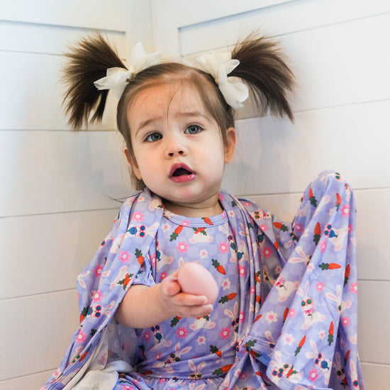 Hoppy Easter girlie bunnies! This totally adorable Easter print hops with the cutest spring bunnies with bows and sunglasses wearing flower crowns and floral accessories. Pink blooms and orange carrots scatter between these precious cotton-tailed cuties ready for the ultimate Easter egg hunt. Each little bunny rocks those big sparkly eyes and floppy ears - total bunny goals! The garden party vibe is on with the flowers throughout this Spring print. Perfect for little rabbits ready to hop into Easter Sunday with serious cuteness and all the spring celebration energy! The perfect Easter basket gift.