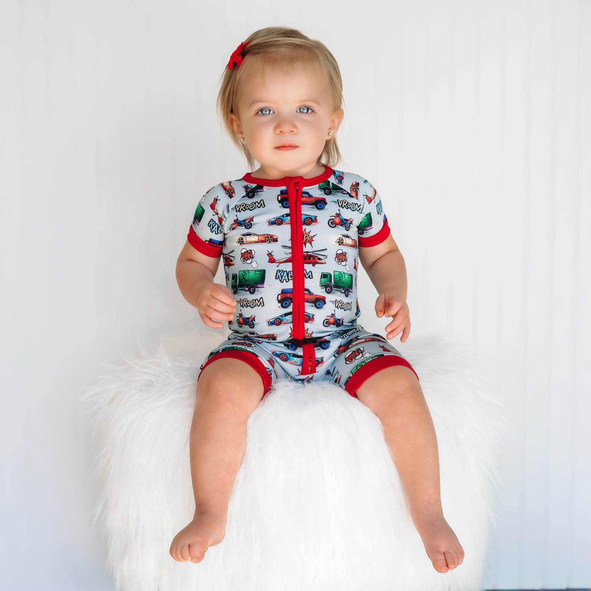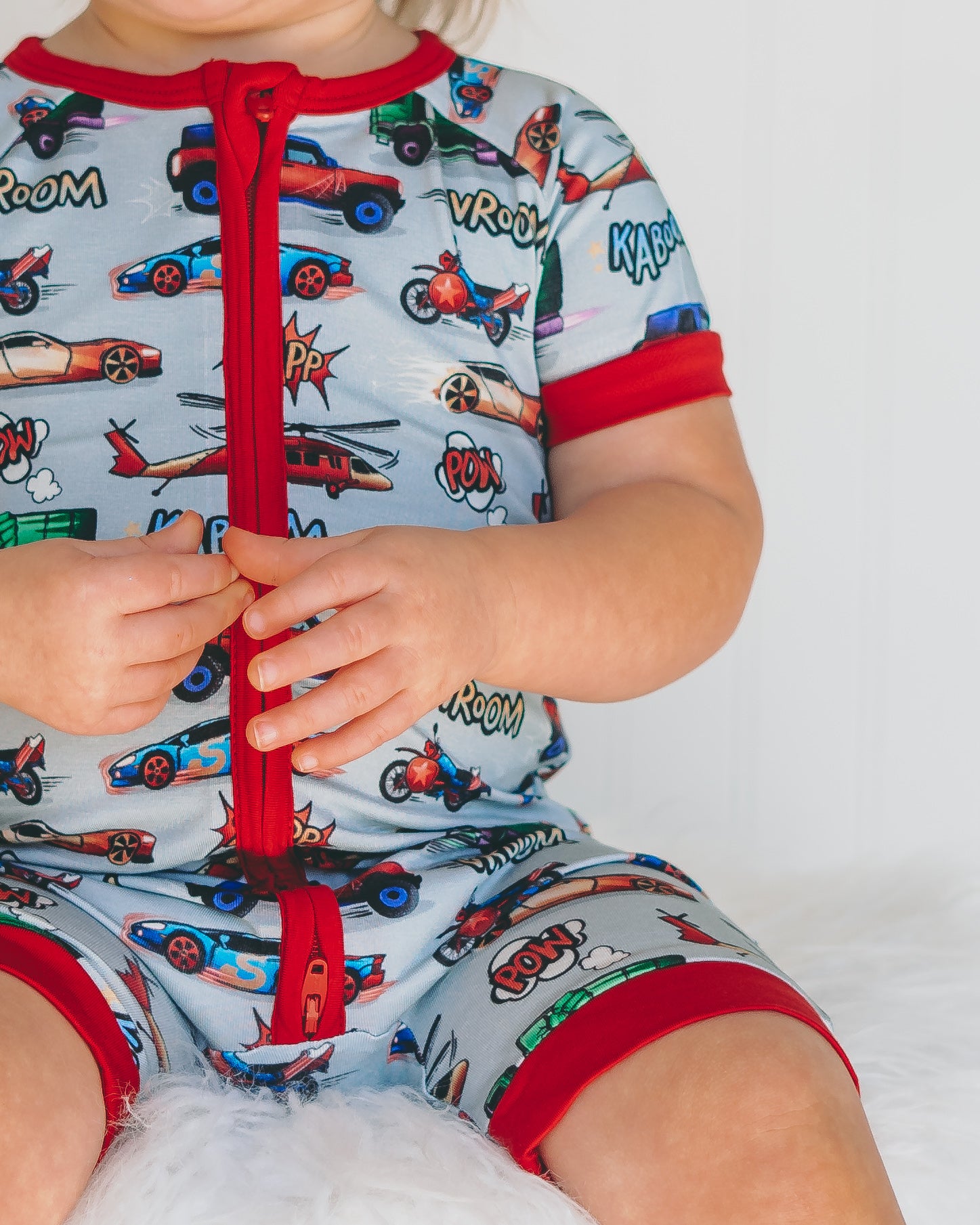 VROOM! ZOOM! Our Superhero Print Supercharged gives your little one Fletch-tastic speed because even the tiniest heroes deserve super-powered style! Get your kiddo ready in a flash with a soon to be favorite print featuring classic comic super heroes and lightning-fast cars, trucks, planes and motorcycles. Warning: these designs may cause dreams of epic speed and victory!